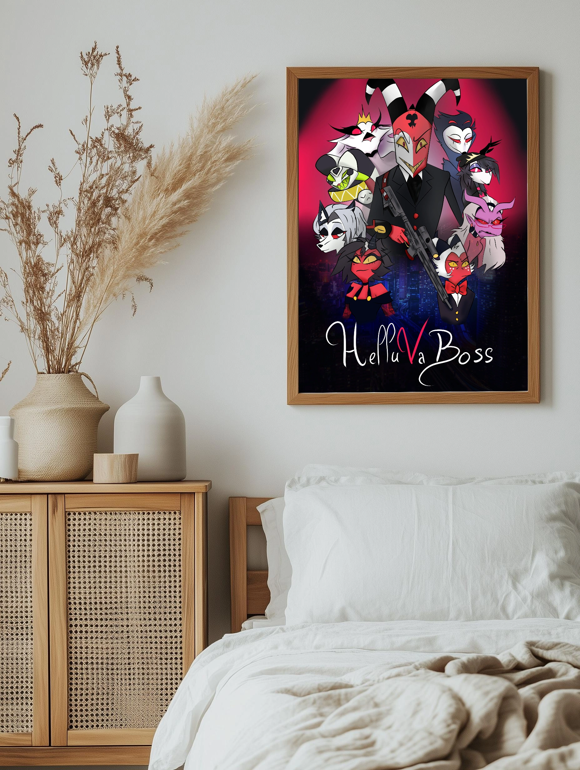 Этот интерьерный постер на холсте посвящён персонажам анимационного сериала Helluva Boss. На плакате изображена группа колоритных демонических героев в современном стиле с выразительными красными и чёрными оттенками, на фоне ночного городского пейзажа. Яркий декоративный плакат идеально подойдёт для любителей уникального и стильного декора стен.