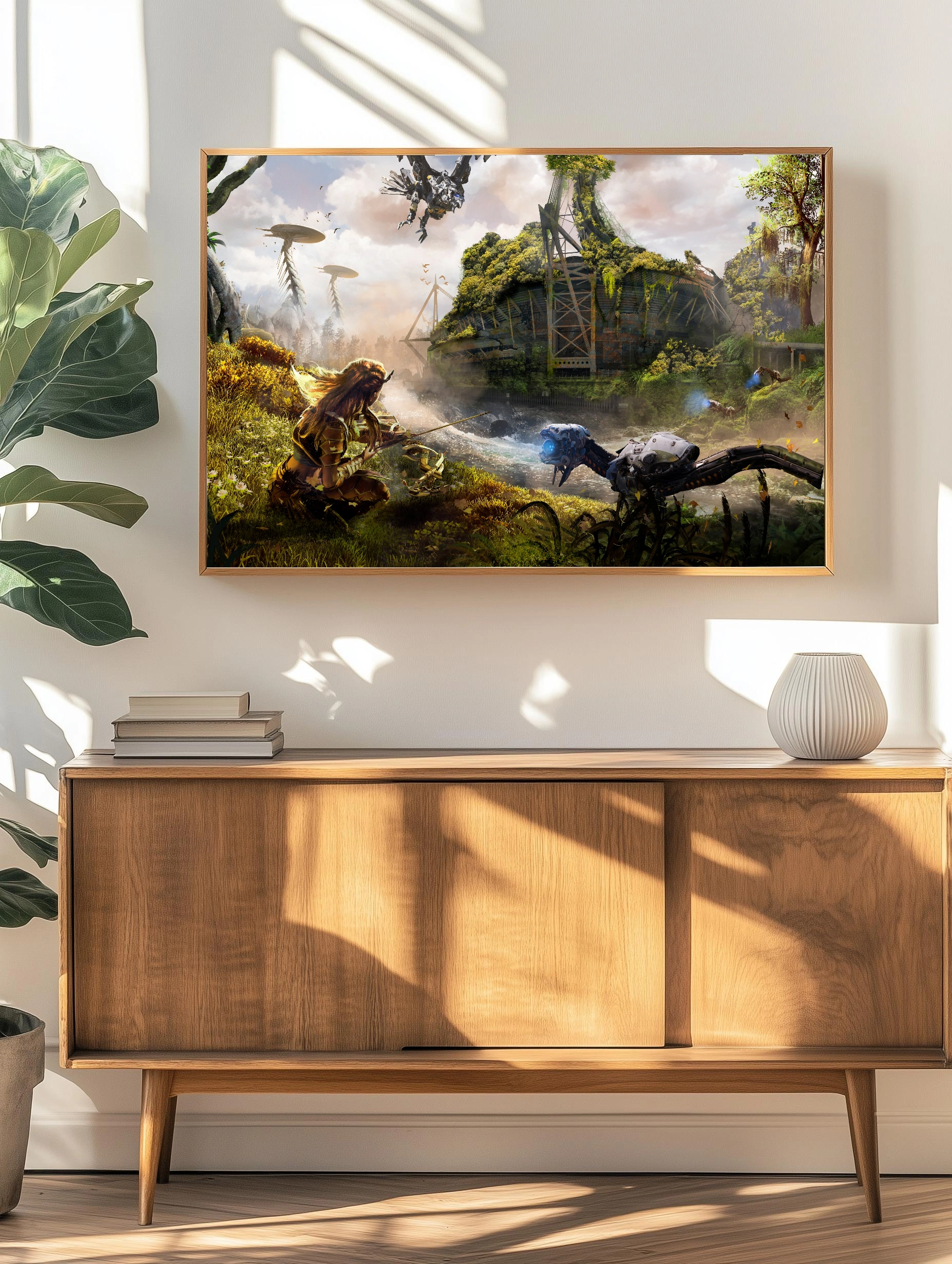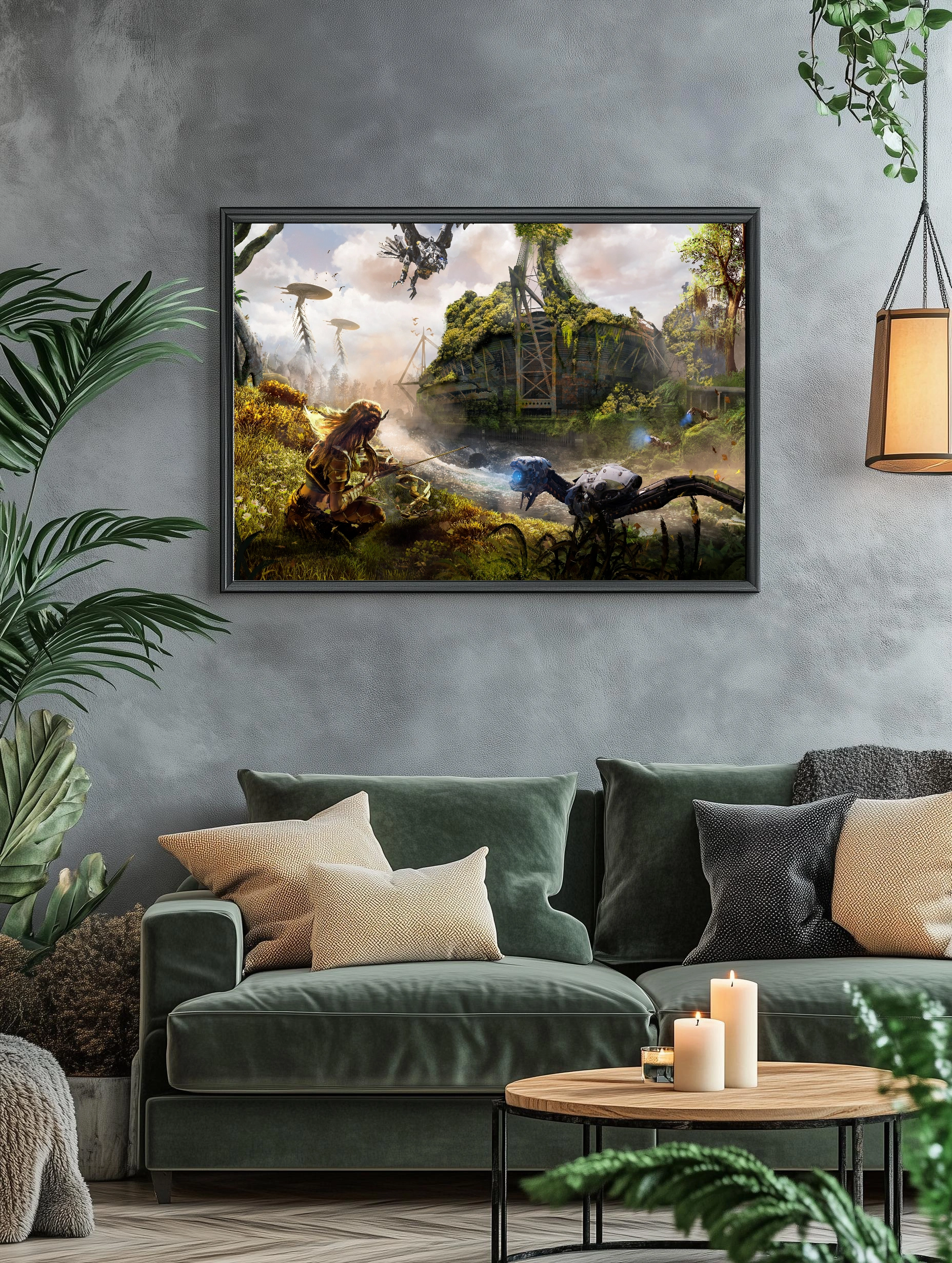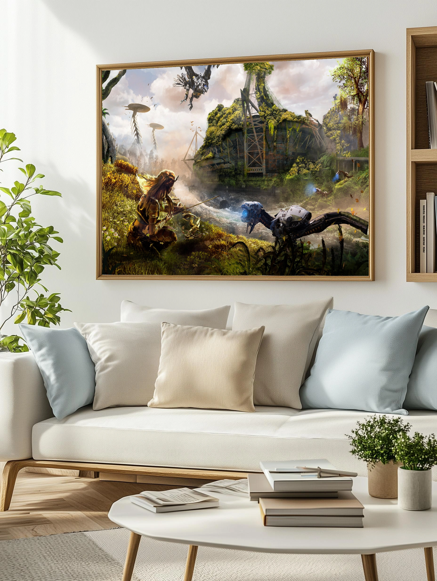 Изображение представляет сцену из знаменитой игры Horizon Zero Dawn, где главная героиня Алоy, одетая в броню, нацеливается из лука на роботизированного врага в окружающей постапокалиптической природе. Картинка наполнена контрастом между природой и механикой, создавая уникальную атмосферу приключения и борьбы. Художественный плакат подходит для интерьера гостиной или офиса, отлично вписываясь в современное искусство для стен и стильный декор.