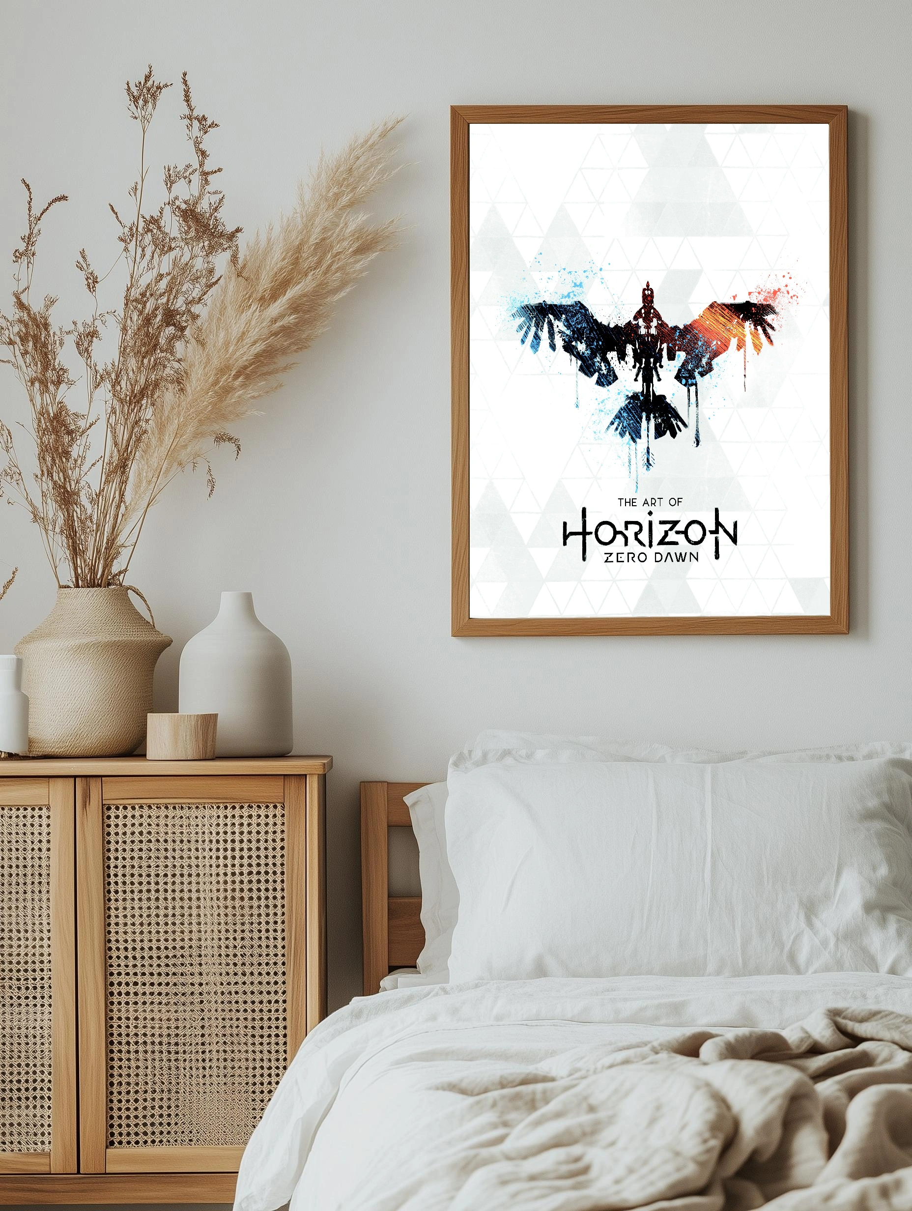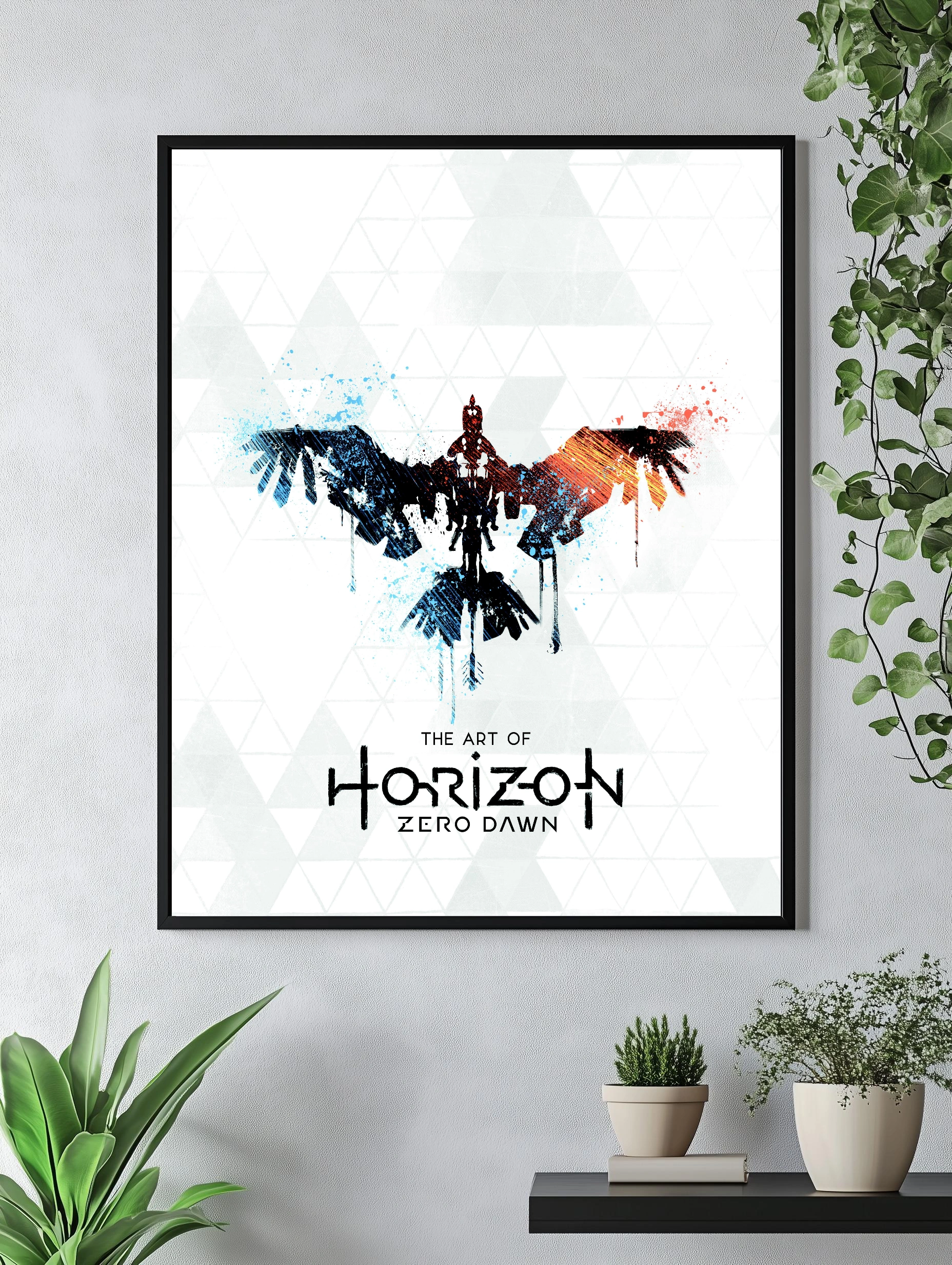 Этот художественный плакат посвящён игре Horizon Zero Dawn, изображая характерный силуэт механического существа в стиле граффити. Чёрные, синие и оранжевые оттенки создают динамичный контраст и современный стиль, идеально подходящий для декоративного оформления стен в интерьере, добавляя уникальный акцент в комнату геймеров и любителей высокотехнологичного искусства.