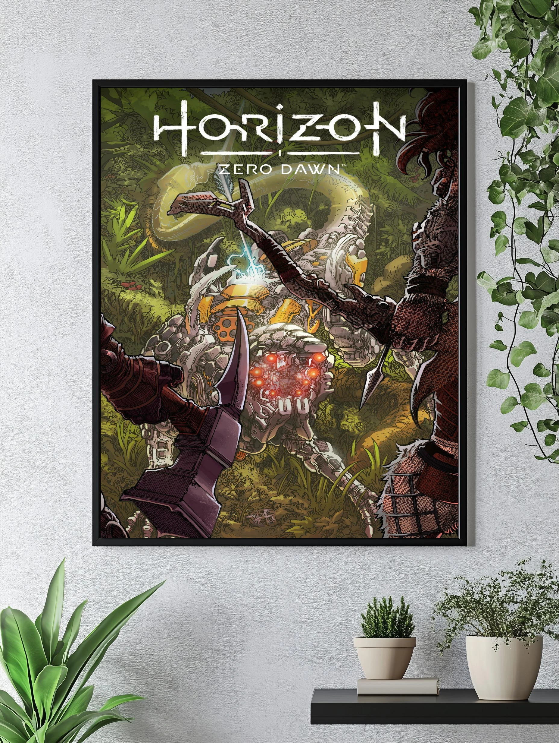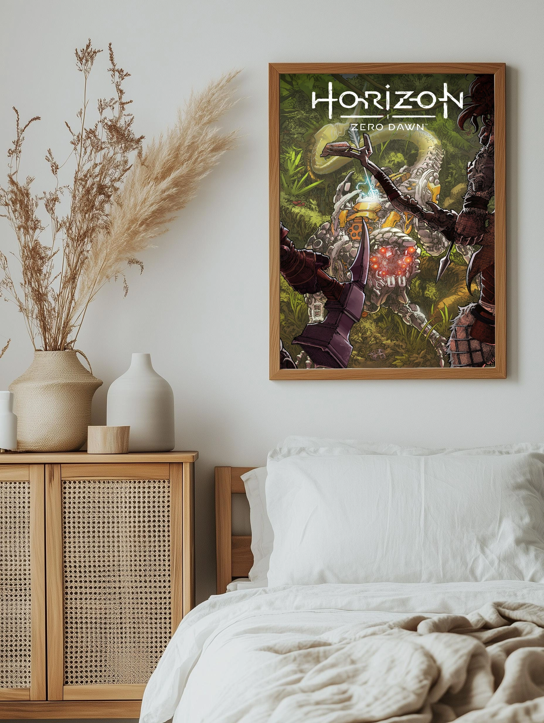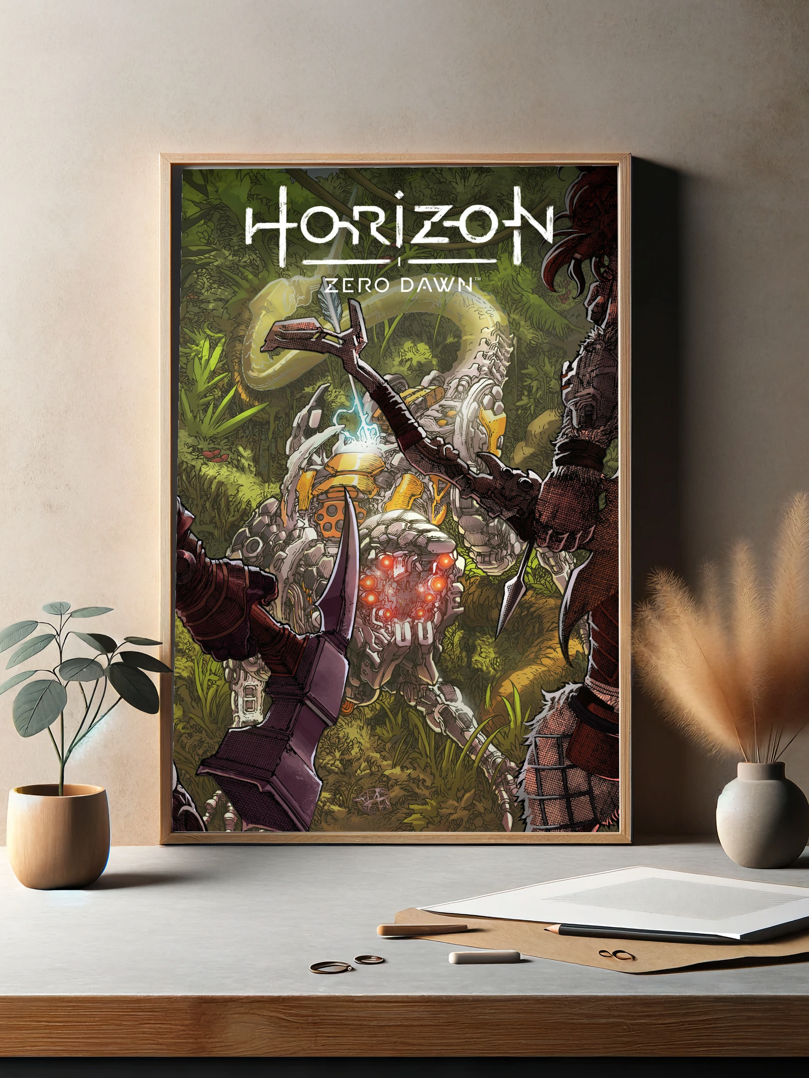 Изображение посвящено игре Horizon Zero Dawn с узнаваемым логотипом на верхушке. На картине показан эпический момент взаимодействия главного героя с механическим существом на фоне плотной зелени джунглей. Драматичный стиль с детальной проработкой техники и природы создаёт уникальный интерьерный арт для стен. Подойдёт для гостиных и офисов тех, кто ценит киберпанк и фэнтези.