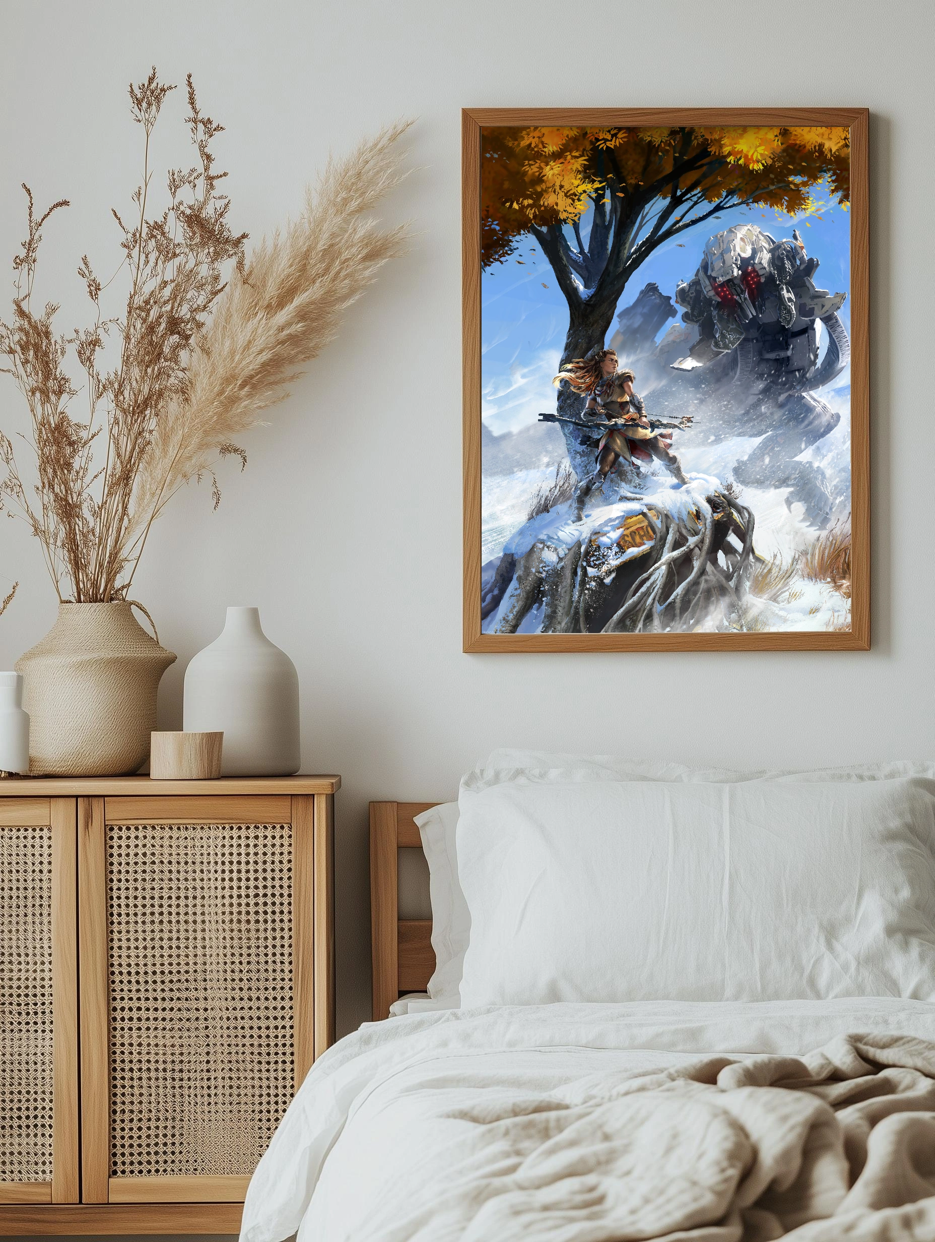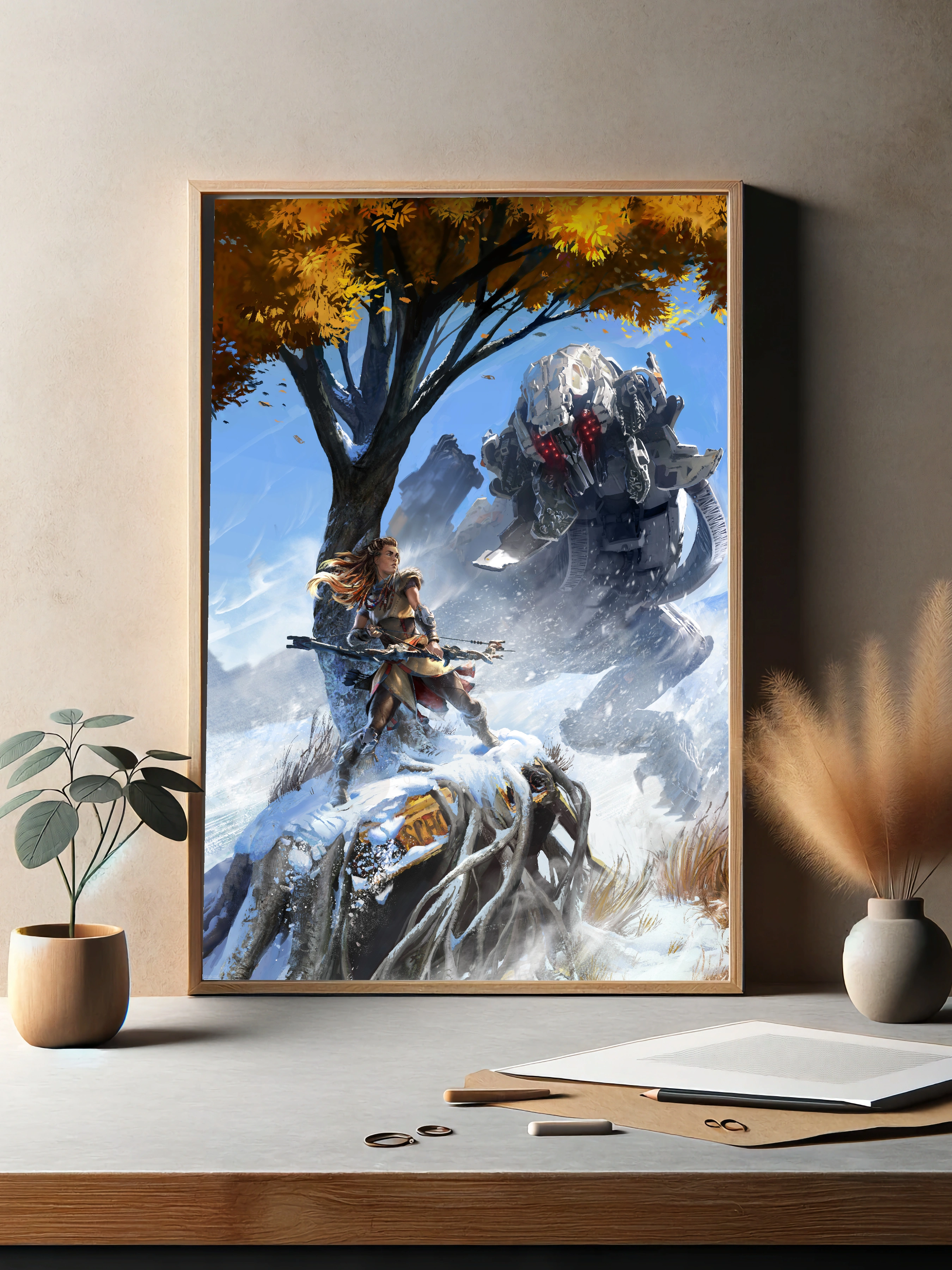 Изображение в динамичном цифровом стиле показывает храбрую охотницу с луком, стоящую у дерева с золотистой листвой на заснеженной земле. Перед ней огромный механоид с красными светящимися глазами, создающий напряжение и драматизм. Постапокалиптический пейзаж с элементами природы и современного искусства для стен, отлично подойдет как интерьерный декоративный плакат для гостиной или офиса.