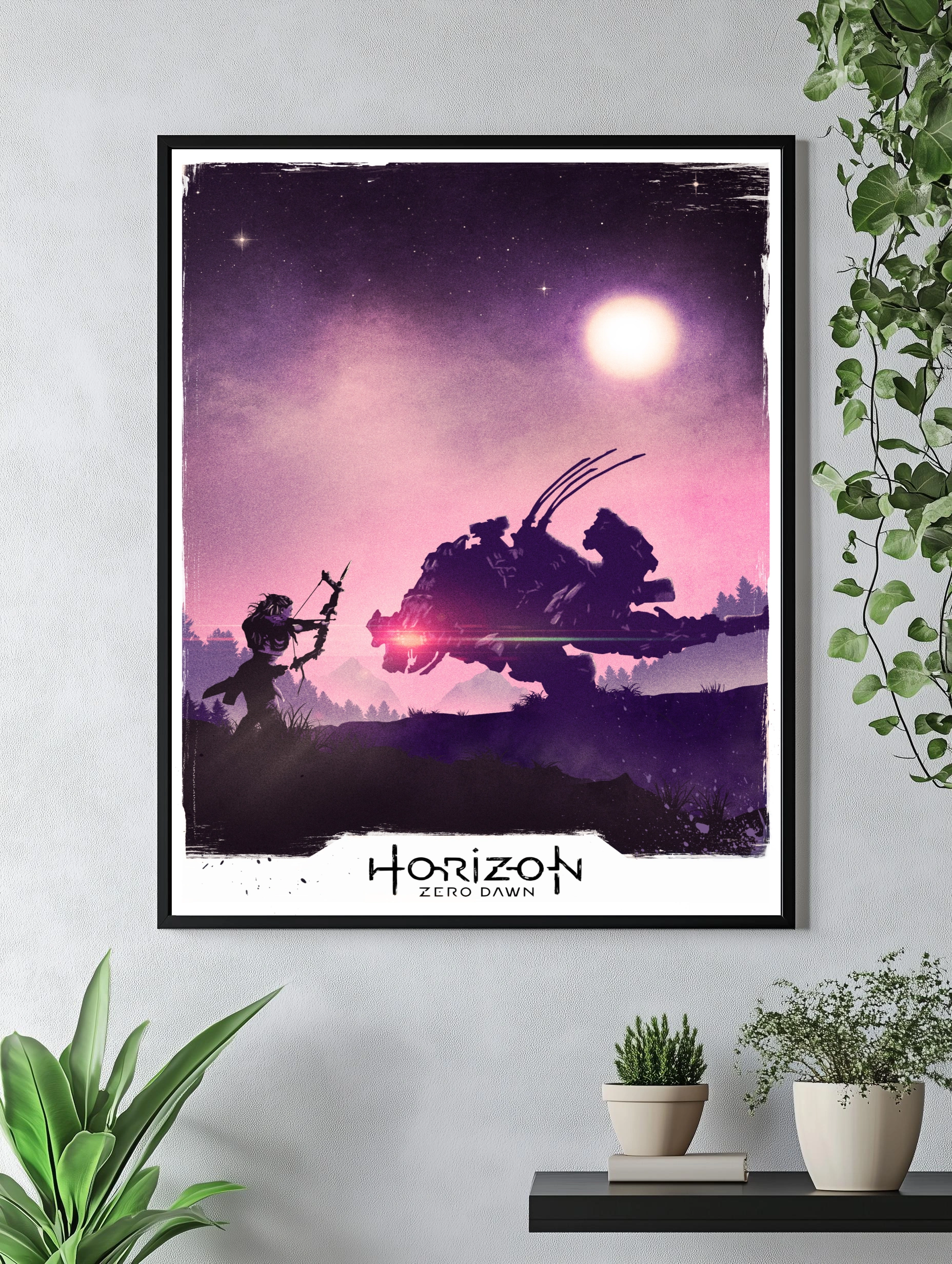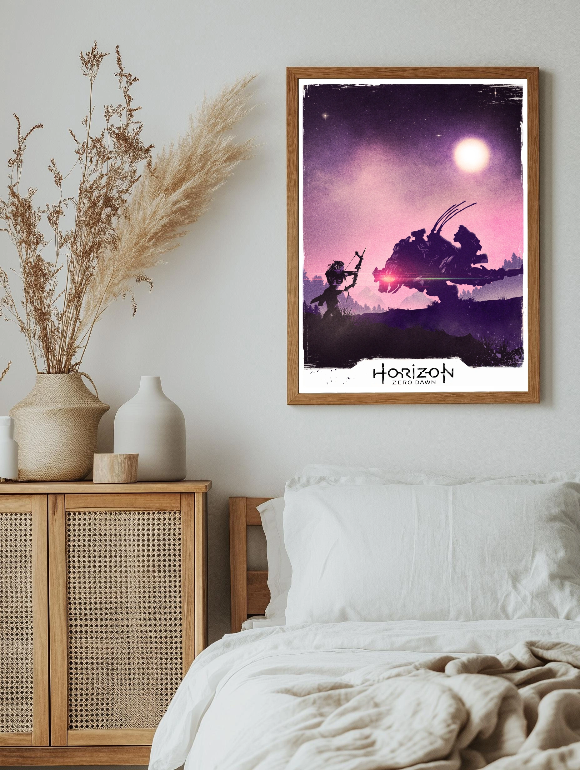 Изображение выполнено в стиле постапокалиптического фэнтези с ярким акцентом на противостоянии главной героини Элой и гигантской механической тварью. Пейзаж изображён в приглушённых фиолетовых, розовых и черных тонах, создавая загадочное и напряжённое настроение. Это интерьерное искусство современного типа подходит для гостиной или офиса, подчеркивая уникальность и динамичность сюжета Horizon Zero Dawn.