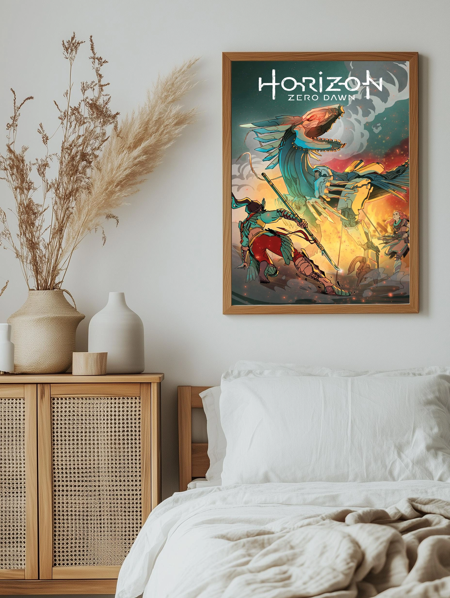 Яркая картина с сюжетом из игры Horizon Zero Dawn, где изображена динамичная сцена охоты на механического динозавра. Стиль иллюстрации современный, комиксный, с акцентом на детали персонажей и техники. Большое внимание уделено энергетике сражения и контрасту тёплых и холодных оттенков. Отличный интерьерный постер для любителей видеоигр и футуристического искусства.
