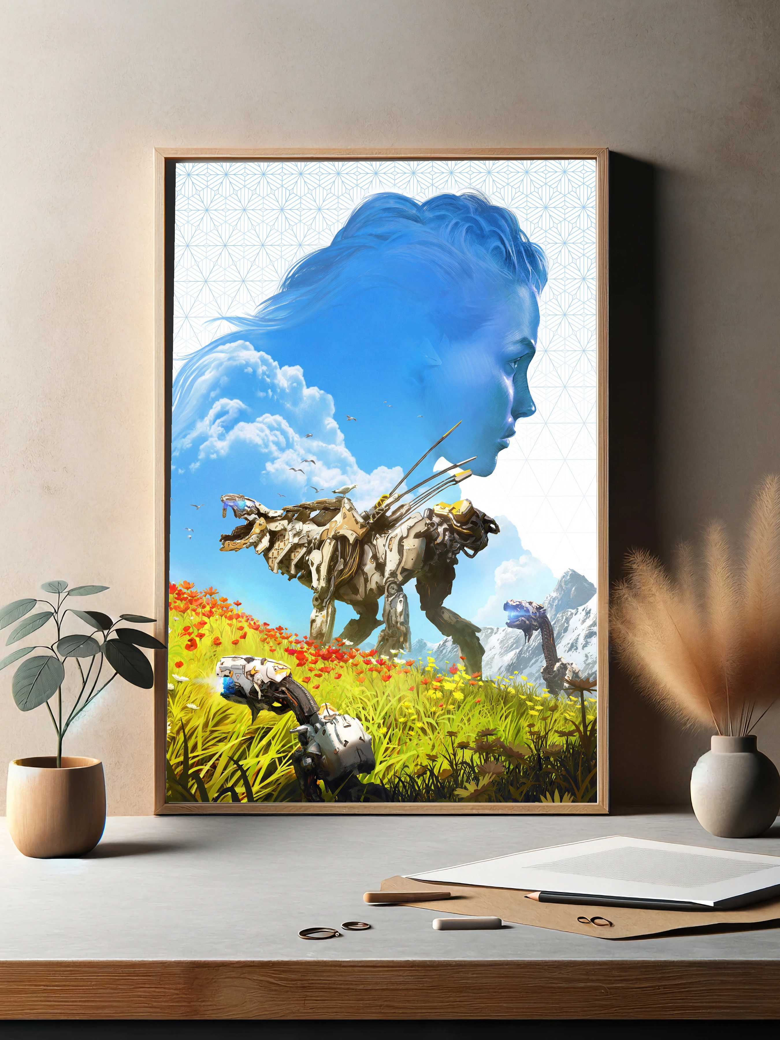 Изображение представляет собой интерьерное искусство с героиней Алоy из игры Horizon Zero Dawn. На фоне голубого неба с облаками видна огромная механическая звероподобная машина на цветущем лугу. Элементы природы гармонично сочетаются с технологическими деталями, создавая баланс между экологией и футуризмом. Картина для спальни или гостиной с уникальным дизайном и стильным декором стен.