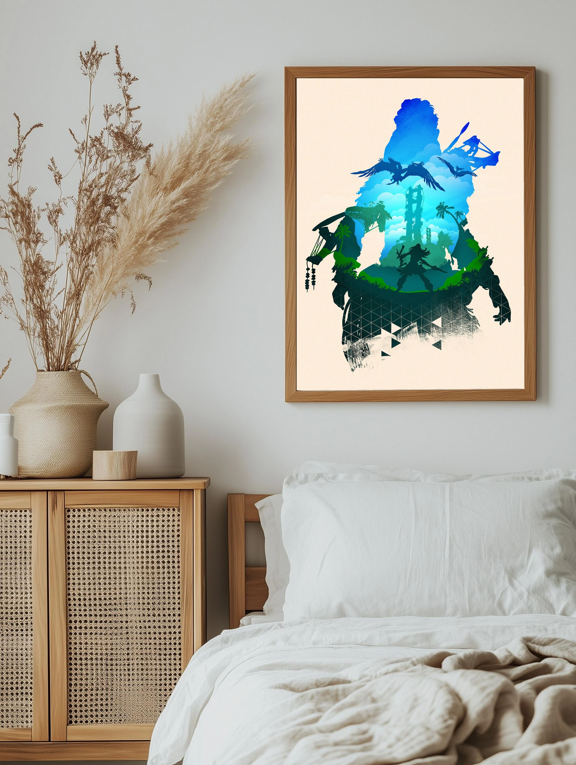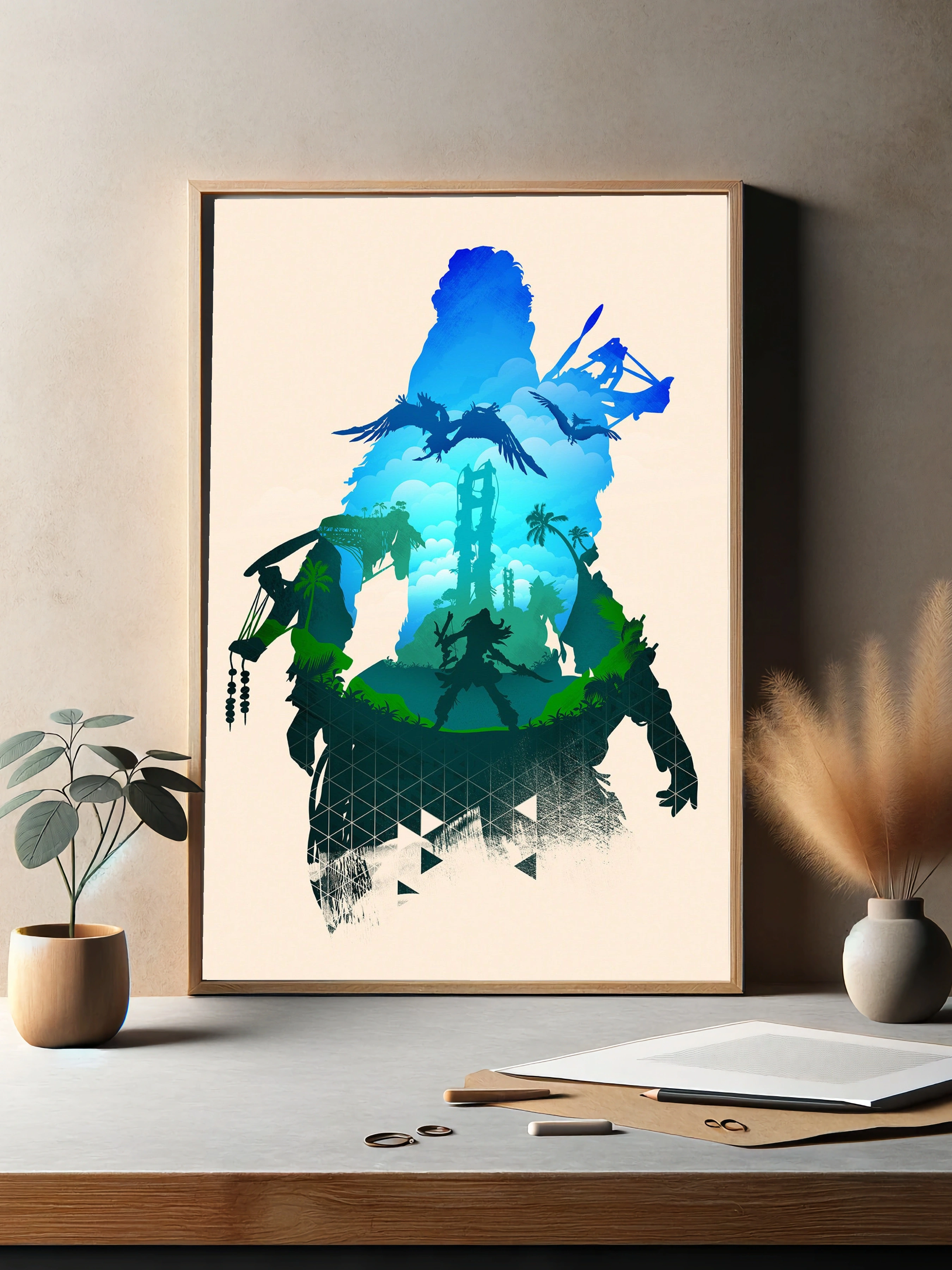 Интерьерное искусство в ярких тонах синего и зеленого, изображающее силуэт героя игры Horizon с элементами природы и технологий. На фоне динамичные облака, птицы, а также техника и древние руины, создающие атмосферу эпического приключения. Уникальный декоративный плакат идеально подходит для стены в гостиной или офисе.