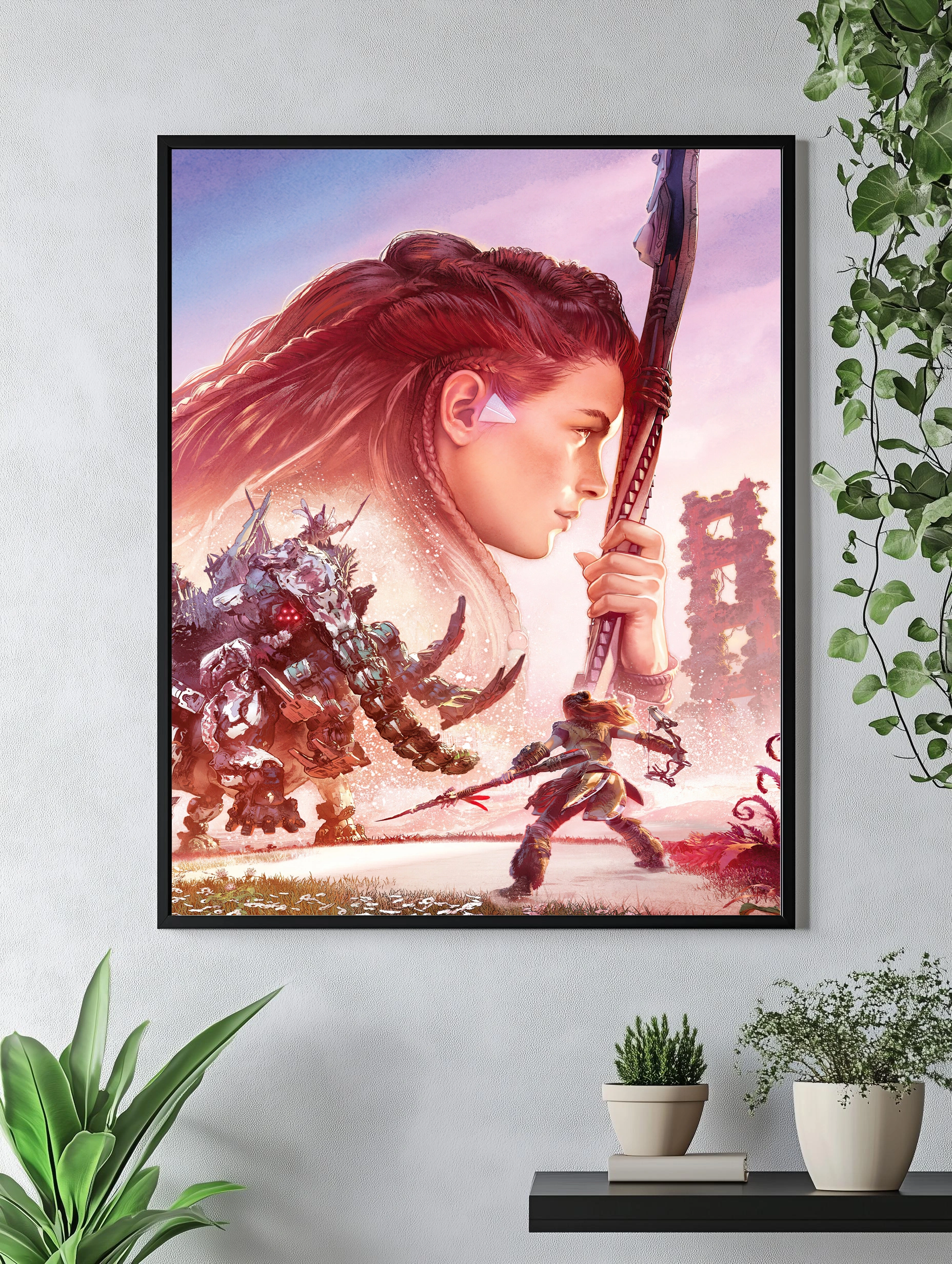 Яркое и динамичное изображение с персонажем Алоy из игры Horizon Zero Dawn, которая готовится к битве с гигантской боевой машиной. Постапокалиптический пейзаж с руинами и футуристическими элементами создаёт атмосферу эпического приключения. Отличный интерьерный постер для поклонников игры и современного искусства.