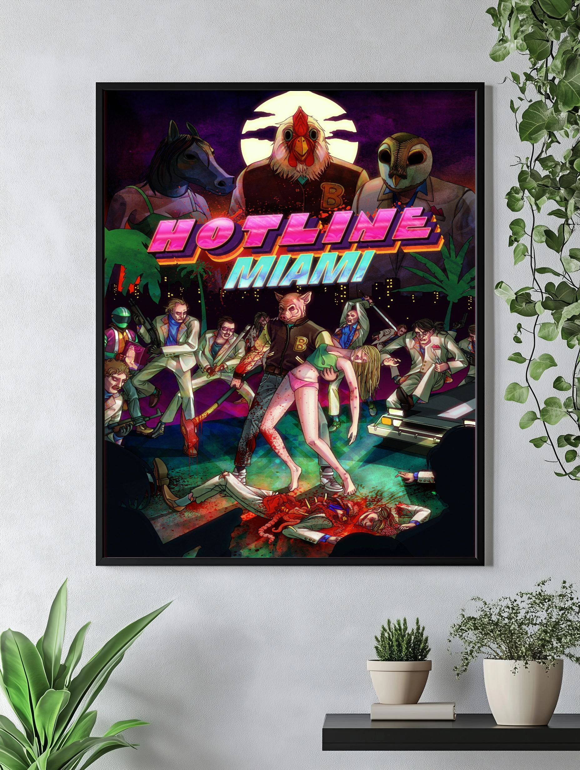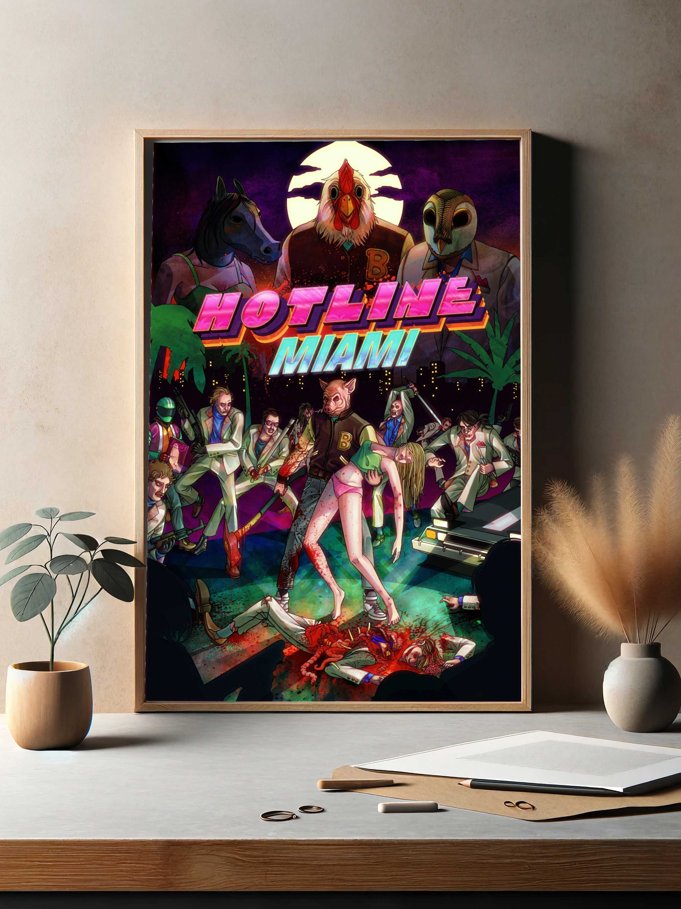 Декоративный плакат, вдохновленный знаменитой игрой Hotline Miami, выполнен в ярком неоновом стиле 80-х с изображением антропоморфных персонажей в масках и сцены криминальных разборок. Картина для гостиной или офиса с уникальным дизайном, отражающим атмосферу ночного Майами, городской неон и динамичный сюжет с насилием и напряжением. Стильный интерьерный плакат для любителей ретро и экшена.