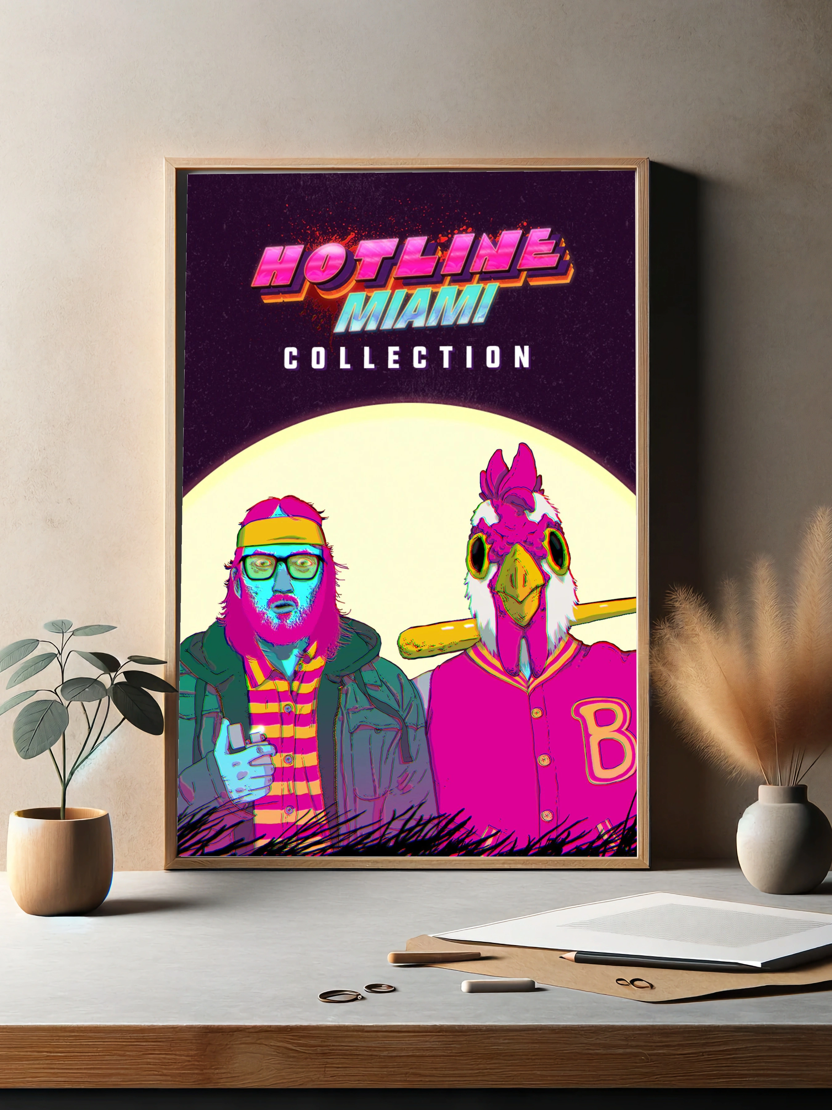 Яркий и стильный интерьерный арт с героями Hotline Miami — культовой видеоигры. Постер изображает двух персонажей на фоне большого желтого круга, напоминающего луну или свет прожектора. Используются насыщенные цвета и неоновый стиль, что отлично подходит для современного искусства для стен, декоративного плаката и стильного декора дома или офиса.