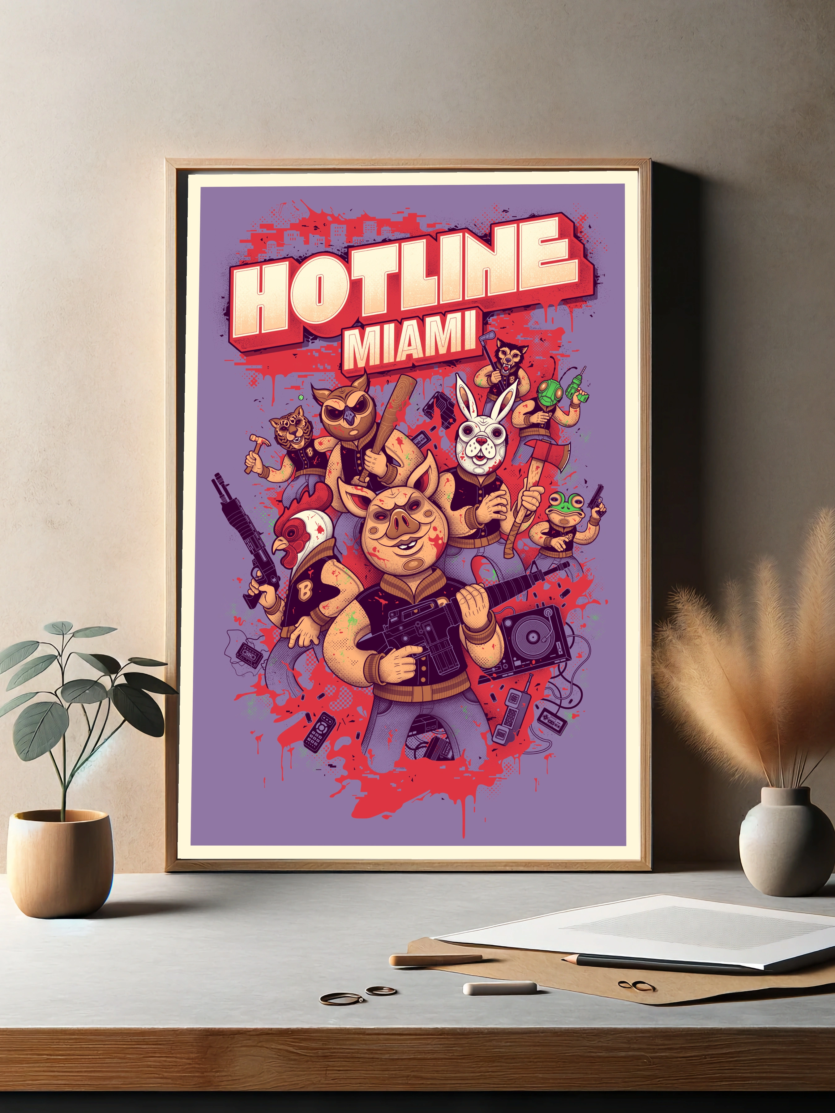 Изображение представляет собой яркую художественную картину для гостиной или офиса, вдохновлённую видеоигрой Hotline Miami. На композиции изображены персонажи с масками животных в стилизованном ретро-стиле, держащие оружие и музыкальные инструменты, на фоне красочного пятнистого фона с насыщенными оттенками. Этот интерьерный арт с насыщенной палитрой красного, бежевого и фиолетового цветов идеально подходит для современного декора стен и создаёт динамичную атмосферу.