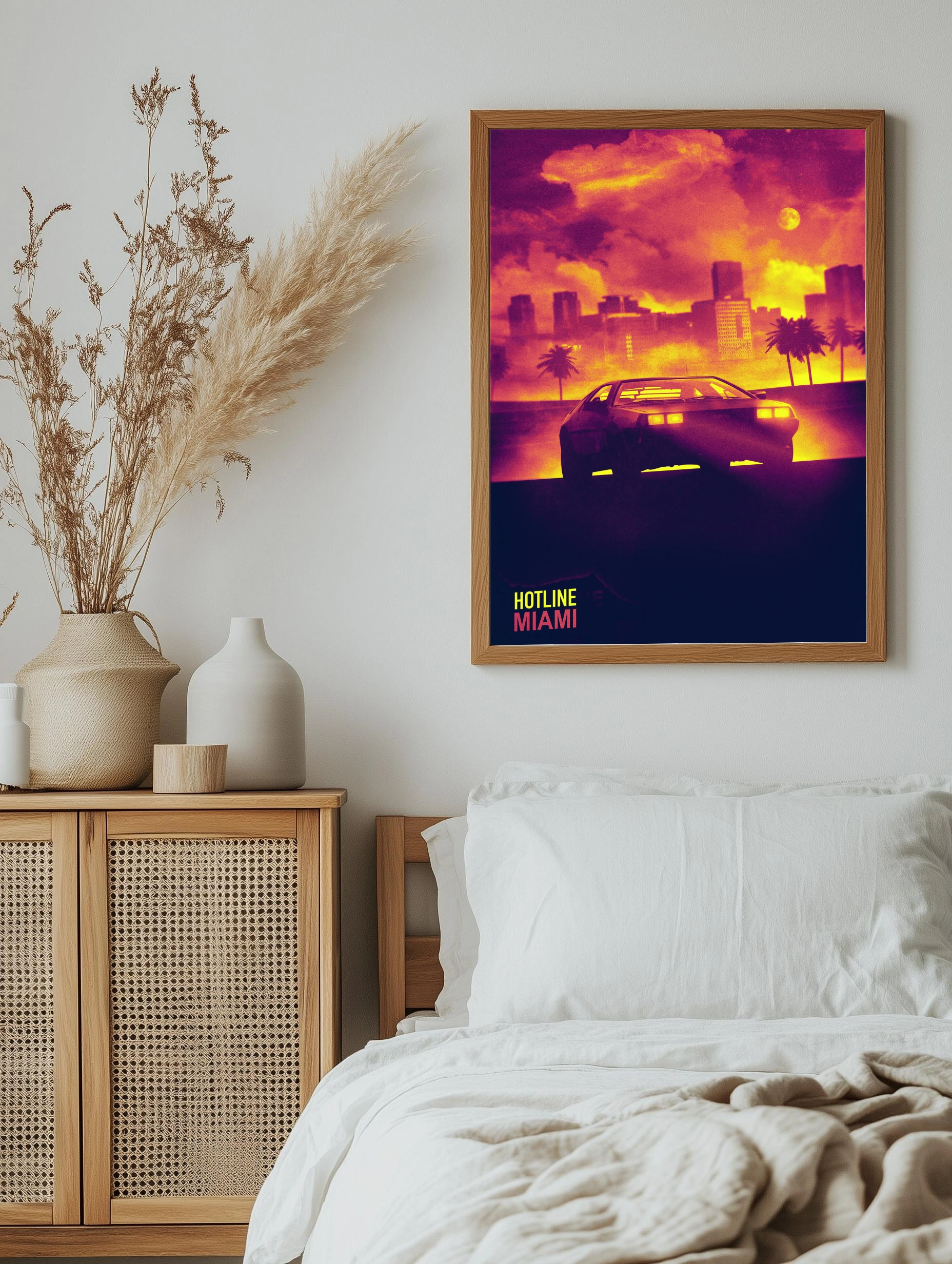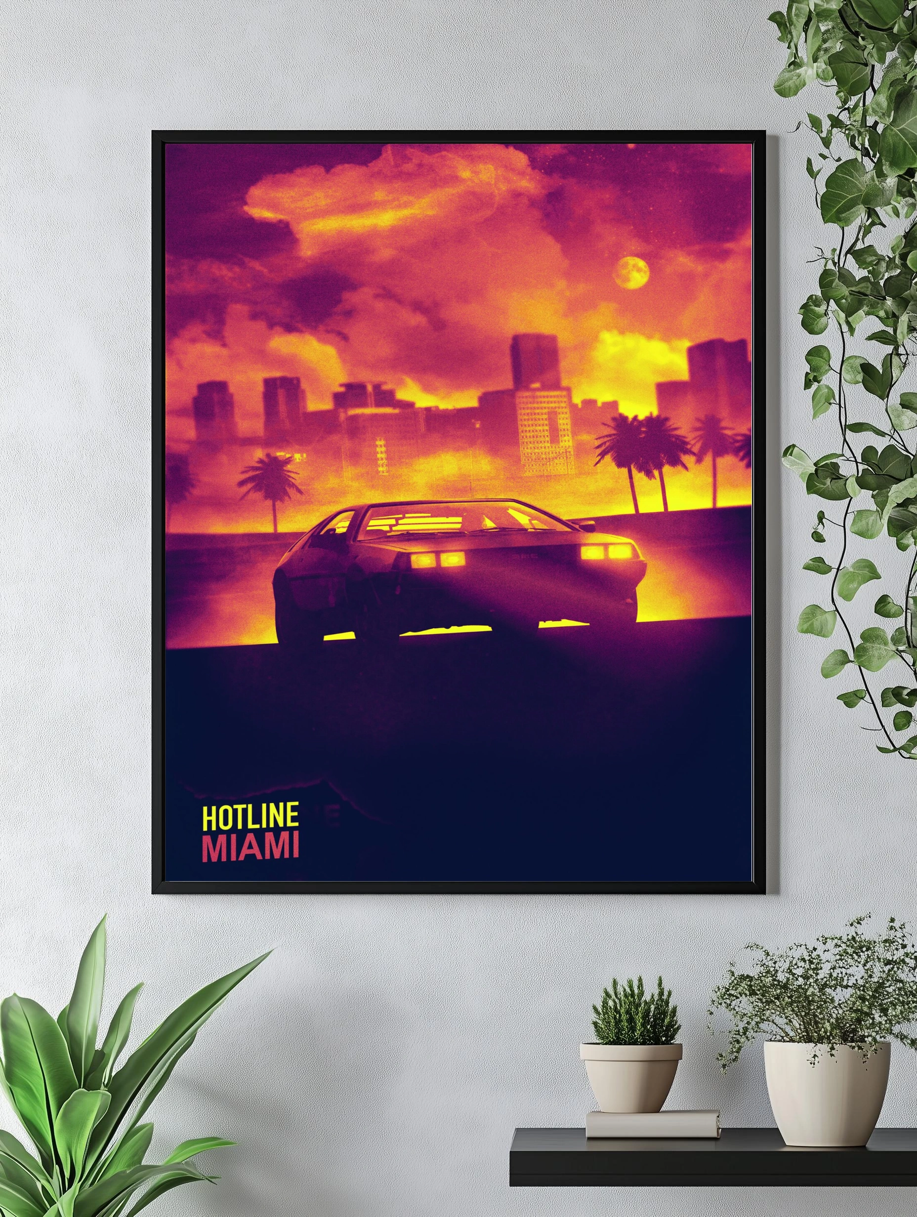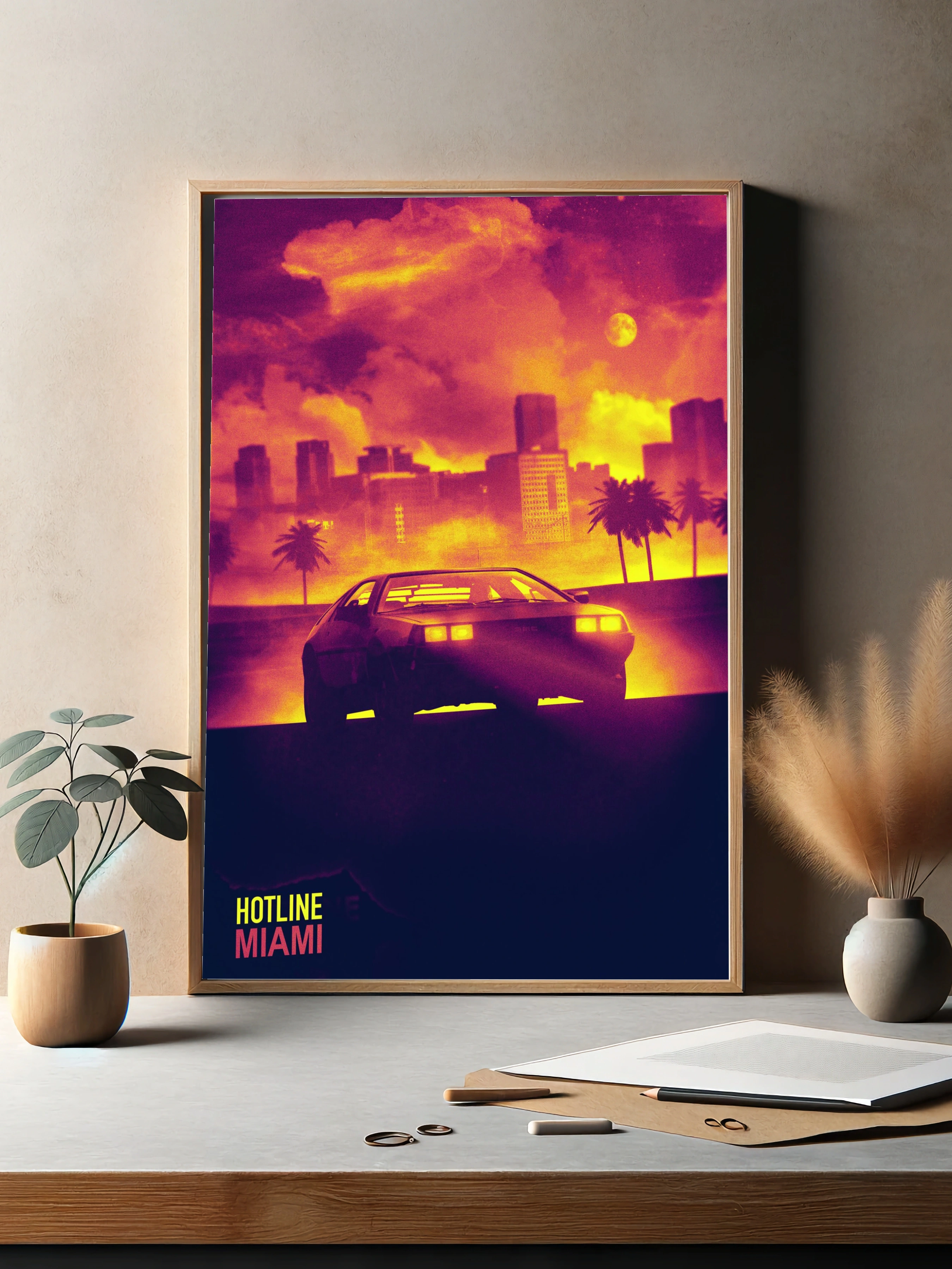 Яркое изображение в стиле ретро с атмосферой неонового ночного Майами. На переднем плане силуэт спортивного автомобиля с подсвеченными фарами, на фоне — туманная панорама города с силуэтами небоскрёбов и пальмами. Горизонт окрашен в насыщенные жёлтые, оранжевые и пурпурные тона, создавая эффект заката и погружая в настроение динамичного вечернего мегаполиса. Идеально подходит как интерьерное искусство для современного декора в гостиной или офисе.