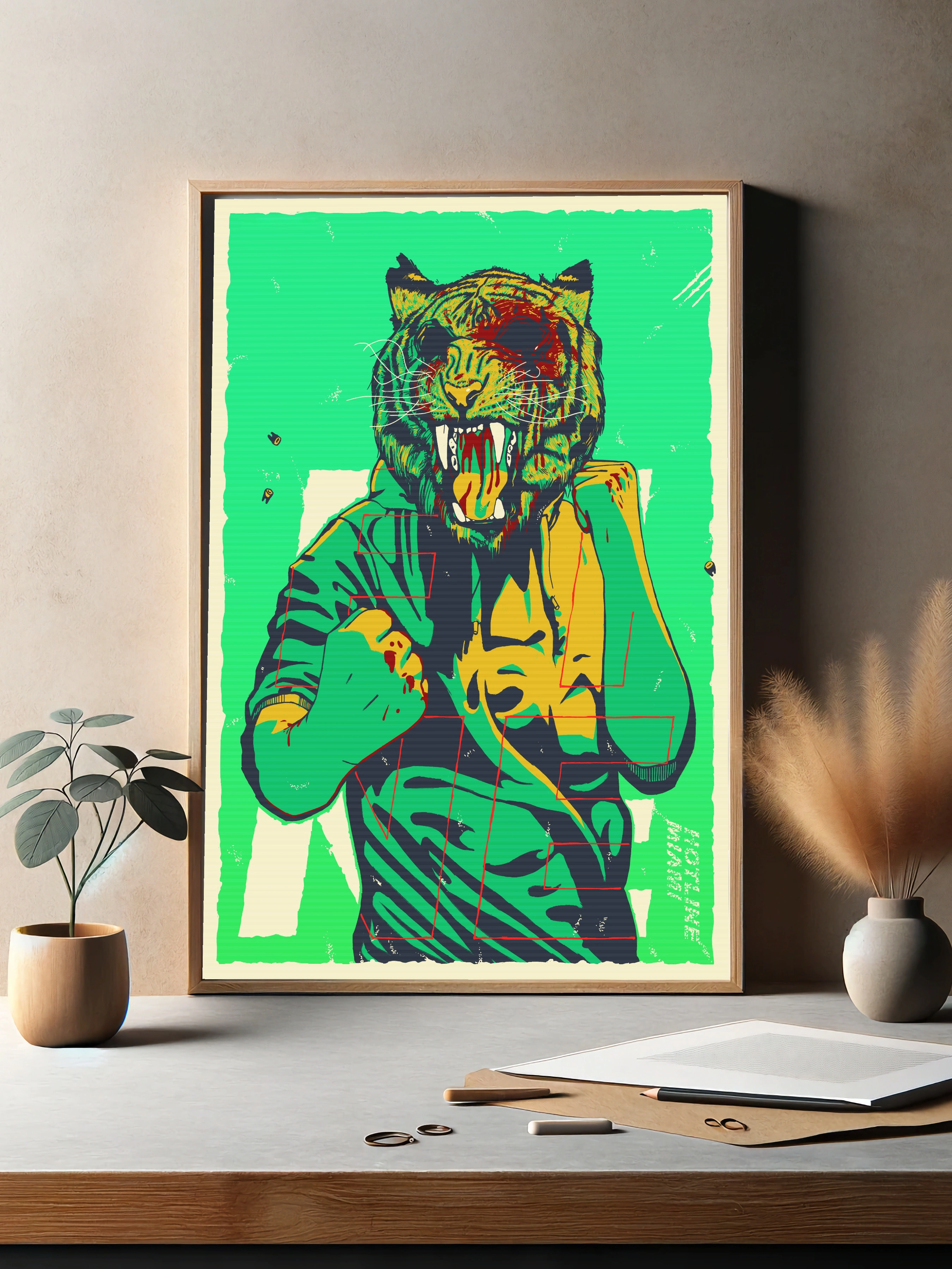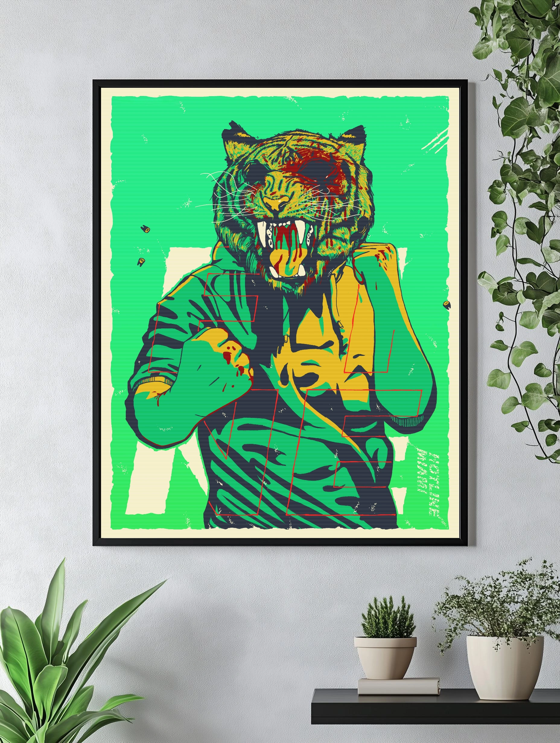 Интерьерный постер с агрессивным портретом тигра, выполненным в графическом, уличном стиле. Картина сочетает глубокие зелёные, ярко-жёлтые и красные цвета, создавая динамичное настроение. Уникальное декоративное искусство для стен, прекрасно впишется в современный интерьер гостиной или офиса благодаря своему выразительному образу и смелой композиции.