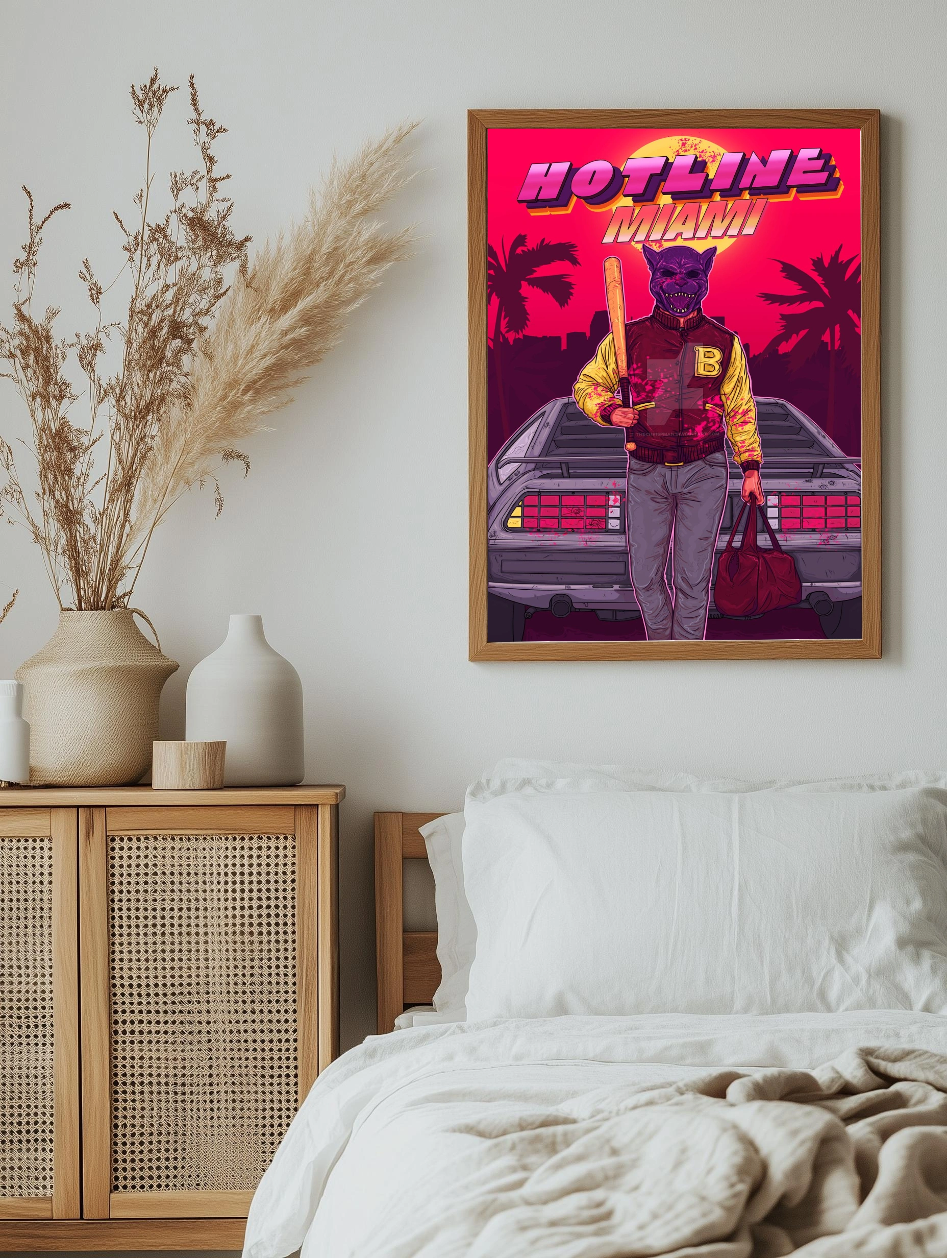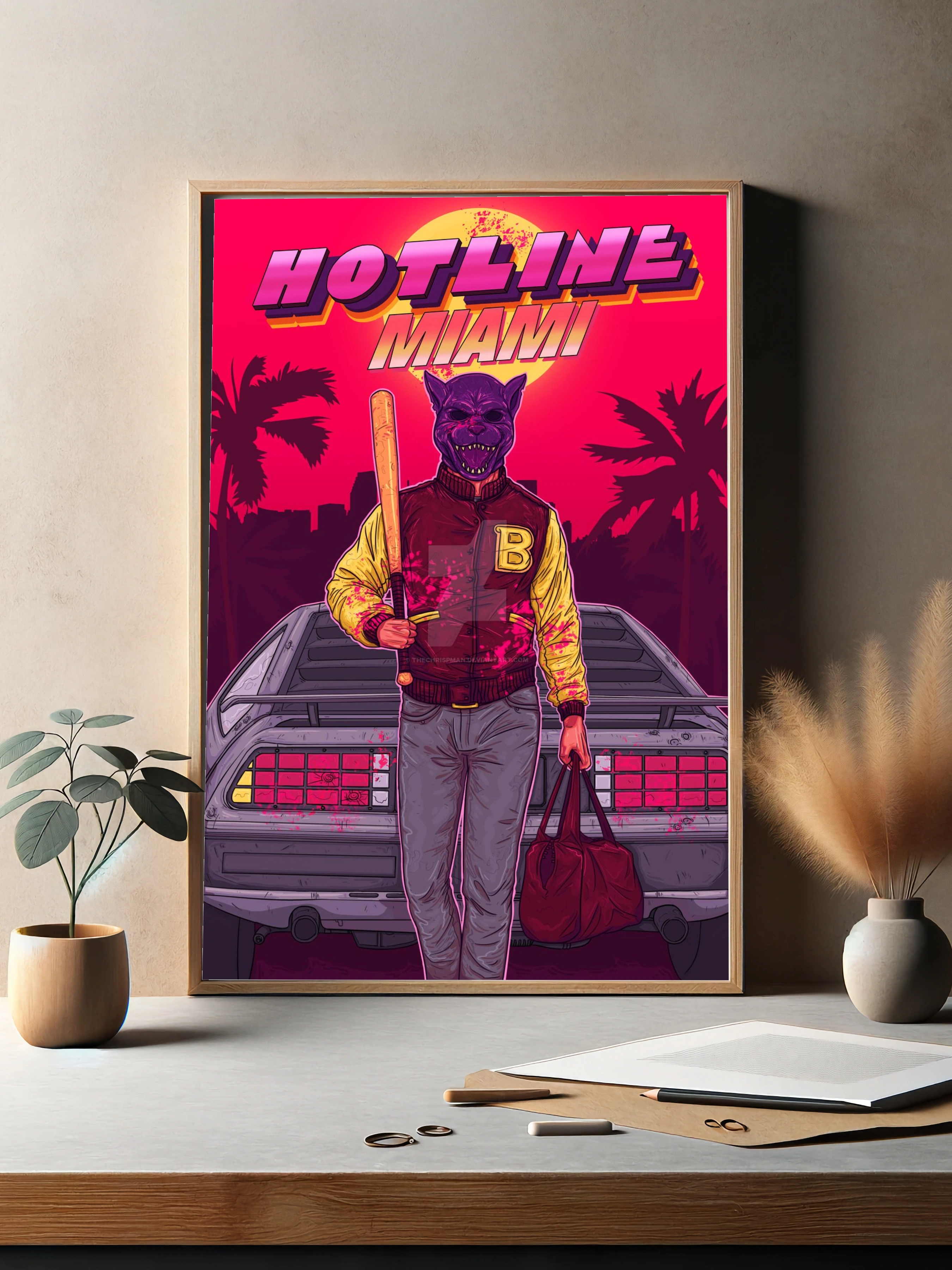 Яркий интерьерный плакат на тему легендарной игры Hotline Miami выполнен в стиле нео-нуар и ретро с элементами киберпанка. На изображении стоит главный персонаж в маске животного с битой в руке на фоне неонового заката, пальм и спортивного автомобиля. Яркие цвета и динамичная композиция создают атмосферу напряжённости и опасности. Отличный выбор для современного искусства для стен в гостиной или офисе.