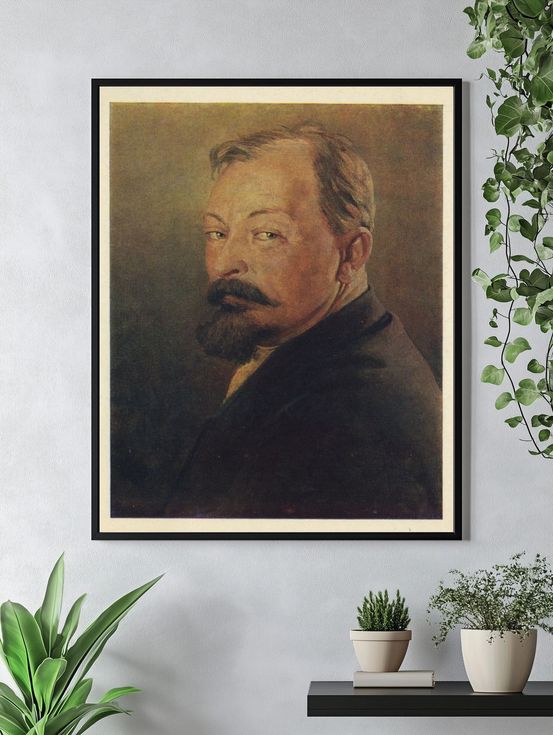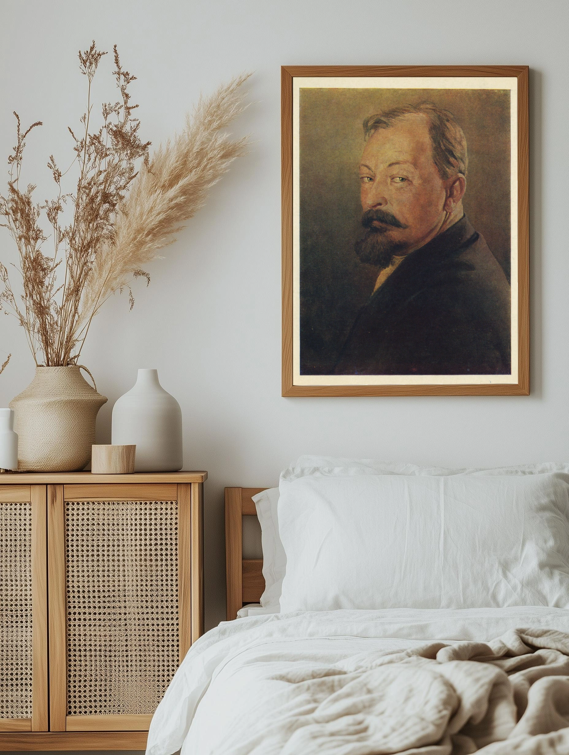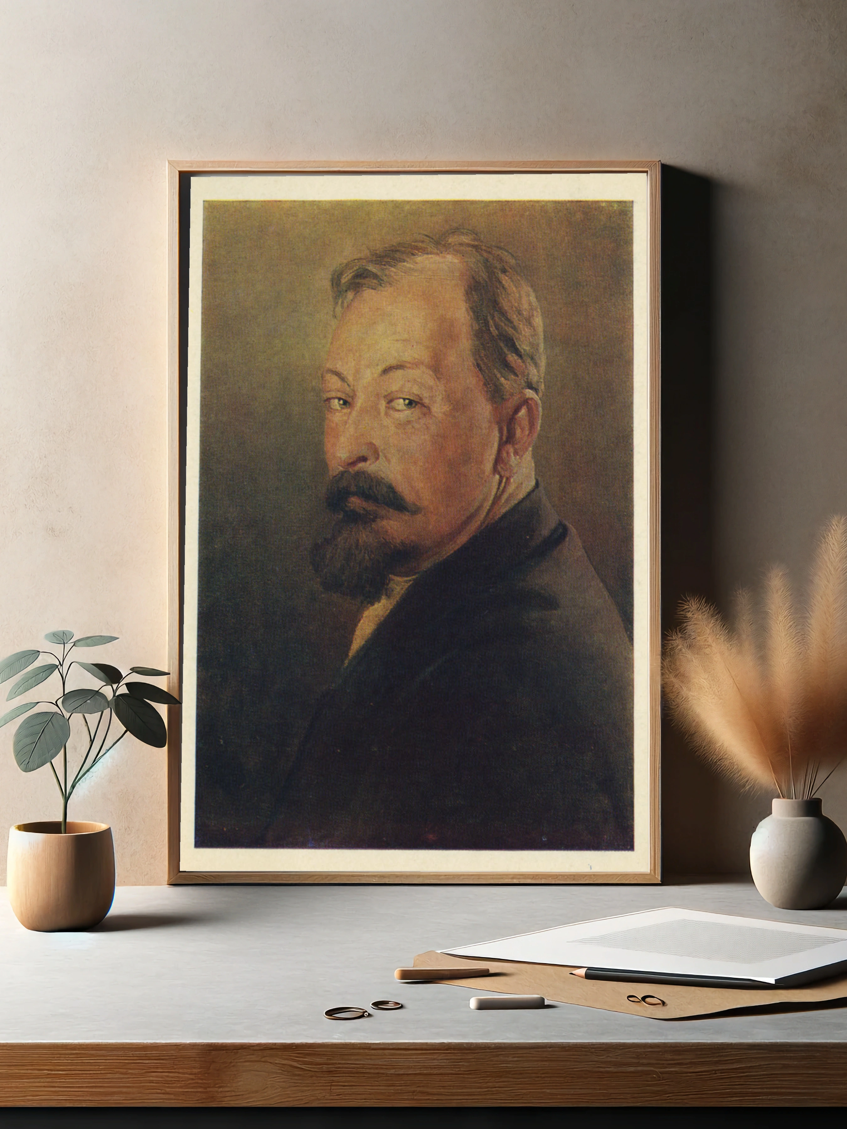 Изображение представляет собой классический портрет мужчины с бородой и усами, выполненный в тёплых, приглушённых тонах. Картина передает глубокий, задумчивый взгляд модели, создавая атмосферу уюта и серьезности. Такой интерьерный арт идеально подойдет для гостиной или кабинета, добавляя стильный декор стен и уникальные картины для дома.