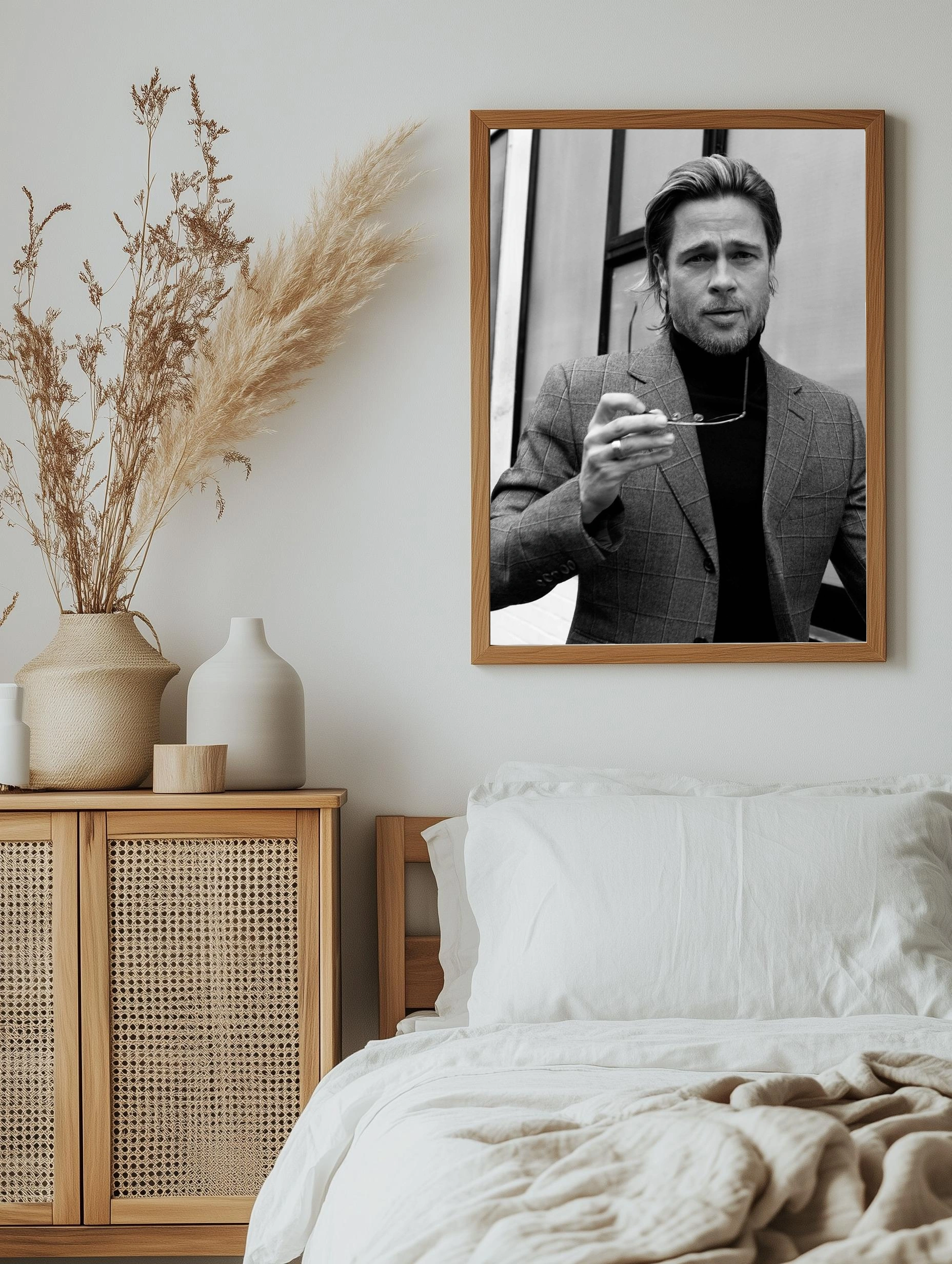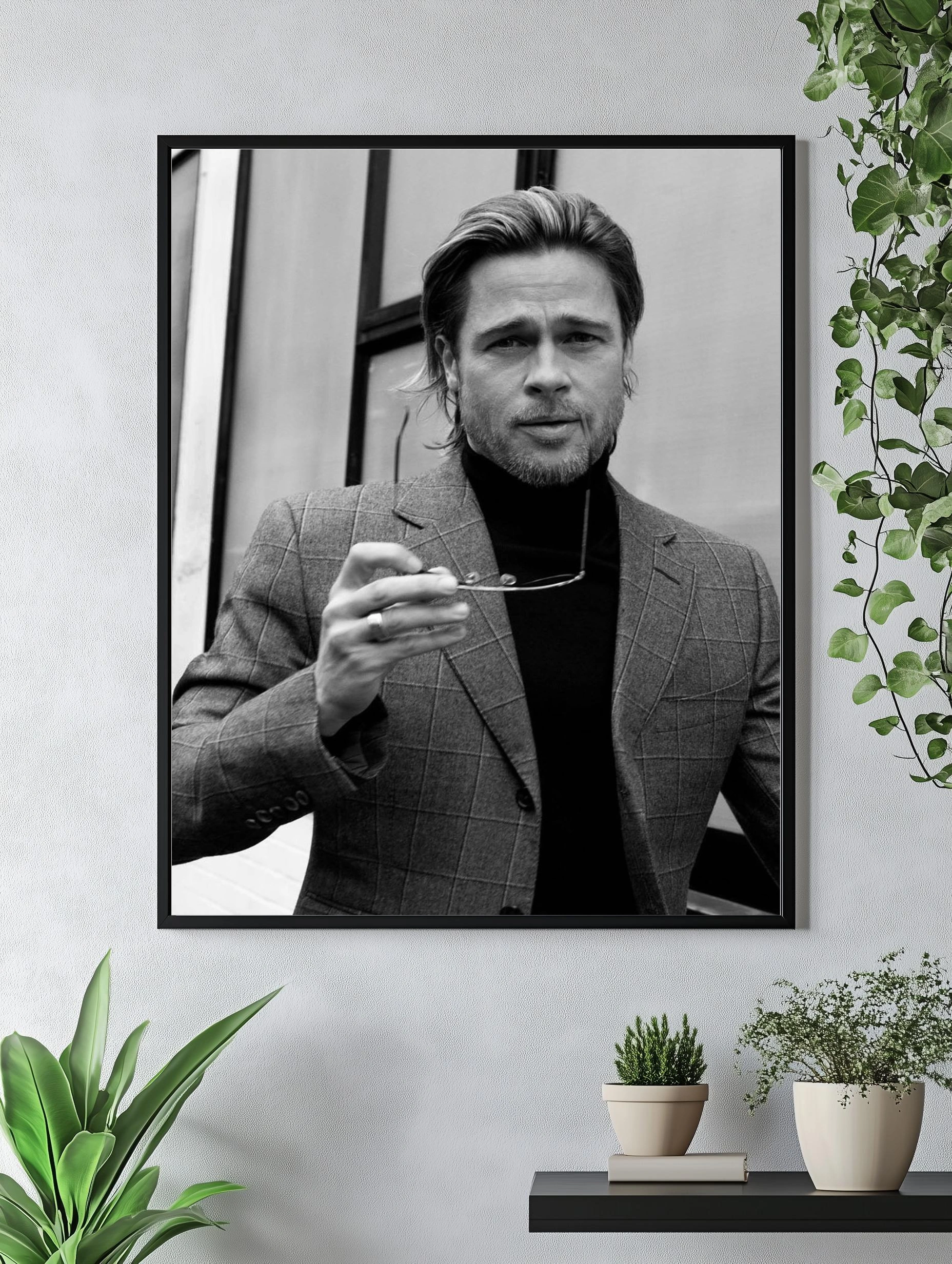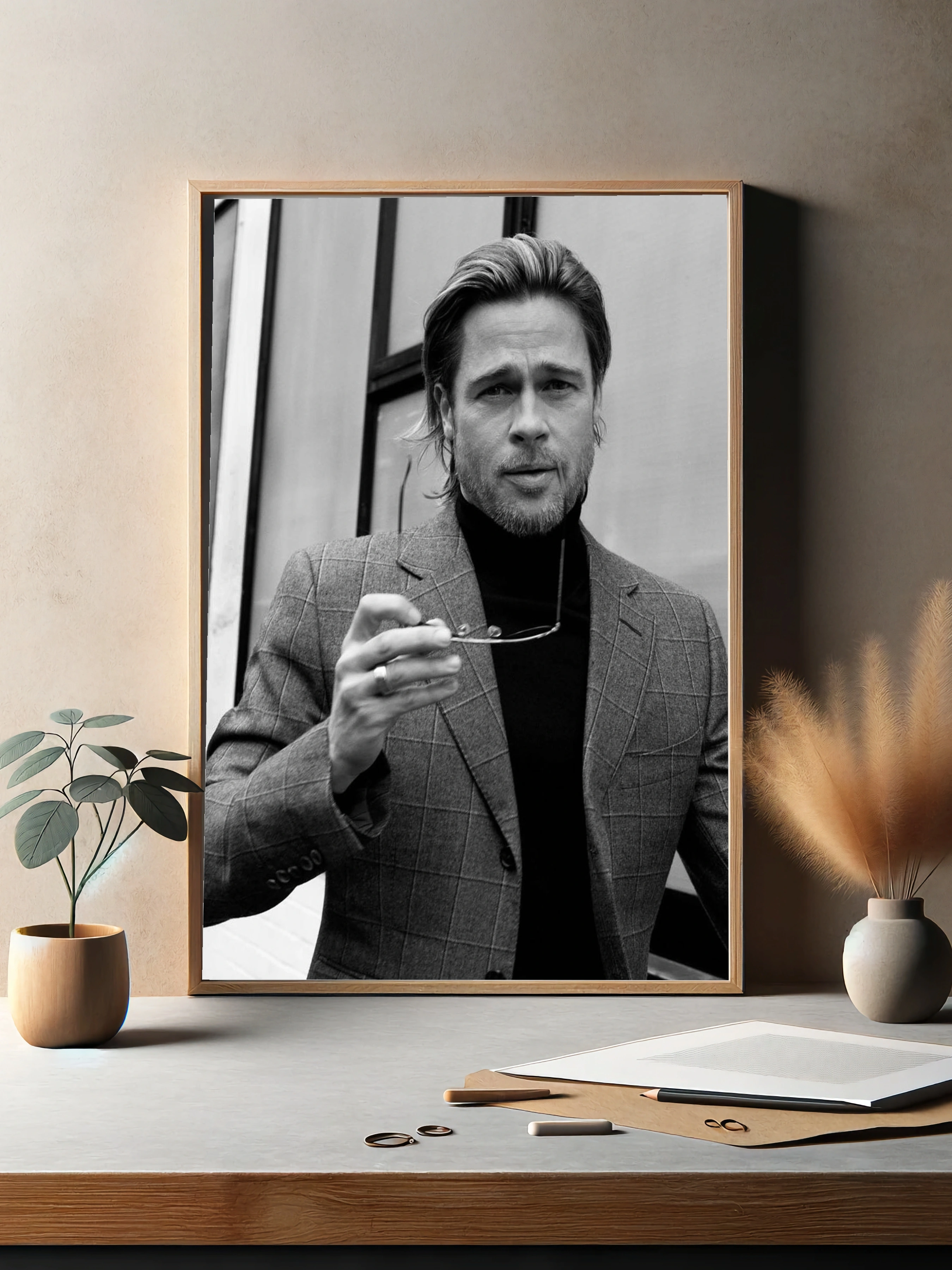 Черно-белая фотография с изображением знаменитого актера Брэда Питта в стильном клетчатом пиджаке и черном гольфе. Он держит очки в руке, позируя у окна, что создаёт атмосферу элегантности и интеллекта. Эта картина для спальни или офиса будет отличным выбором для современного интерьера и художественного декора.