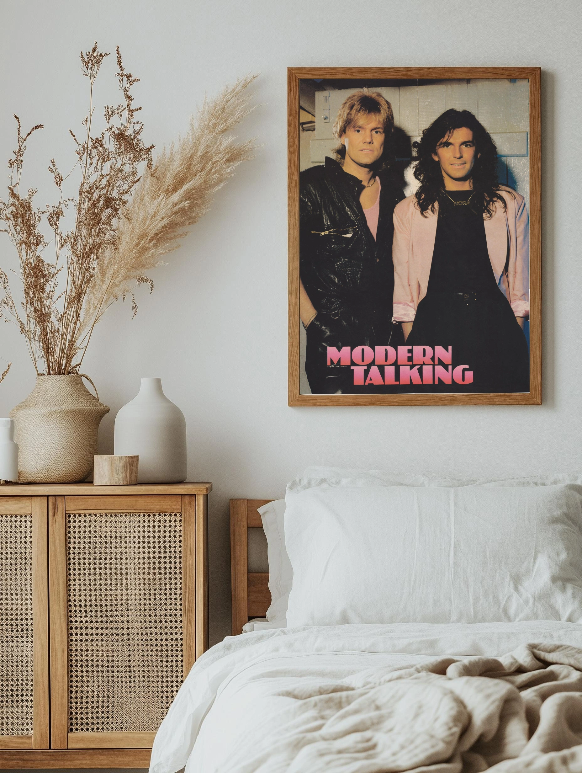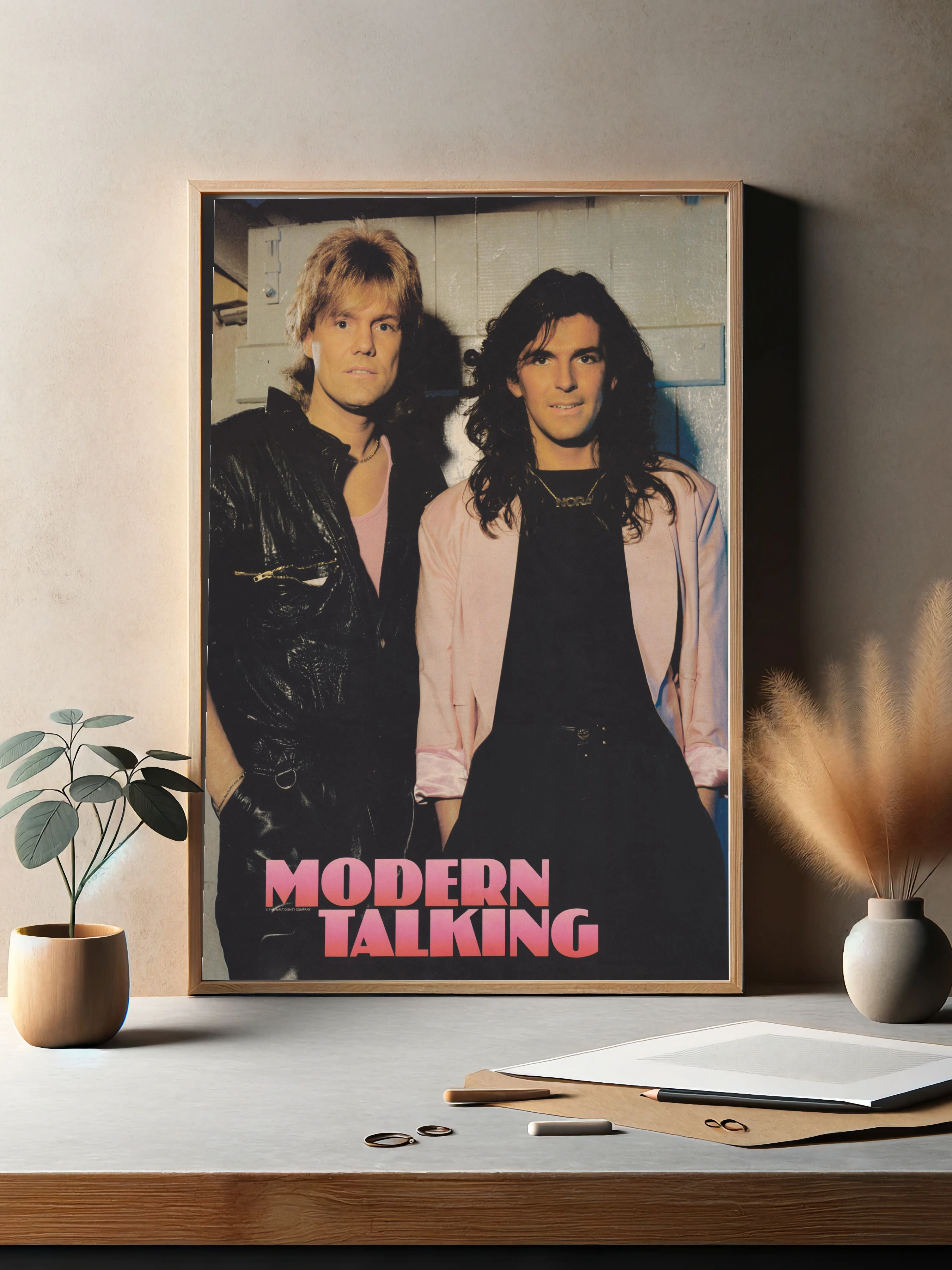 Фотопортрет культового музыкального дуэта 80-х Modern Talking, на котором двое музыкантов в стильных ретро-образах. Фон светлый, с акцентом на модные детали одежды и причесок, характерные для эпохи 80-х. Этот художественный плакат станет уникальным декором для гостиной, спальни или офиса, добавляя нотки винтажного стиля и музыкальной истории.