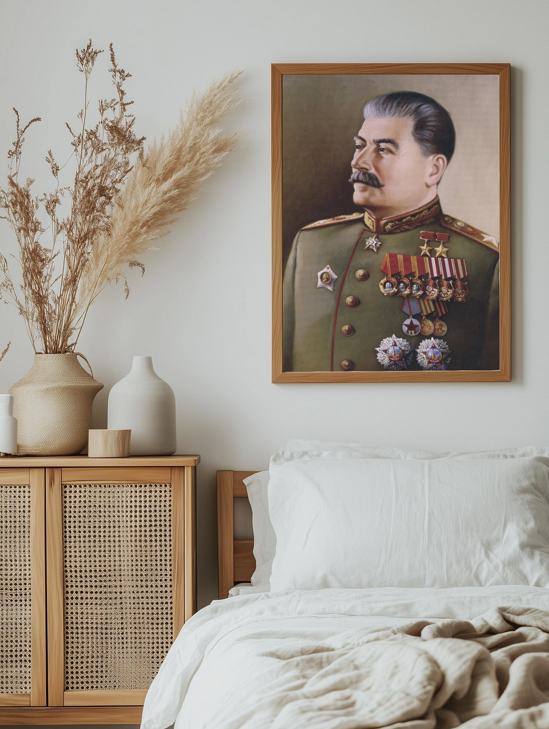 На изображении представлена реалистичная картина с портретом Иосифа Сталина в военной форме, украшенной многочисленными орденами и медалями. Эта художественная работа передаёт серьёзность и историческое значение фигуры советского лидера, идеально подходящая для интерьера в стиле исторического искусства и декоративного плаката для офиса или гостиной.