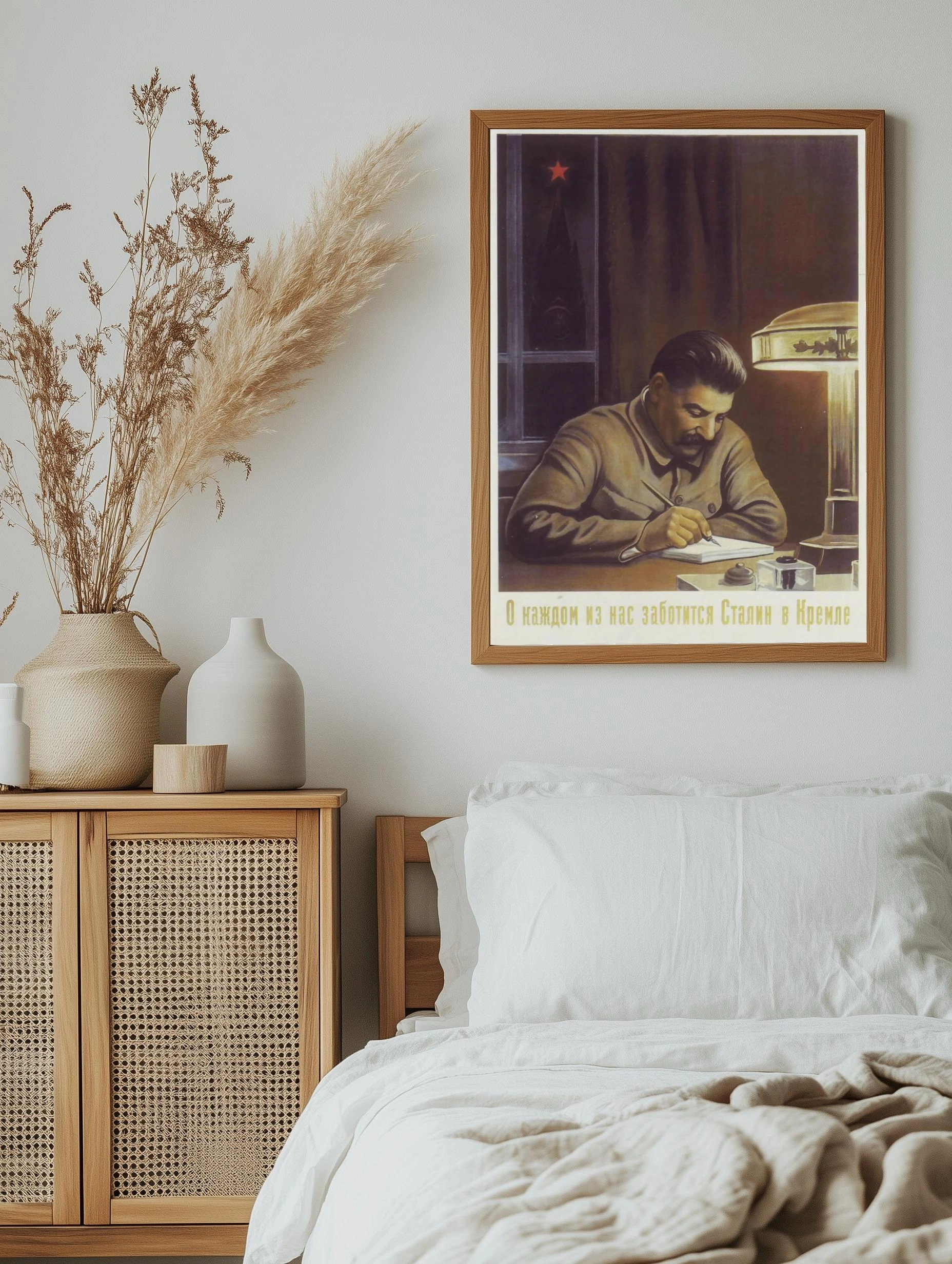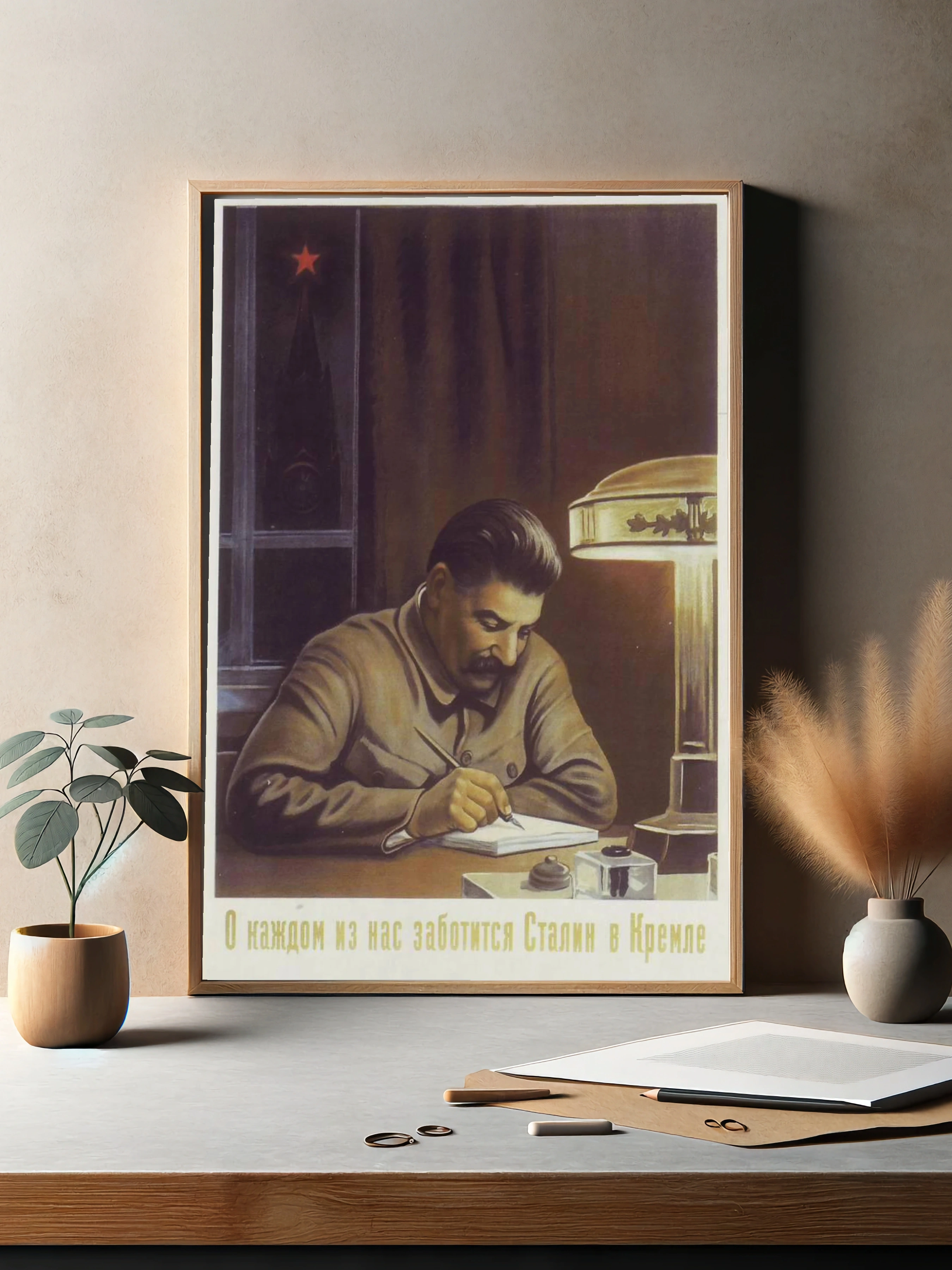 На изображении изображен Джозеф Сталин, председатель Советского Союза, пишущий что-то за столом. Атмосфера теплая, интерьер освещен лампой, видна звезда на башне Кремля через окно. Картина выполнена в реалистической манере и несет историческую значимость. Такой художественный плакат отлично подойдет для интерьера с советской тематикой.