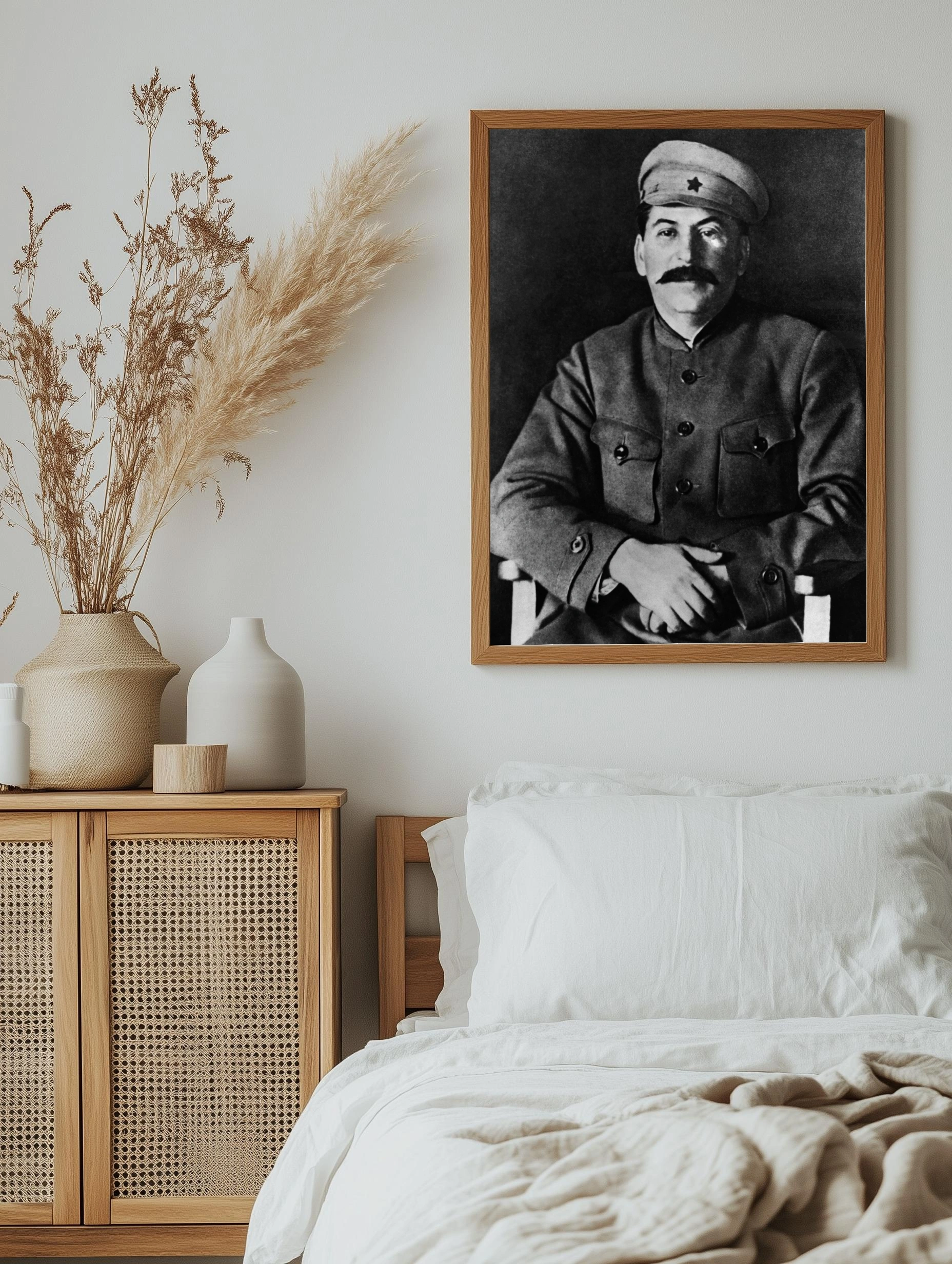 Черно-белая фотография Иосифа Сталина в военной форме с фуражкой. Изображение создает атмосферу советской эпохи, отражая значимый исторический персонаж. Картина для гостиной или офиса, подчеркивающая важность и мощь времени через декоративный плакат в рамке.