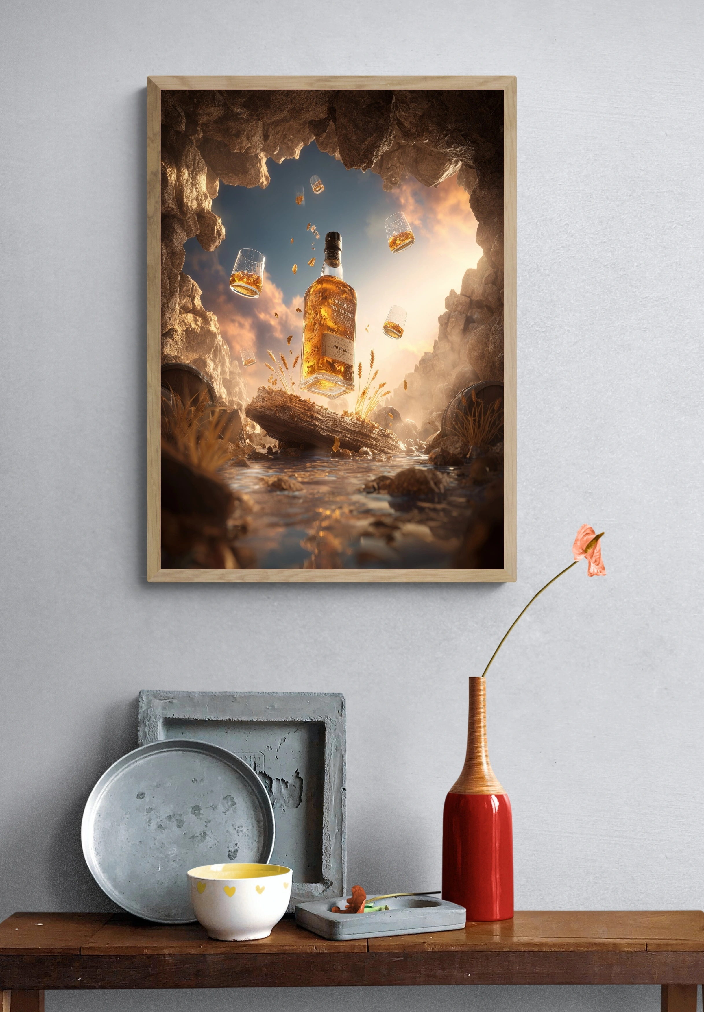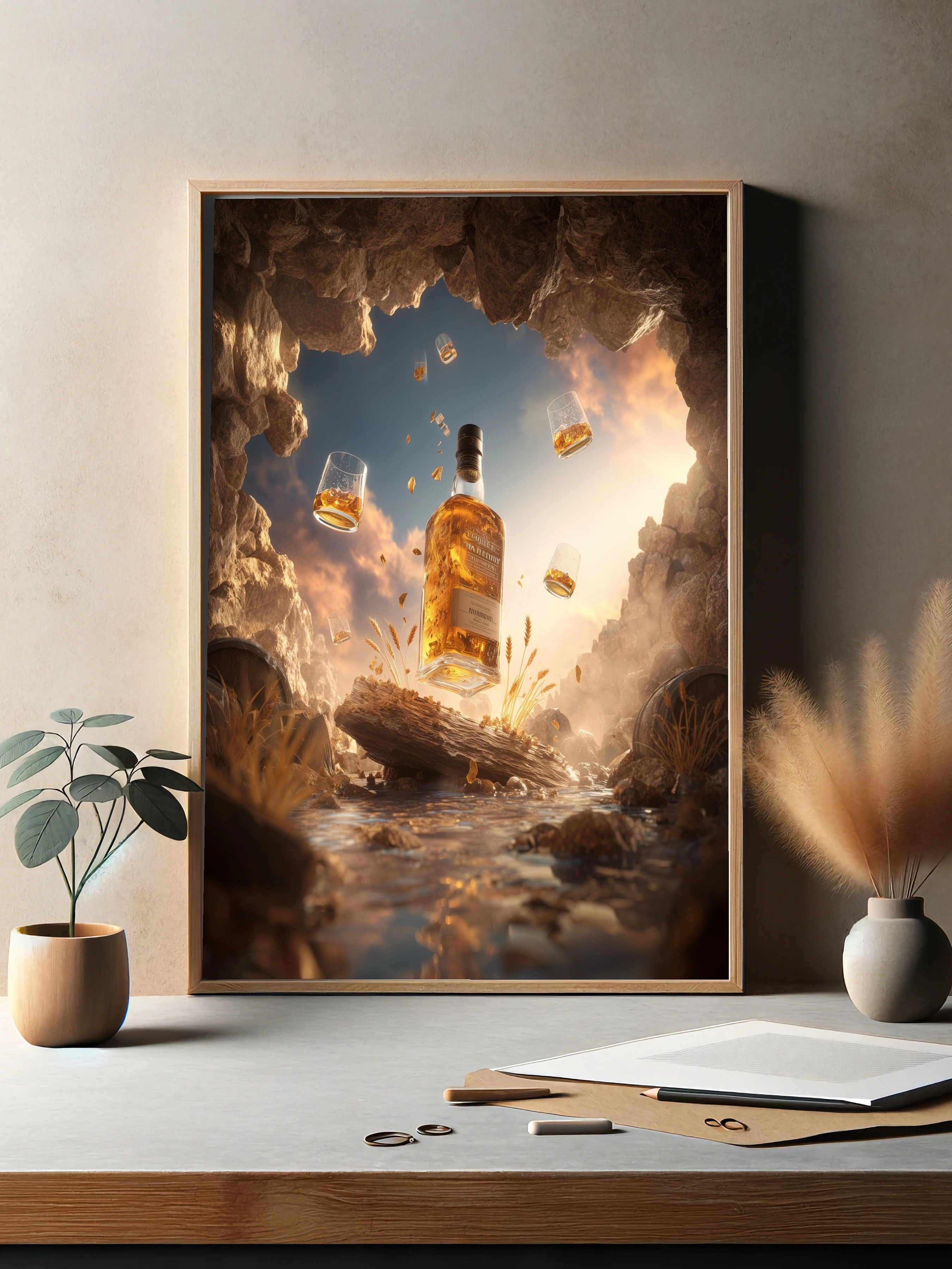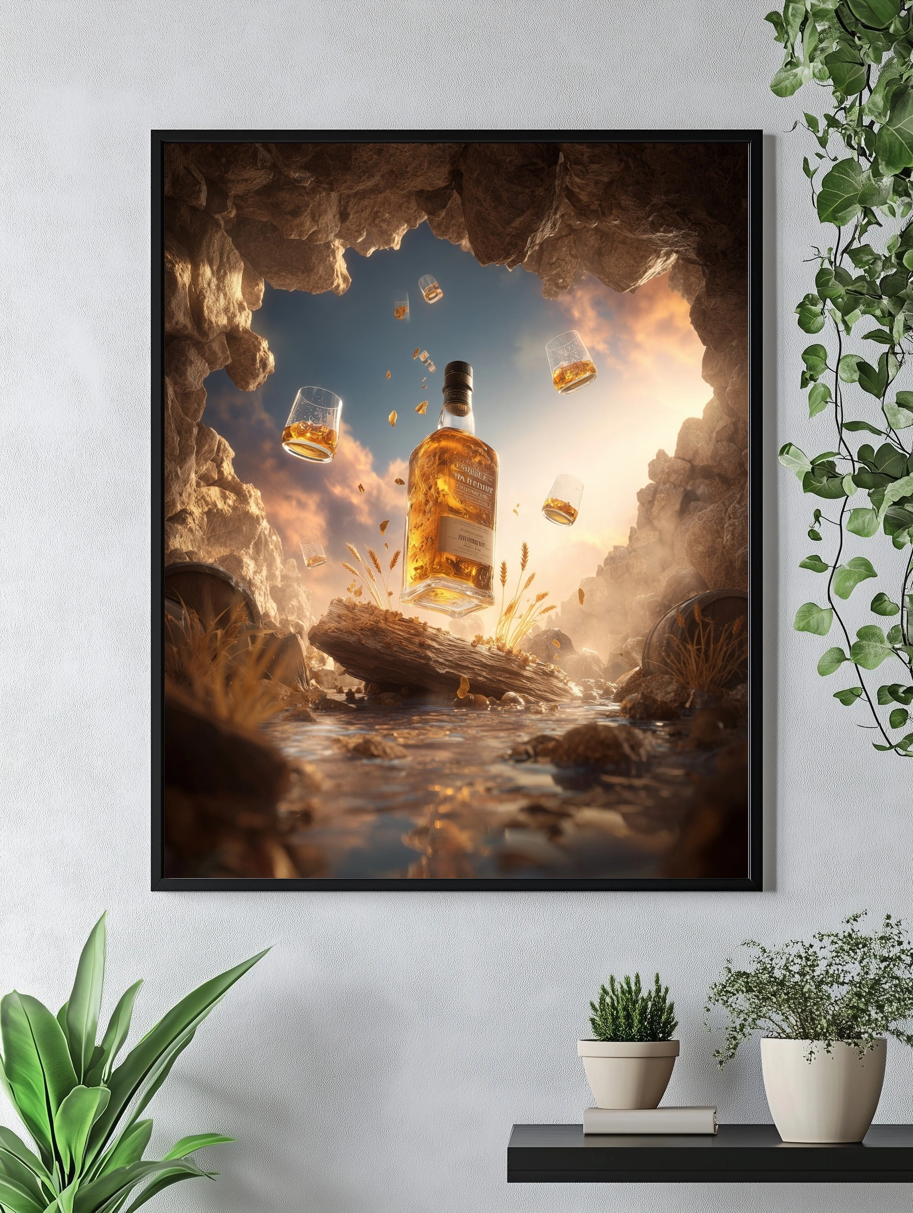 Погрузитесь в атмосферу утонченного наслаждения с этим постером, на котором изображена бутылка виски, парящая в воздухе среди живописного природного пейзажа. Вокруг нее кружатся бокалы с золотистым напитком, создавая ощущение праздника. На переднем плане — деревянный бревно, обрамленное колосьями пшеницы и камнями, что добавляет естественности и тепла. Цветовая гамма постера включает теплые золотистые и коричневые оттенки, которые подчеркивают богатство виски и создают уютную атмосферу. Стиль изображения — фэнтезийный реализм, который вызывает чувство спокойствия и умиротворения. Этот постер идеально подойдет для оформления интерьера в гостиной, баре или офисе, привнося в пространство нотки роскоши и стиля. Целевая аудитория — ценители качественного алкоголя, любители уютных вечеров и креативщики, стремящиеся к уникальному дизайну.