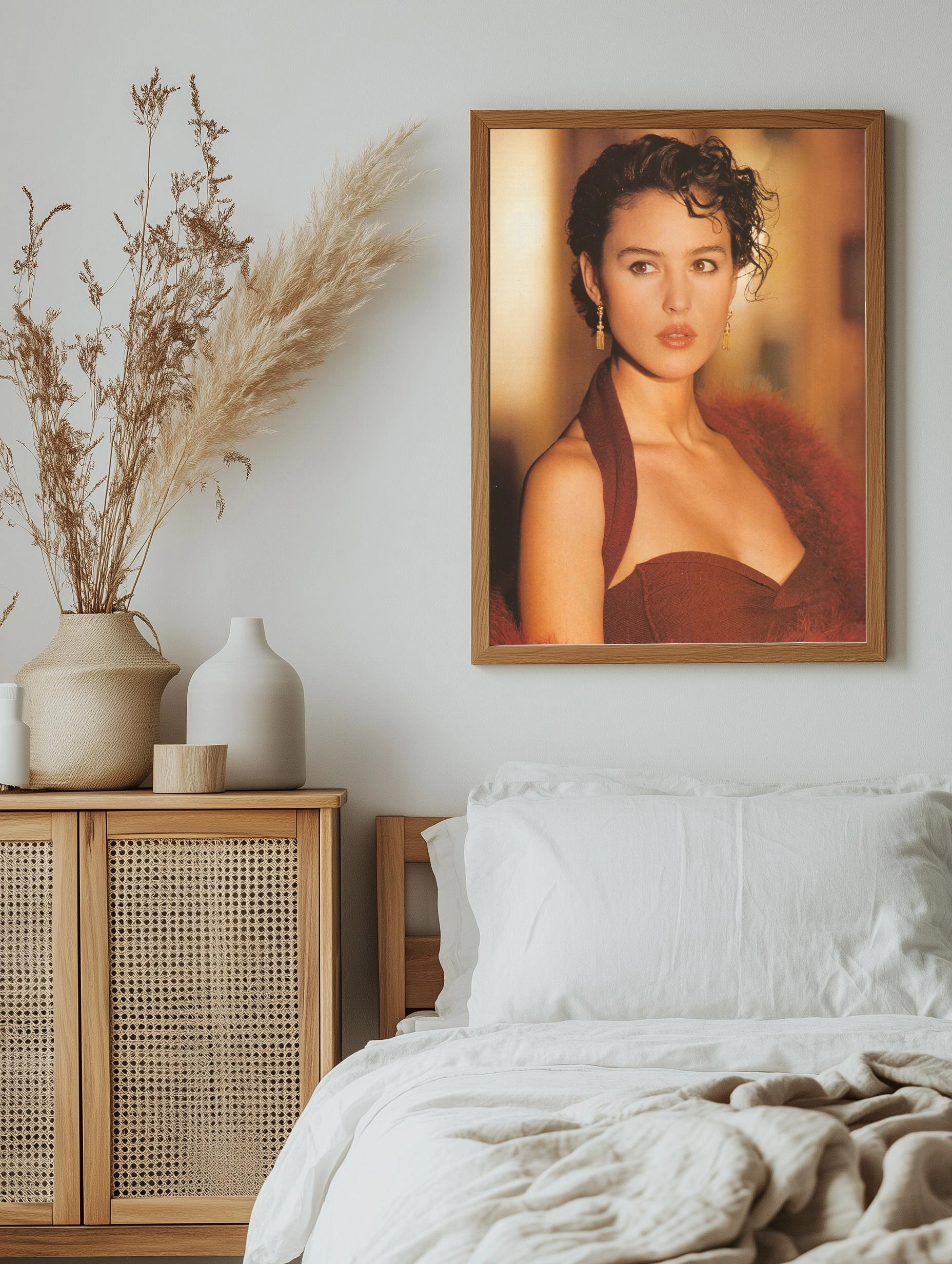 Изображение представляет собой художественный портрет женщины в стиле 90-х годов с элегантной прической и макияжем, в коричневом платье и жакете с меховой отделкой. Тёплые оттенки создают уютную и утончённую атмосферу, делая картину идеальной для гостиной, спальни или офиса. Это современное искусство для стен с акцентом на женственность и стиль.