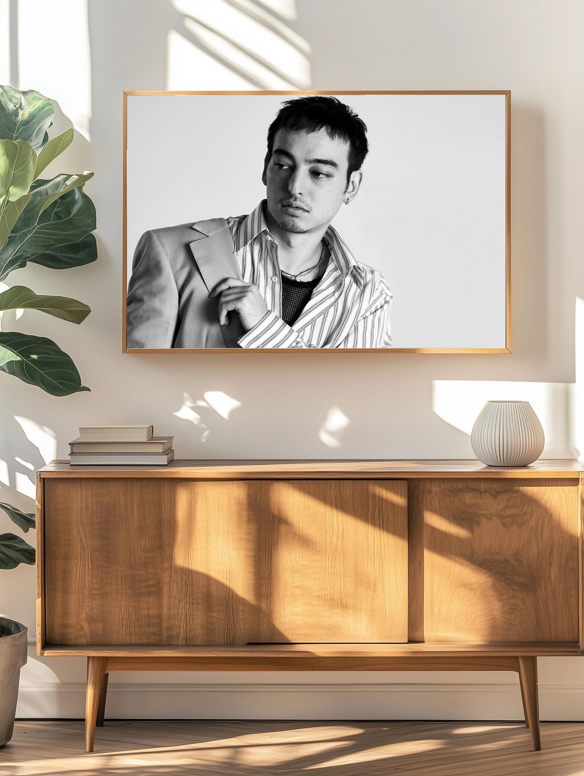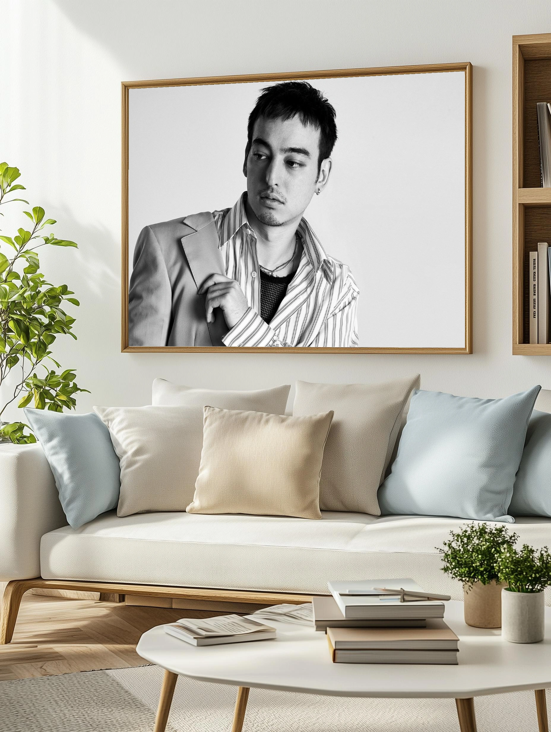 На чёрно-белом изображении запечатлён молодой мужчина с короткой стрижкой и серьгой в ухе. Он одет в полосатую рубашку и классический пиджак, смотрит в сторону с задумчивым выражением. Минималистичный фон подчёркивает эмоции и детали лица, создавая атмосферу современного искусства для стен и стильного декора в интерьере.