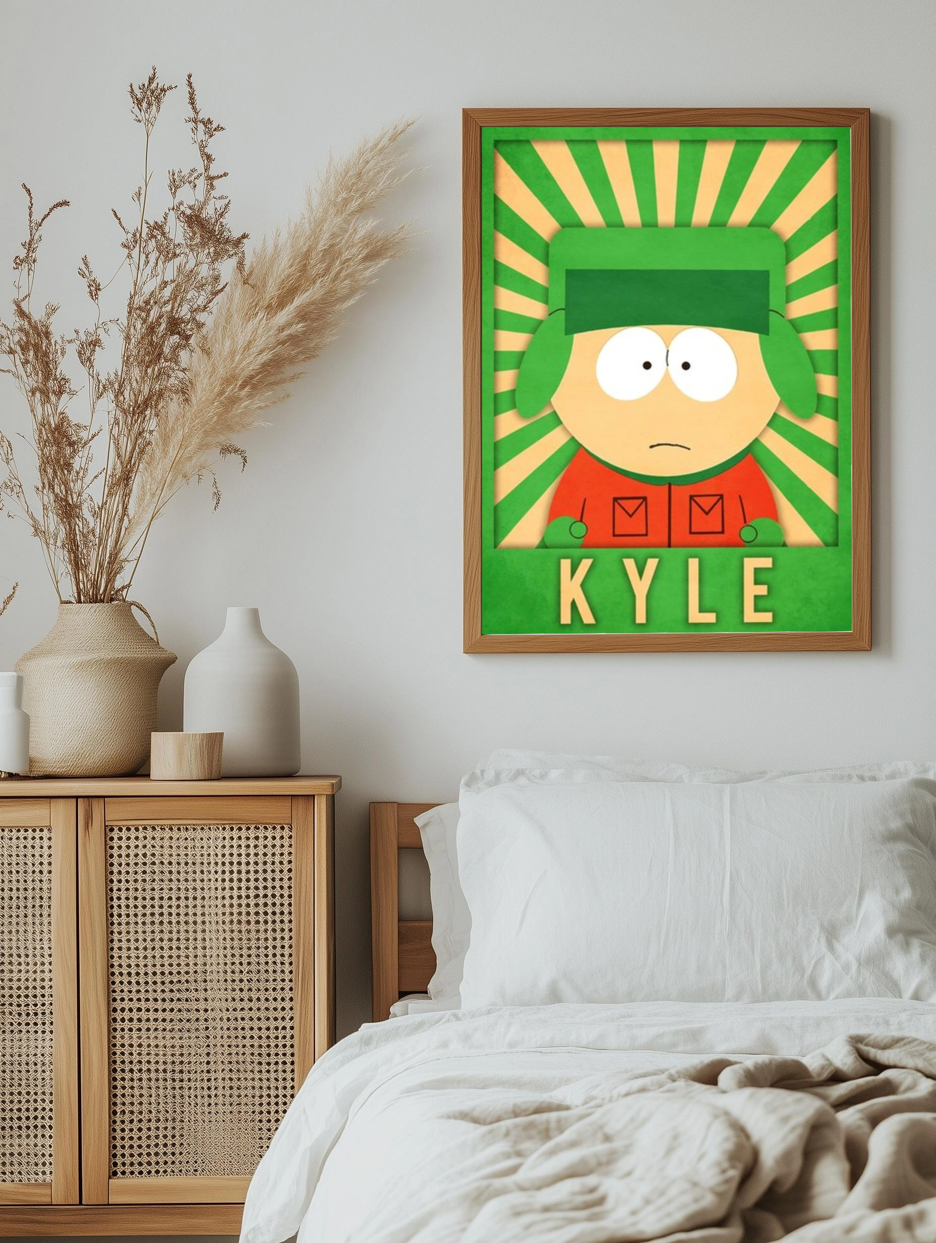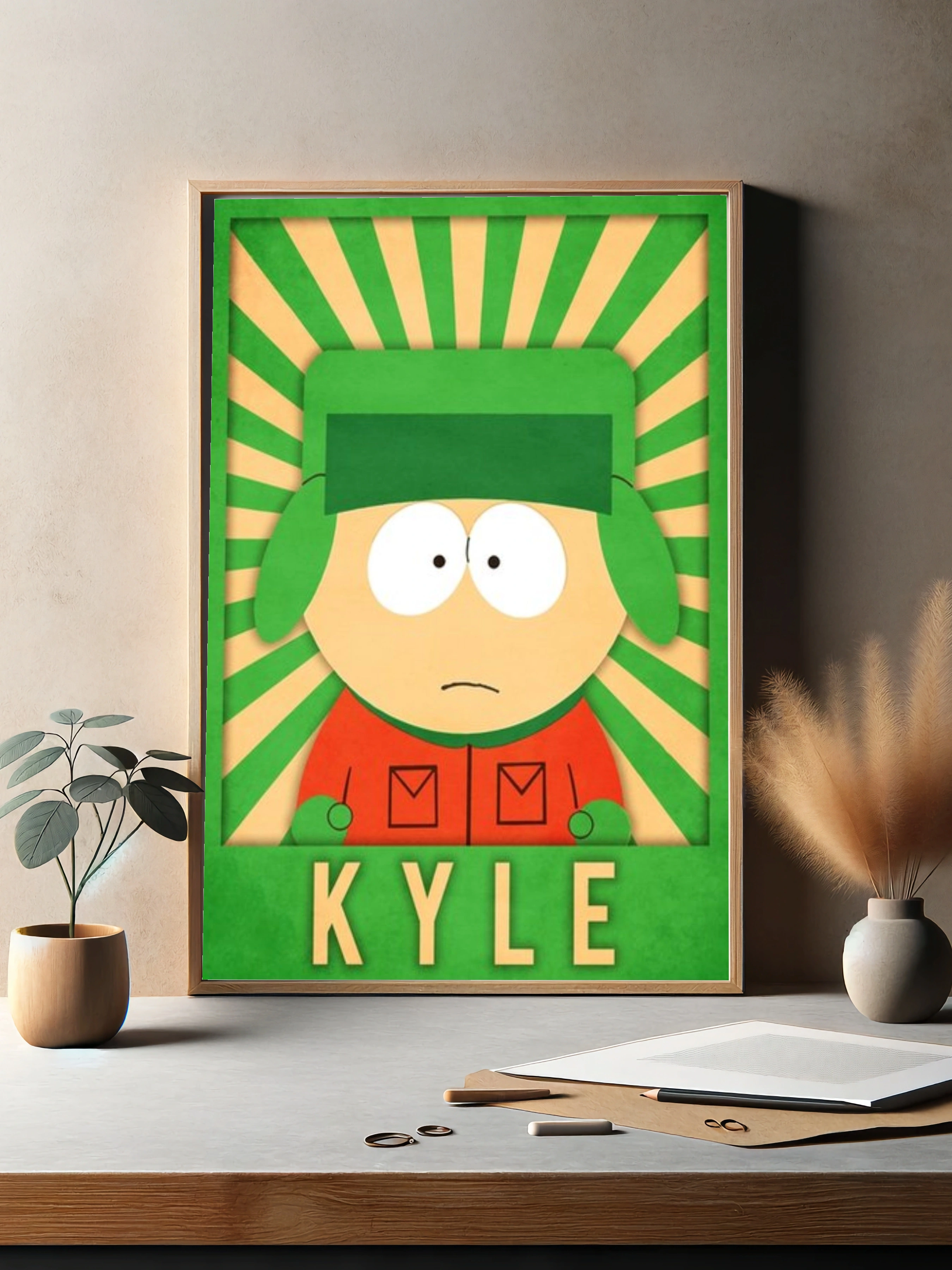 На изображении изображён Кайл Бротлавски — узнаваемый персонаж мультсериала Южный Парк. Картина выполнена в минималистичном стиле с использованием ярких зелёных, бежевых и оранжевых цветов. Уникальный интерьерный плакат с ярким фоном и большим именем героя подчеркивает юмор и стиль современной анимации.
