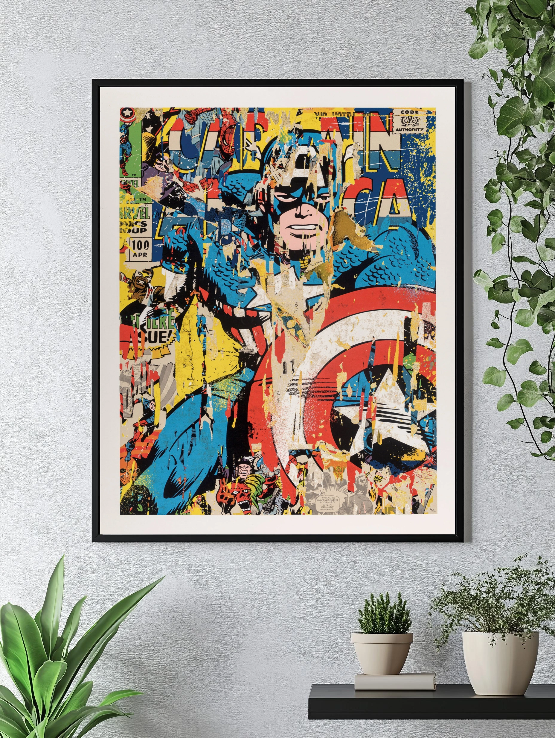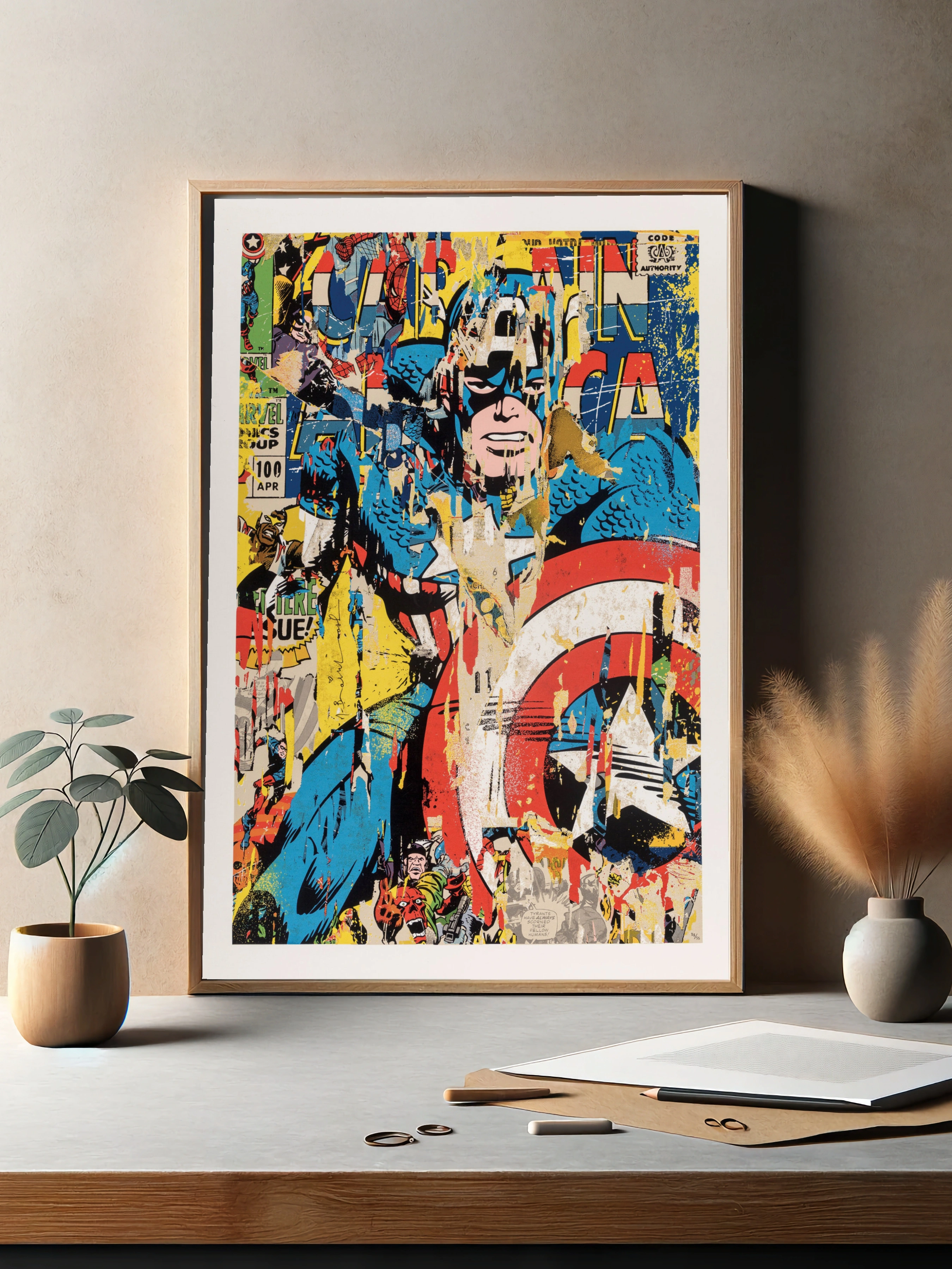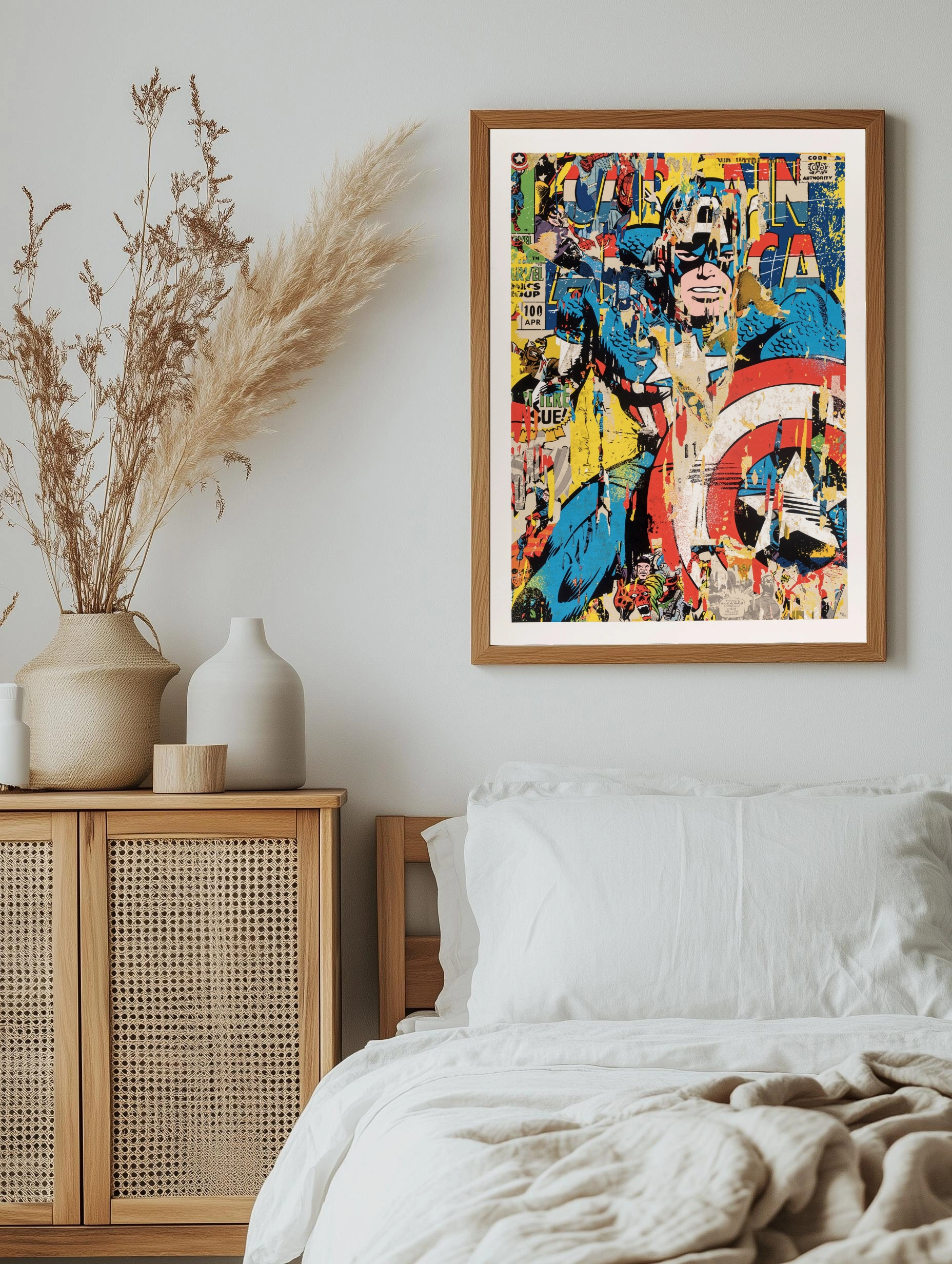 Декоративный плакат с изображением Капитана Америки в стиле коллаж из комиксов Marvel. Картина выполнена в ярких красных, синих и жёлтых цветах с эффектом потертости и граффити, создавая атмосферу динамичности и ретро. Идеально для гостиной, офиса и уникального интерьерного дизайна.