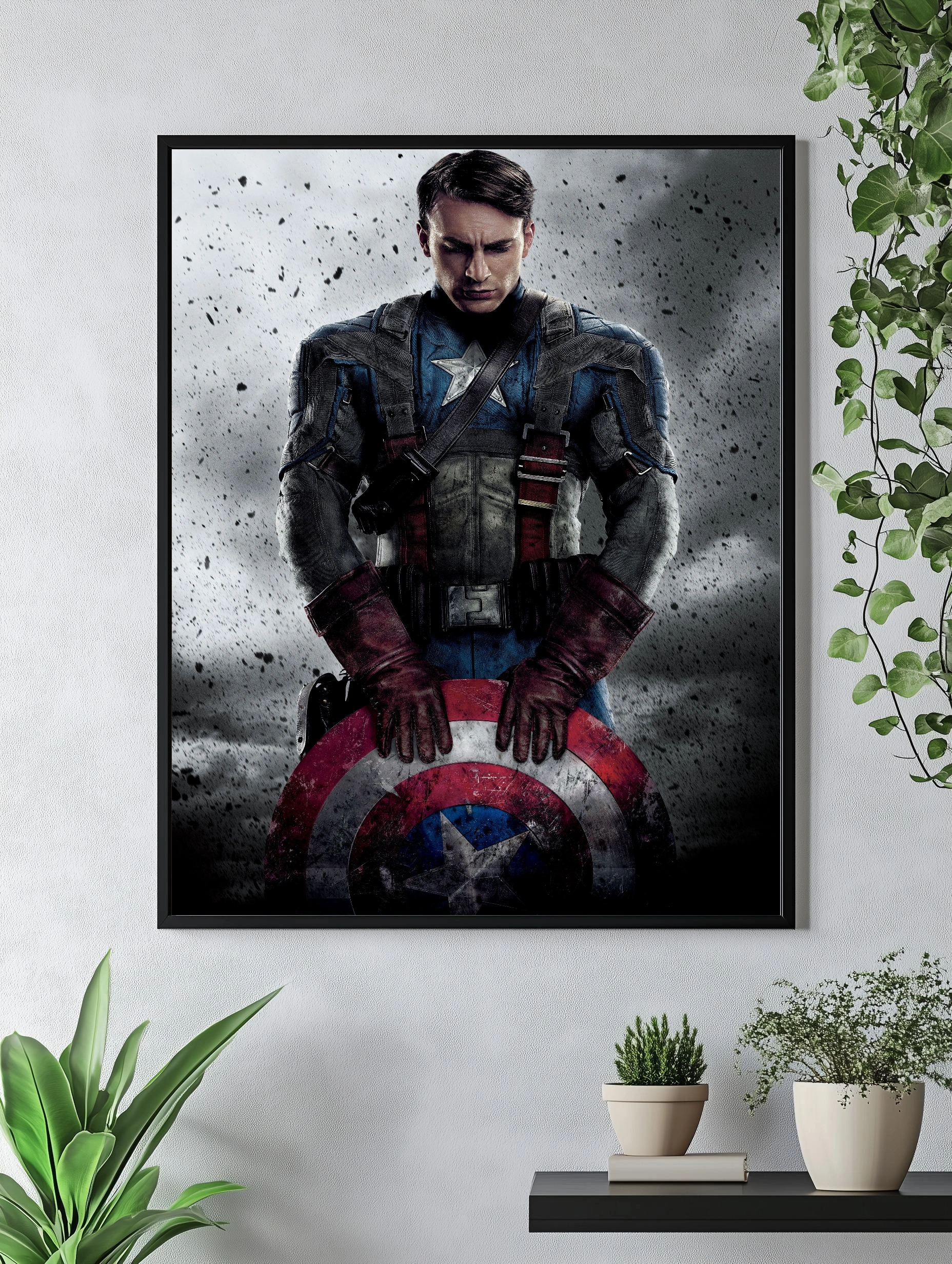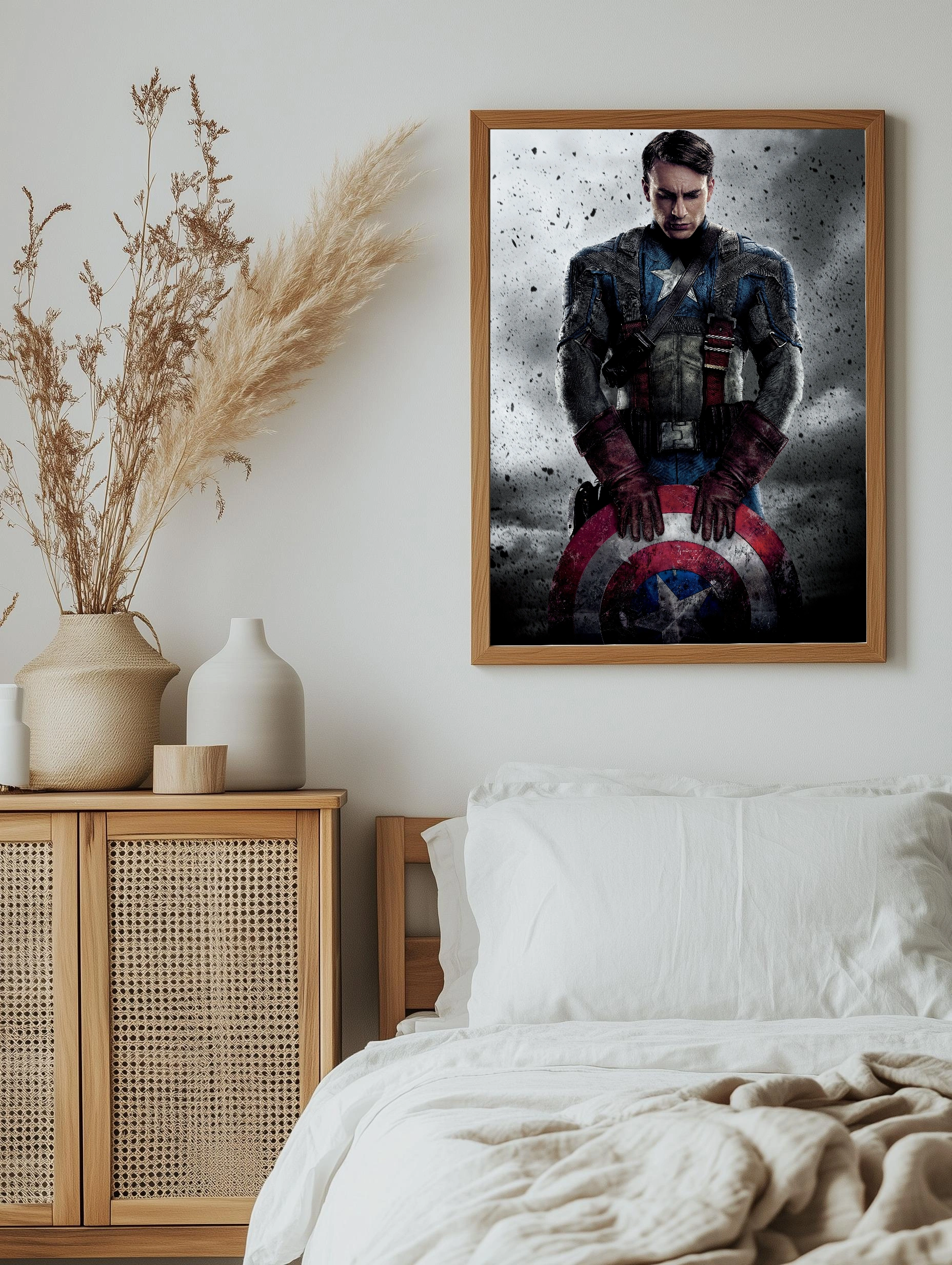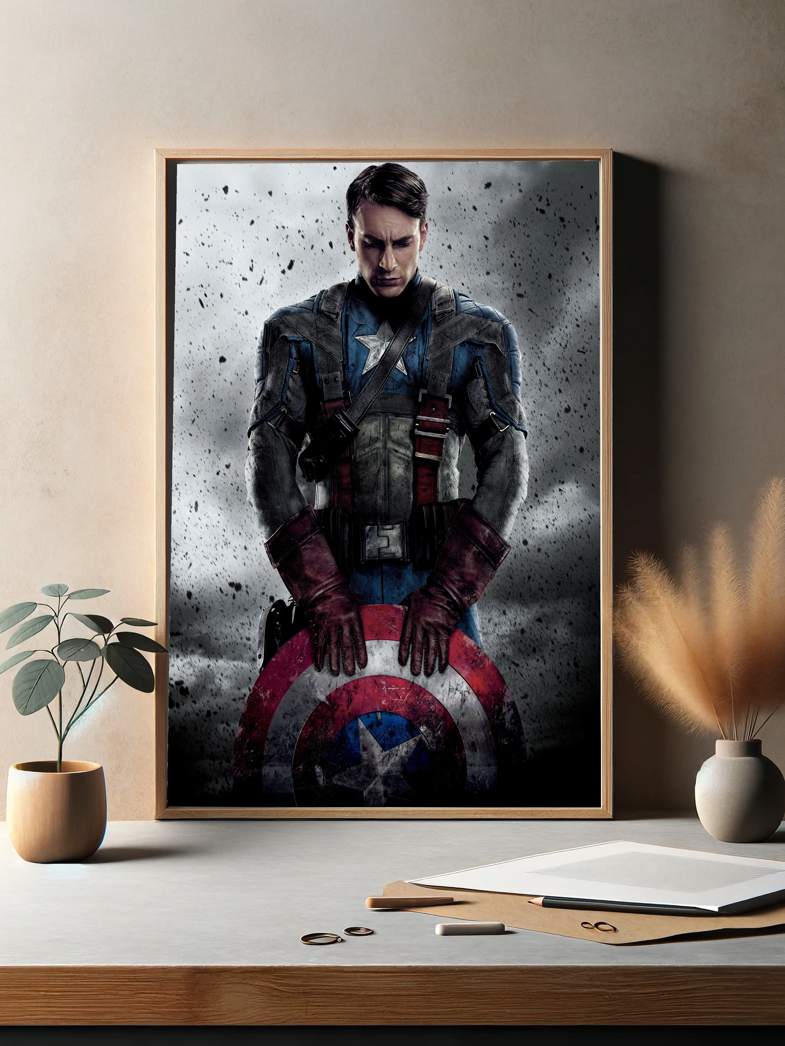 Изображение представляет собой художественный портрет Капитана Америки — известного персонажа Marvel Comics. Он стоит с опущенной головой, держа в руках знаменитый щит с красно-бело-синими цветами и звездой. Атмосфера напряжённая и серьёзная, фон выполнен в стиле мокрого металла с дождём, подчёркивая мужество и решимость героя. Это стильный декоративный плакат для интерьера, идеально подходящий для гостиной или офиса, добавит современного искусства и уникальности стенам.