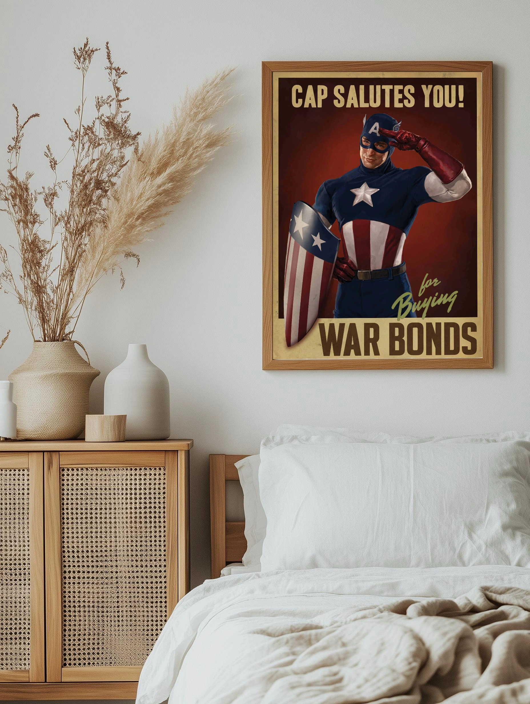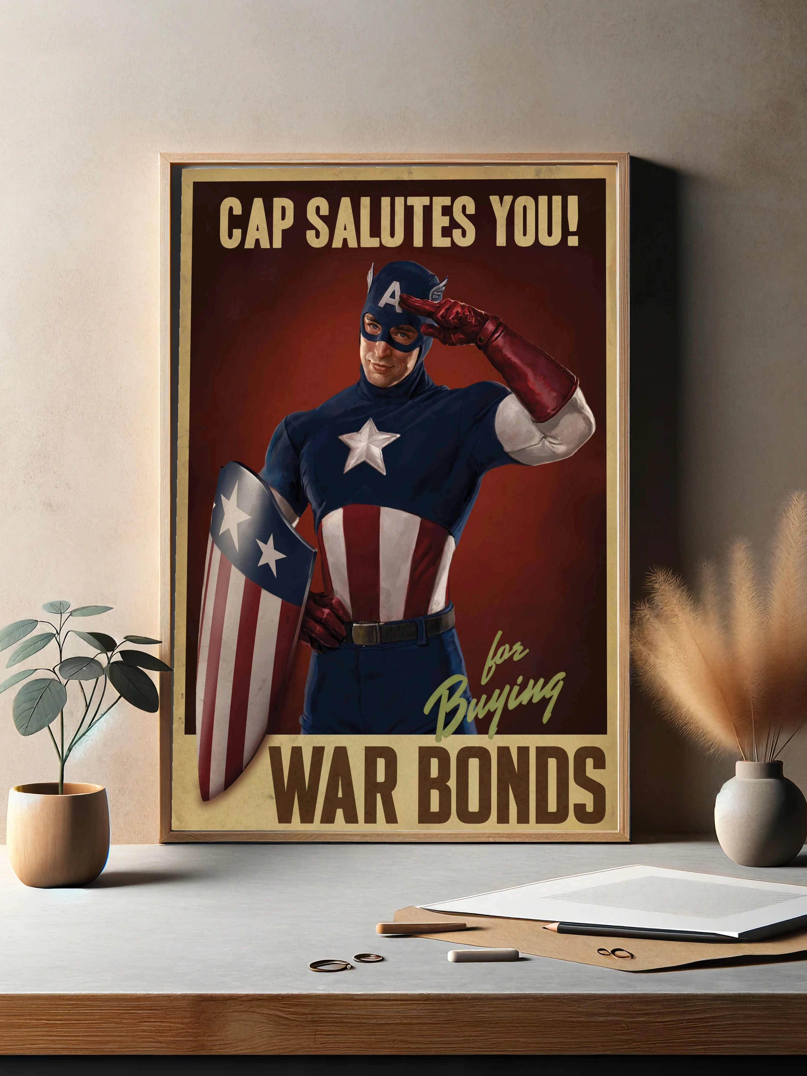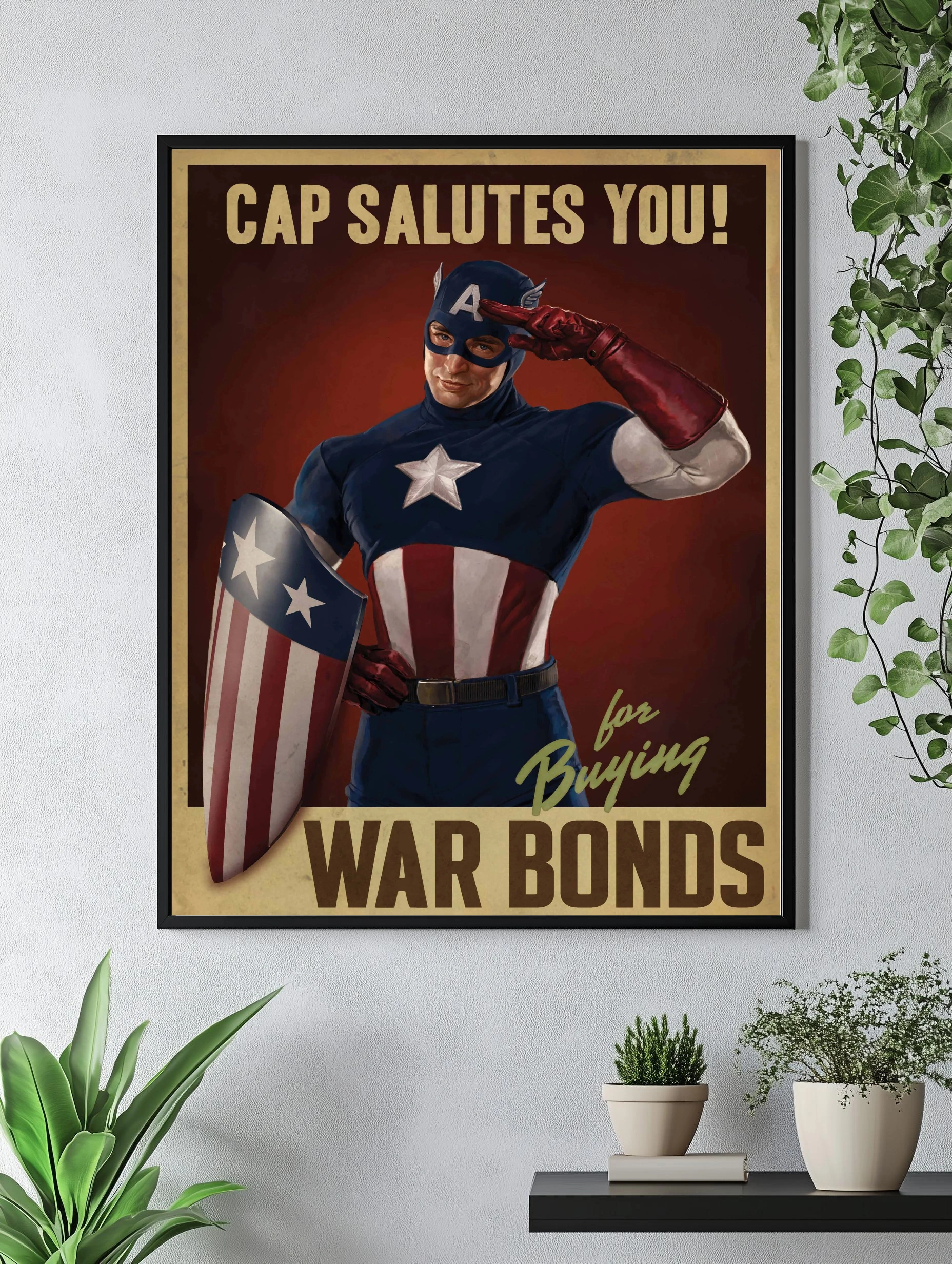 На изображении представлен Капитан Америка в классическом красно-синем костюме с белой звездой на груди. Он отдаёт военный салют, держа в руках знаменитый щит с полосами и звёздами. Фон тёмно-красный с ретро-стилем и надписями ‘Cap salutes you’ и ‘for buying war bonds’. Этот интерьерный декоративный плакат вдохновляет на поддержку и патриотизм.