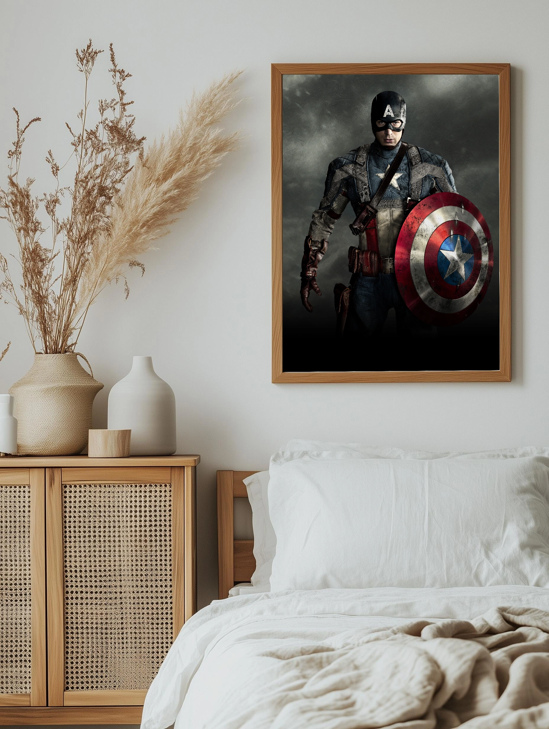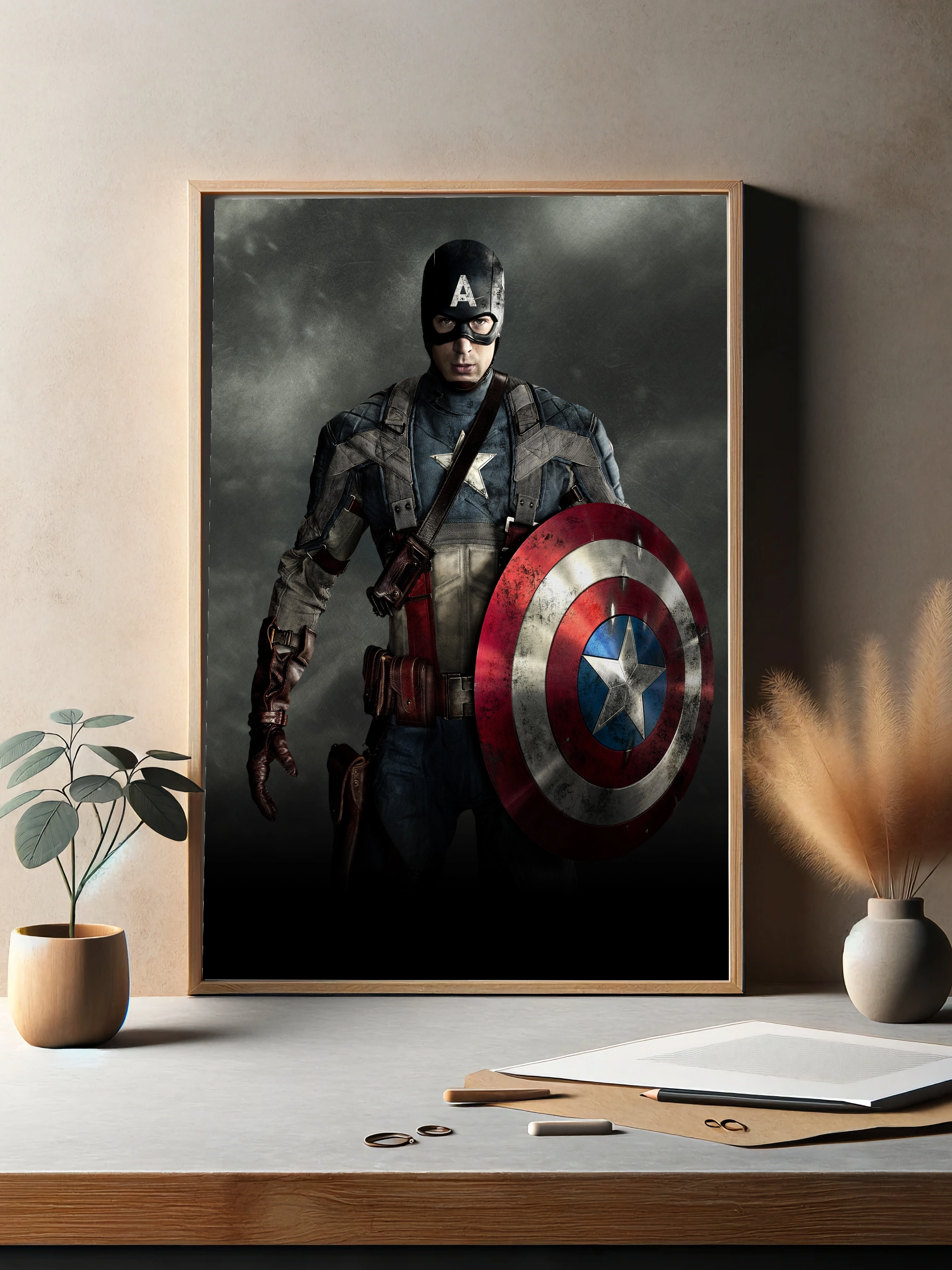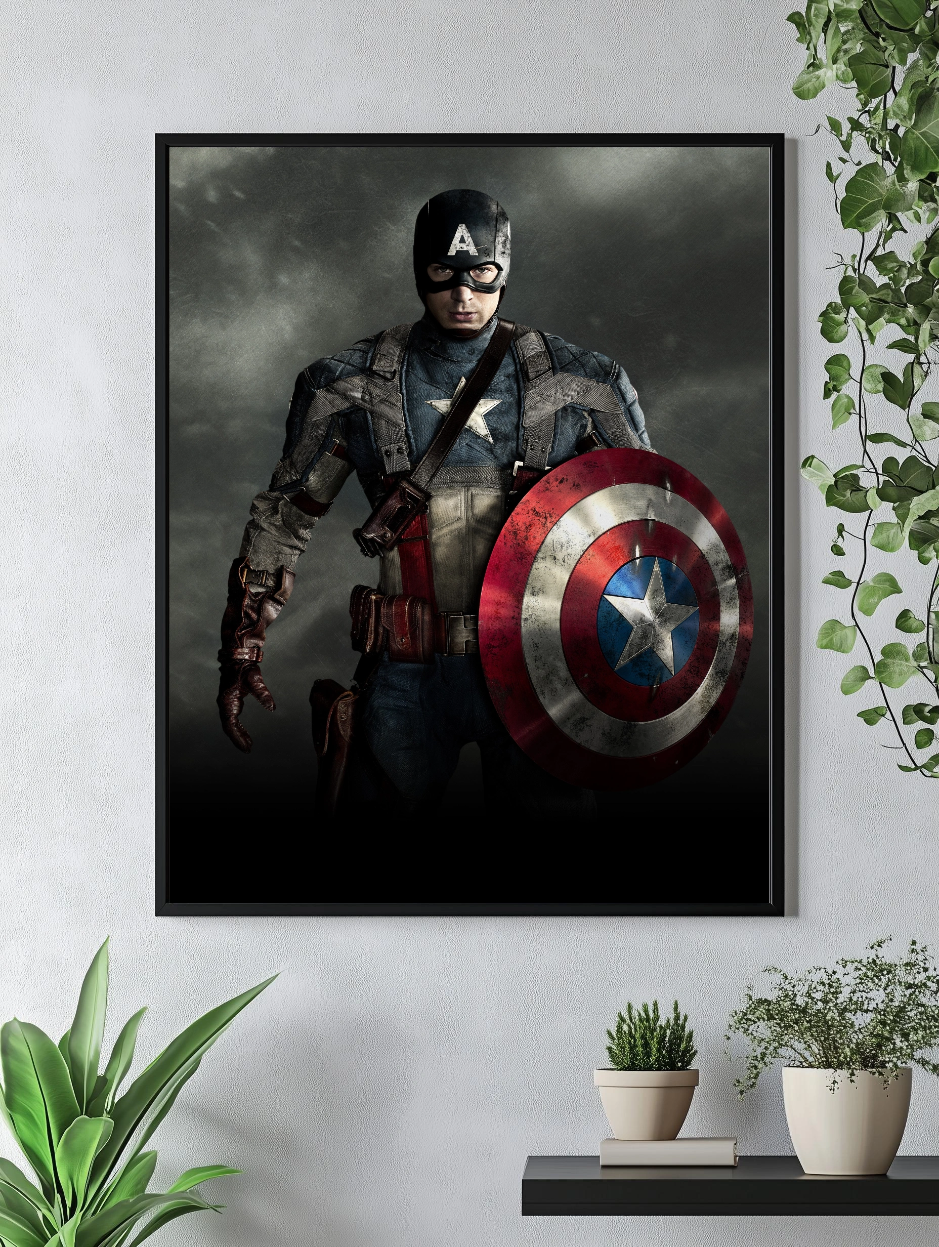 Изображение знаменитого персонажа комиксов Marvel — Капитана Америки. Герой в традиционном костюме с узнаваемым щитом на фоне мрачной текстуры, передающий атмосферу силы, мужества и готовности к бою. Идеально для современного интерьера, оформленного в стиле супергероев и киноаниме. Этот художественный плакат служит стильным декором стен и уникальным интерьерным искусством.