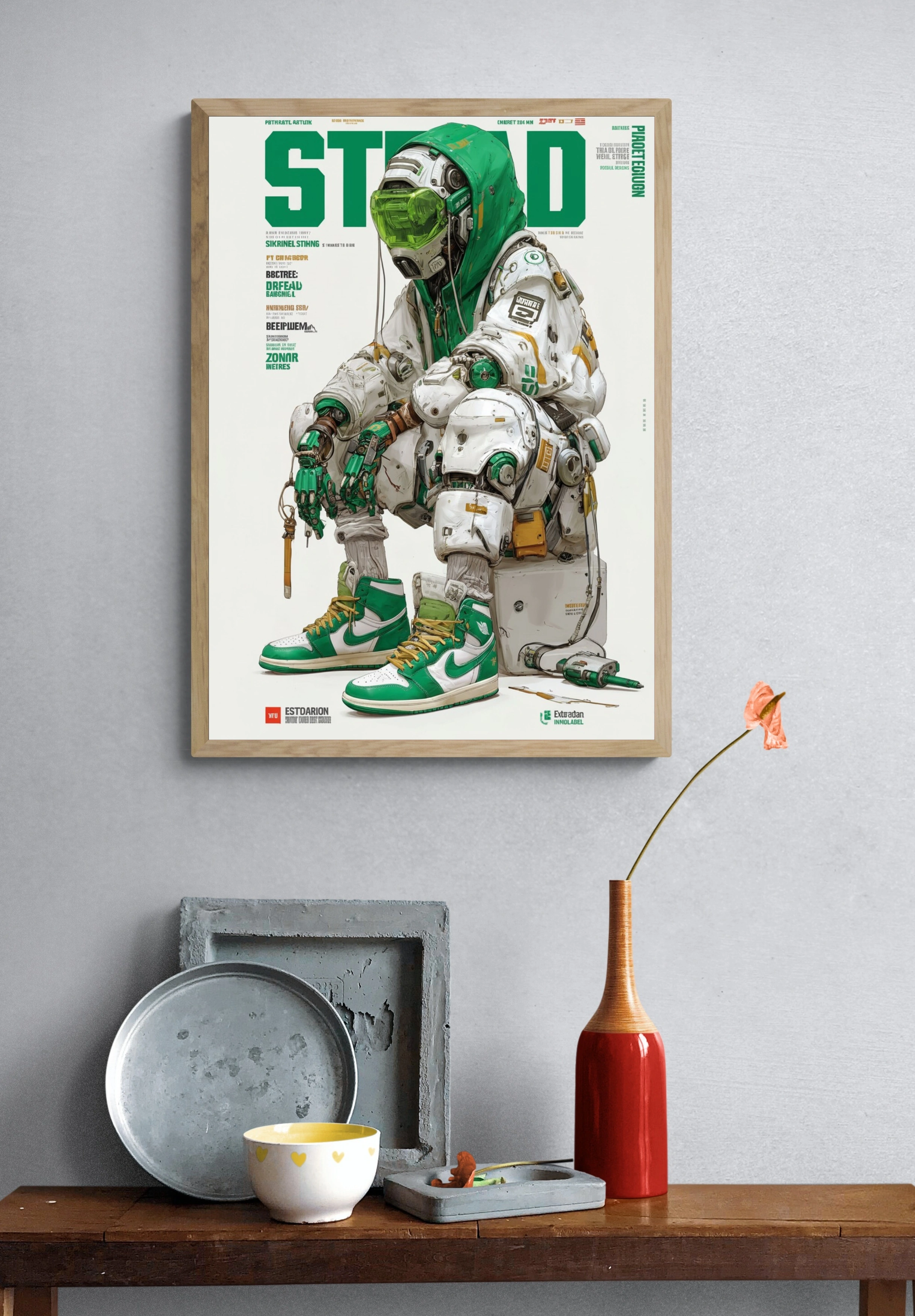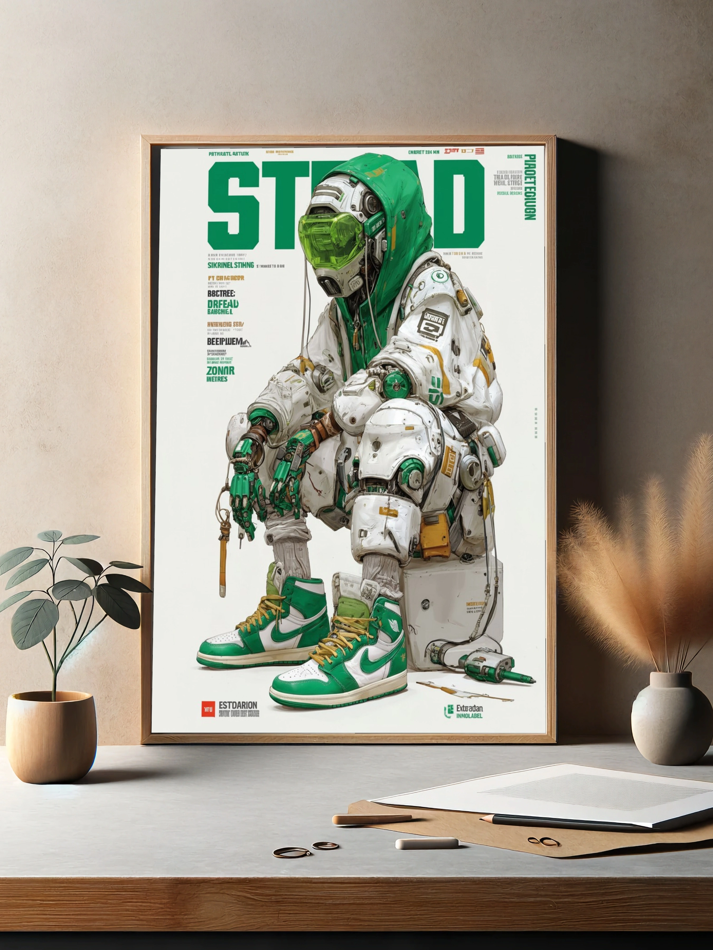 Погрузитесь в мир киберпанка с этим уникальным постером, на котором изображён персонаж в футуристическом костюме. Он сидит на корточках, демонстрируя детали своего экзоскелета, выполненного в белом и зелёном цветах. Яркие кроссовки Nike с белыми и зелеными акцентами добавляют динамики и стиля. На фоне — минималистичный светлый цвет, который подчеркивает детали костюма и обуви. Постер наполнен атмосферой технологического прогресса и уличной культуры, что делает его идеальным для молодежных пространств. Отлично подойдет для оформления офисов, креативных студий или молодежных комнат, привнося в них дух инноваций и свободы.