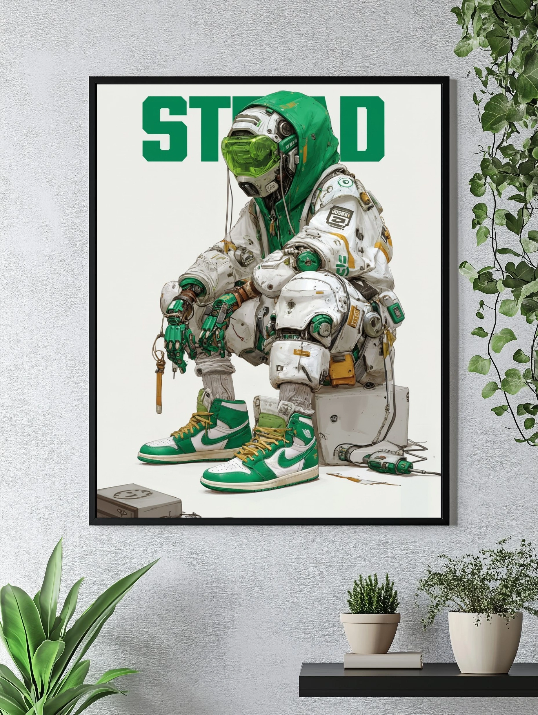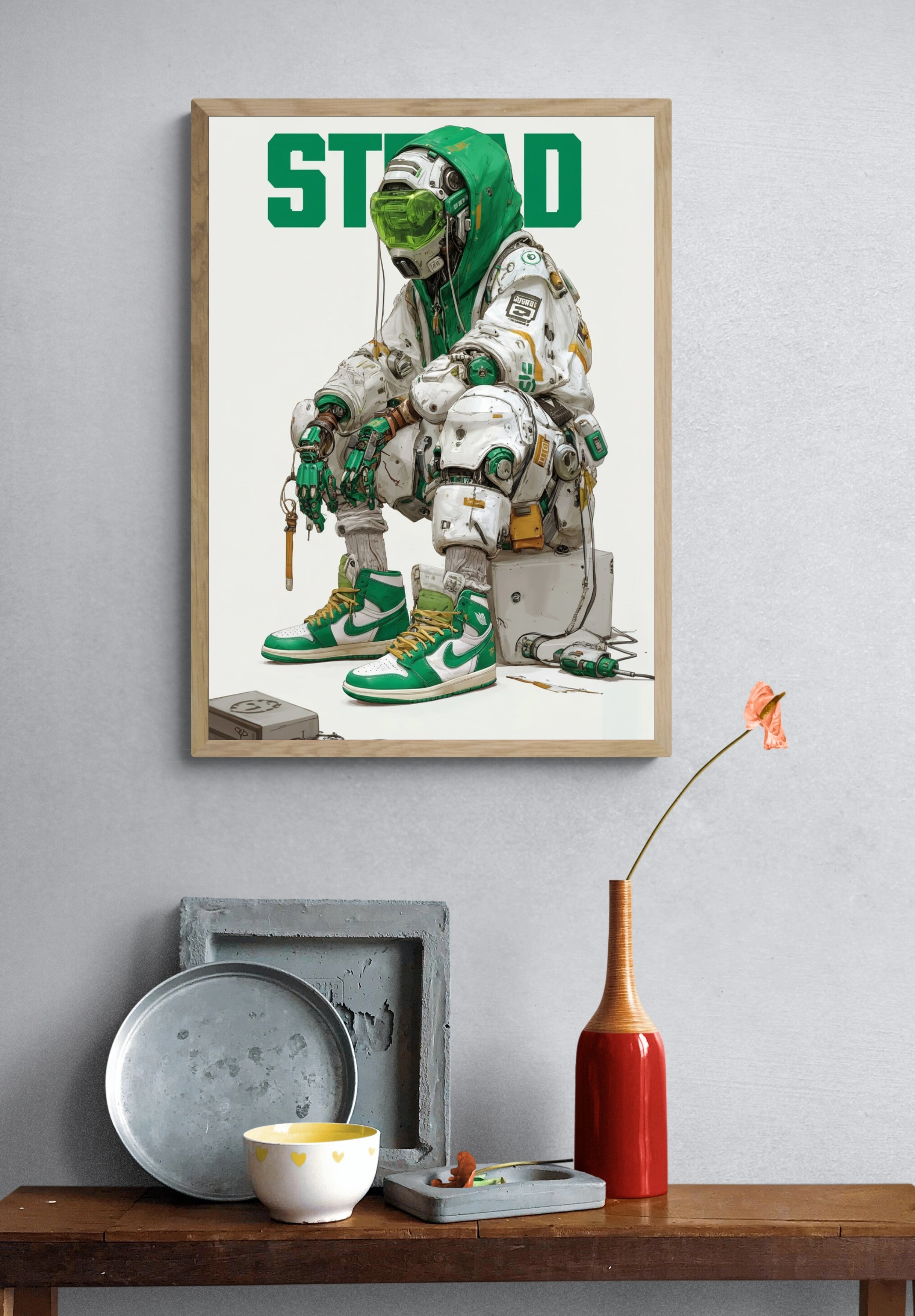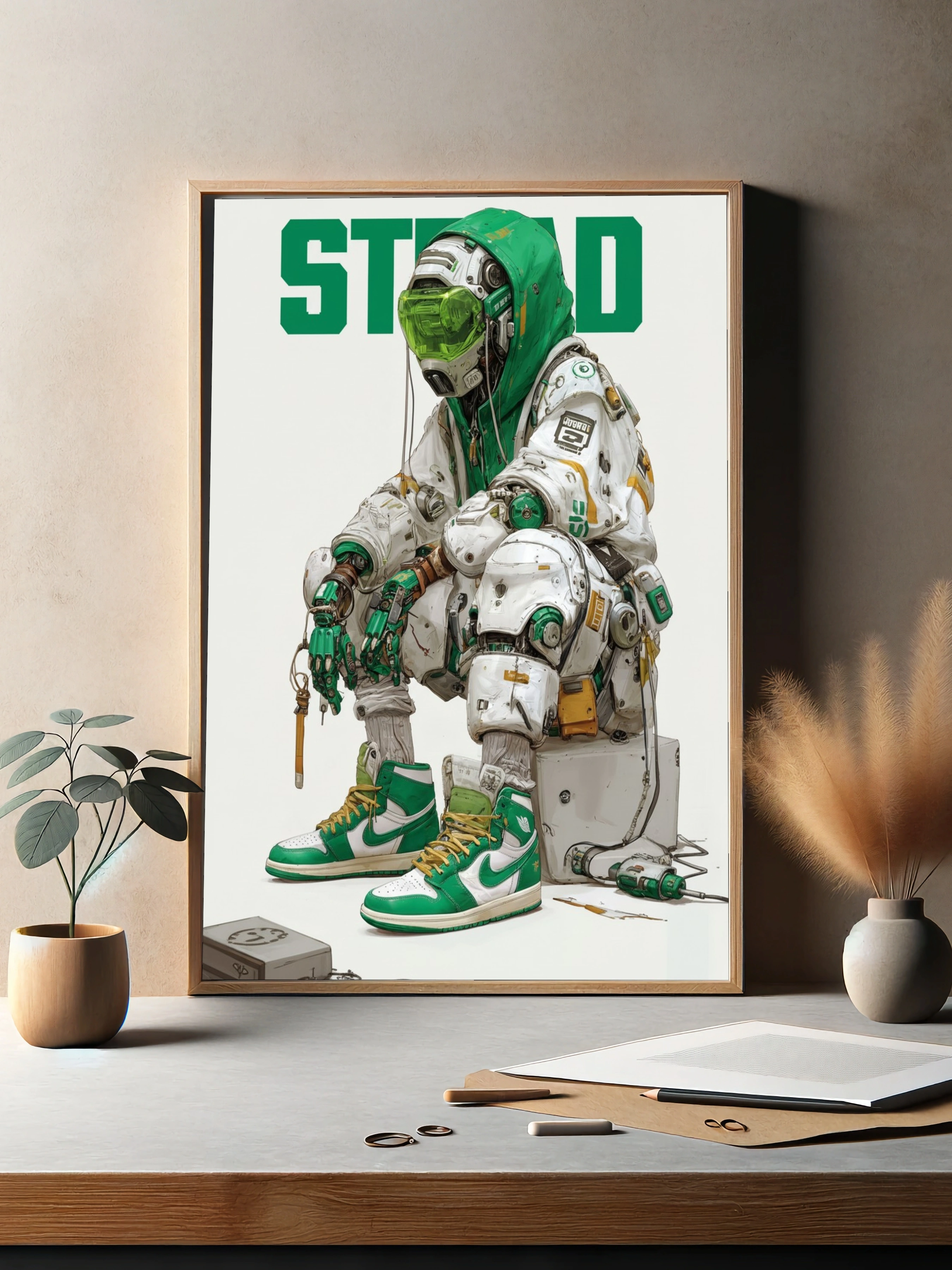 Погрузитесь в мир киберпанка с этим уникальным постером, изображающим загадочного персонажа в футуристическом костюме. Он сидит на корточках, обвешанный технологическими деталями, с яркими зелеными акцентами на белом фоне. На его ногах — стильные кроссовки Nike, которые идеально дополняют образ. Персонаж с защитной маской и капюшоном создает атмосферу таинственности и современности. Яркие зеленые и белые цвета подчеркивают динамичность и энергичность, а крупные буквы ‘STEAD’ добавляют графический акцент. Этот постер станет отличным дополнением для молодежной комнаты, офиса или креативного пространства, привнося в него дух инноваций и стиля.