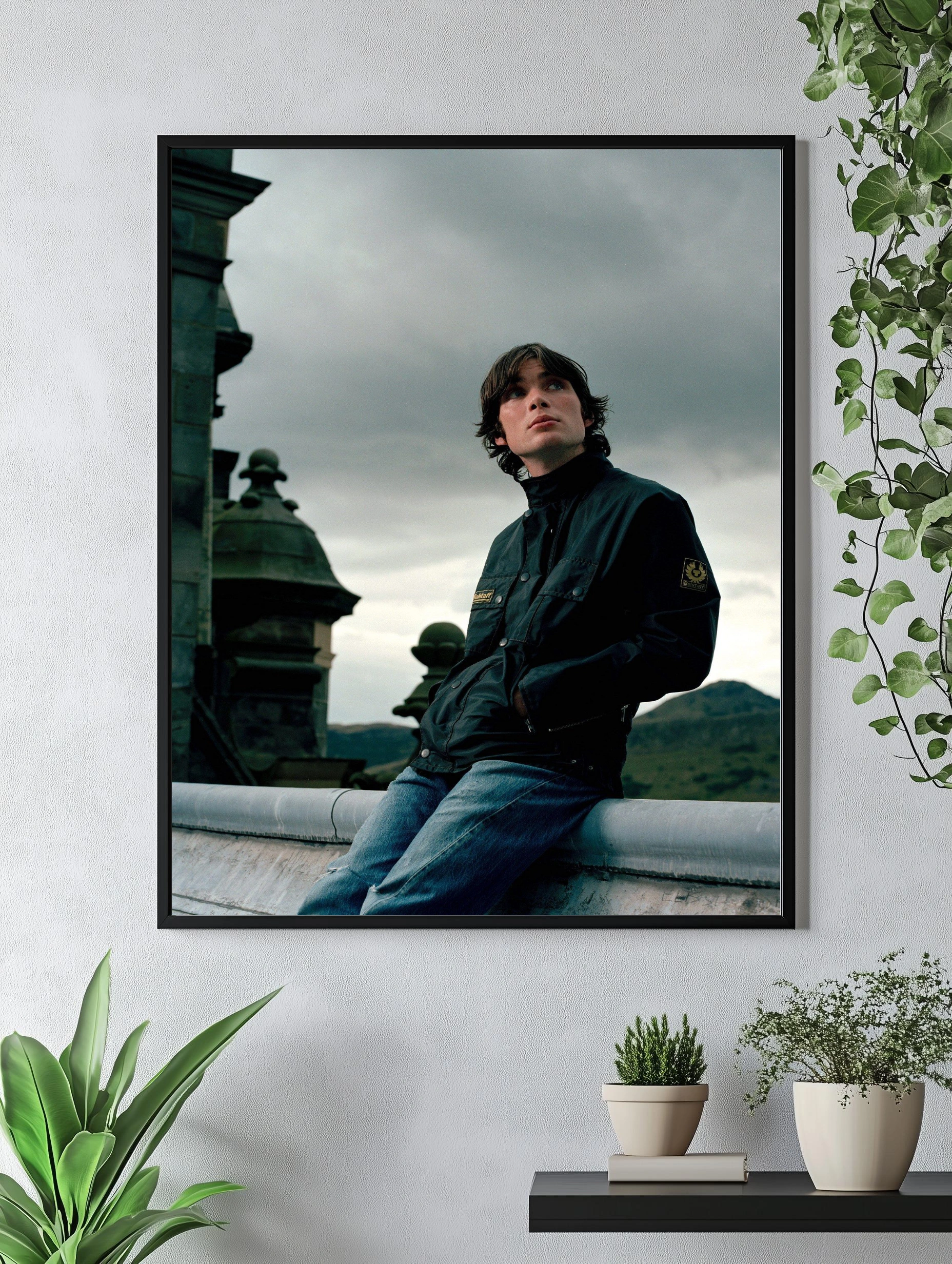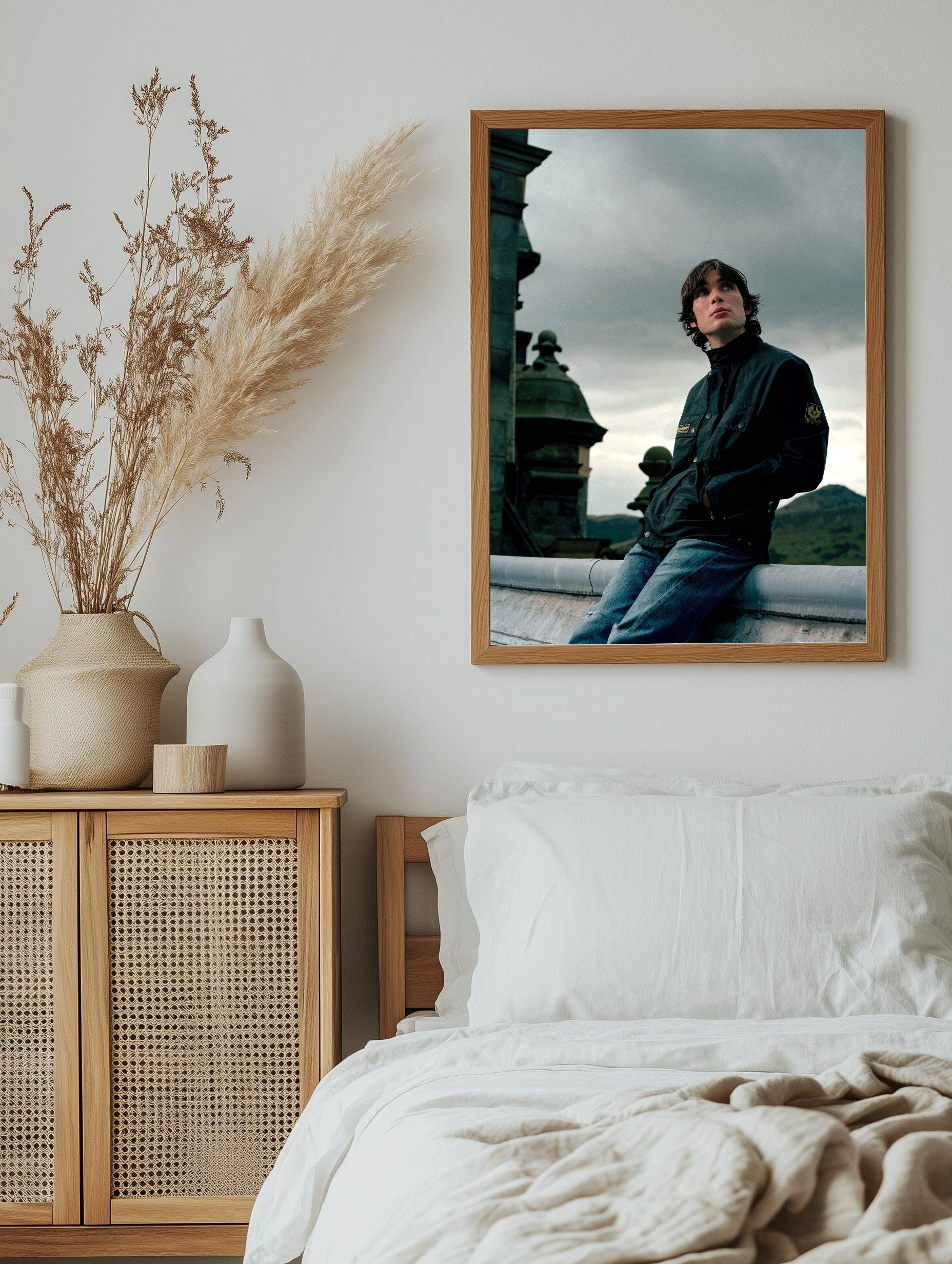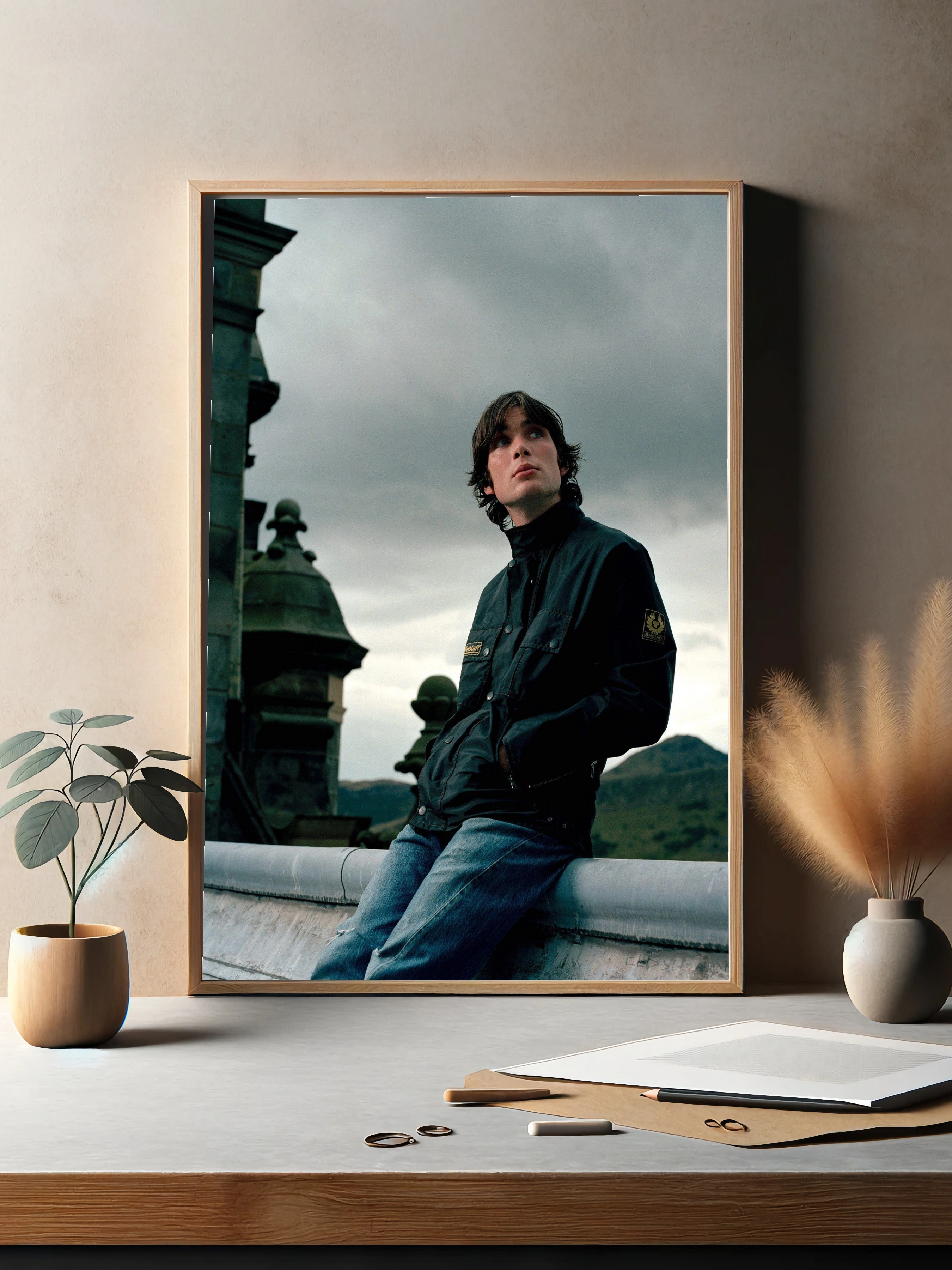 На изображении молодой человек в черной куртке и синих джинсах сидит на парапете под пасмурным небом. Фон представляет собой сочетание архитектурных элементов и горного пейзажа. Атмосфера спокойствия и задумчивости, сочетающая городской и природный мотив. Стиль фотографии современный и минималистичный, подходит для интерьерного искусства и художественных фотопостеров.