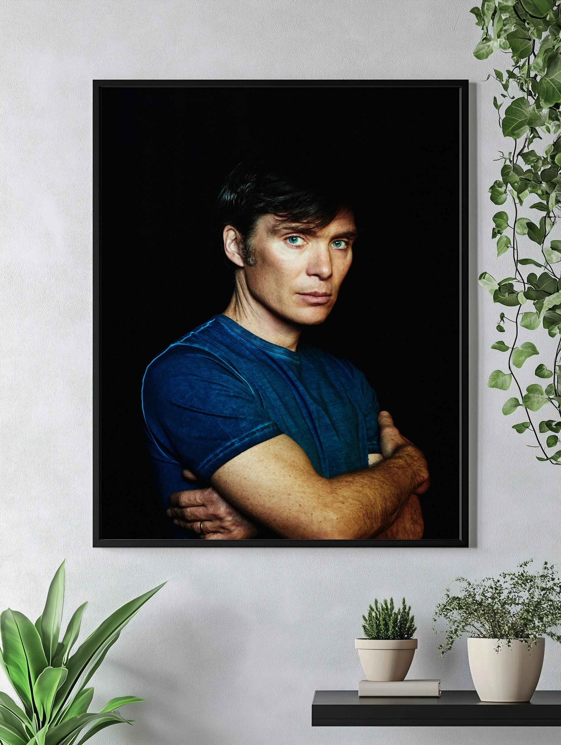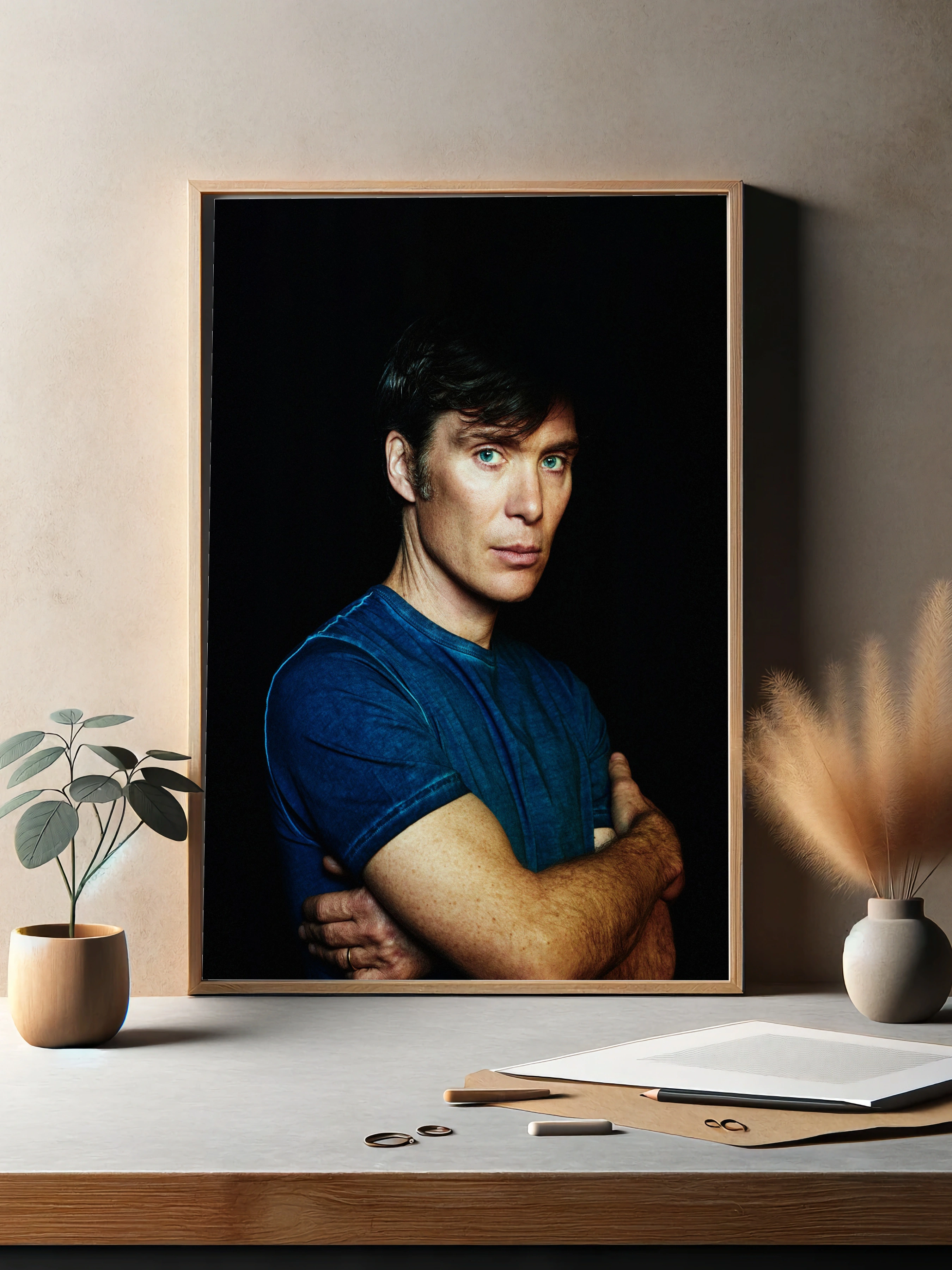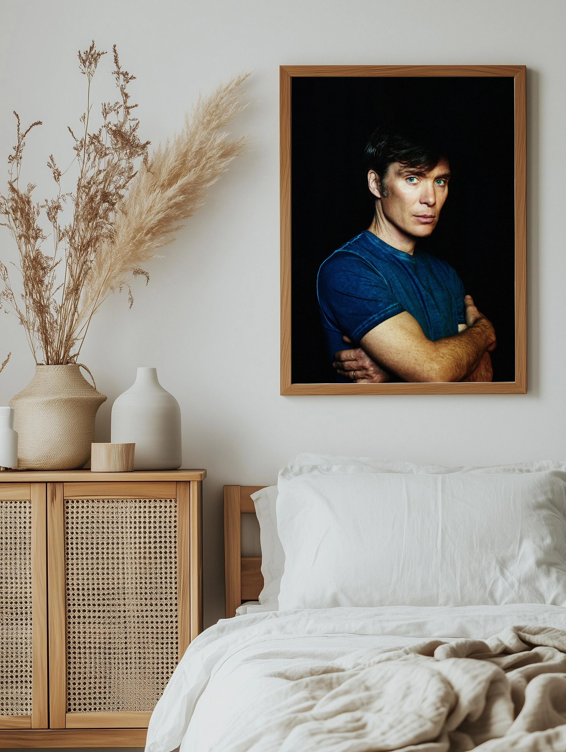Изображение представляет собой художественный портрет Чарльза Маккалоу на тёмном фоне, подчёркивающем его выразительные голубые глаза и сдержанную мимику. Стиль фотографии — чёткий и эмоциональный, цвета усилены для контраста, создавая эффект глубины и загадочности. Такой декоративный плакат идеально подойдёт для современного интерьера гостиной или кабинета, добавляя атмосферу сосредоточенности и силы. Это фотопостер, стильный декор стен и уникальное интерьерное искусство для дома.