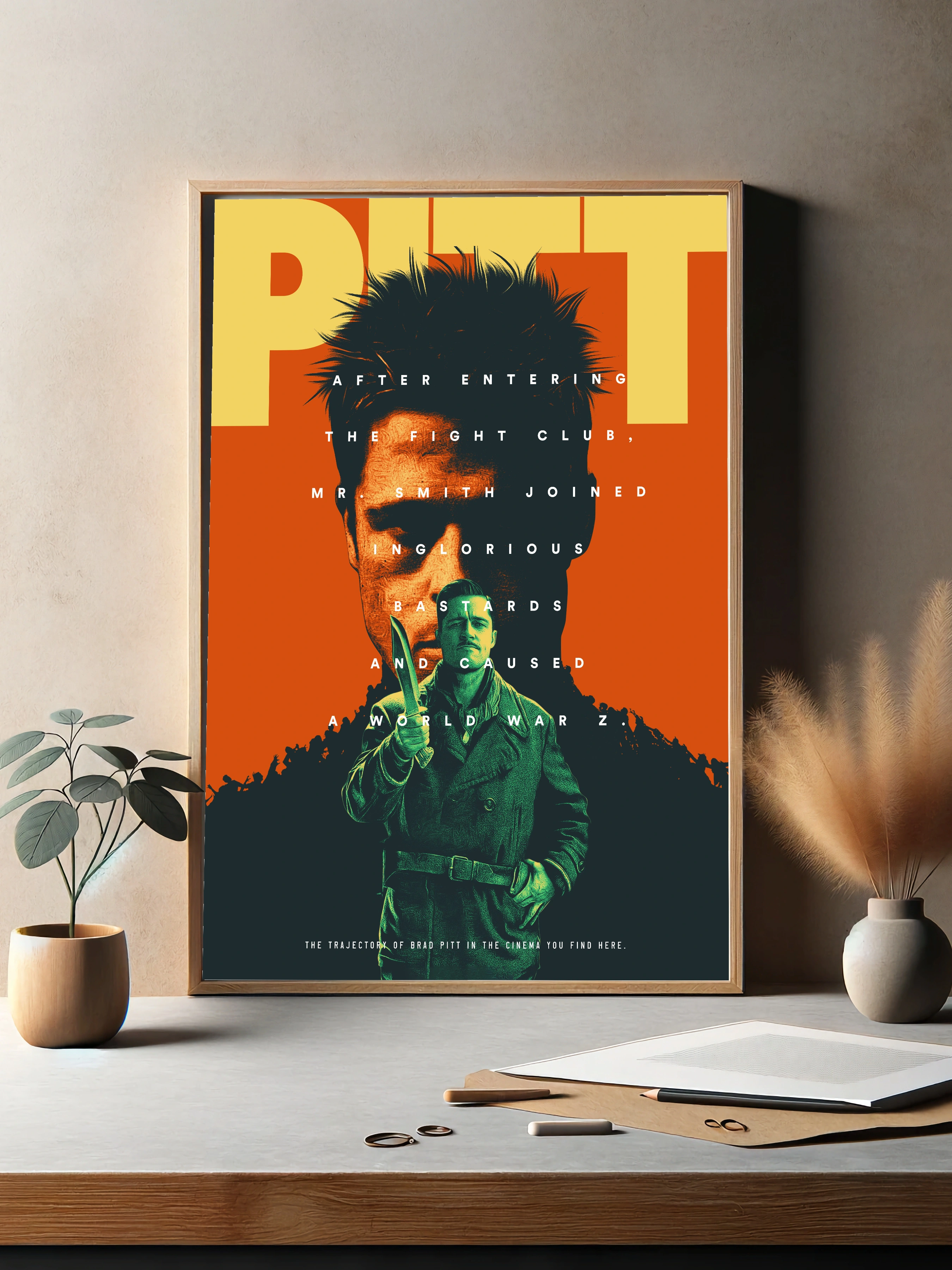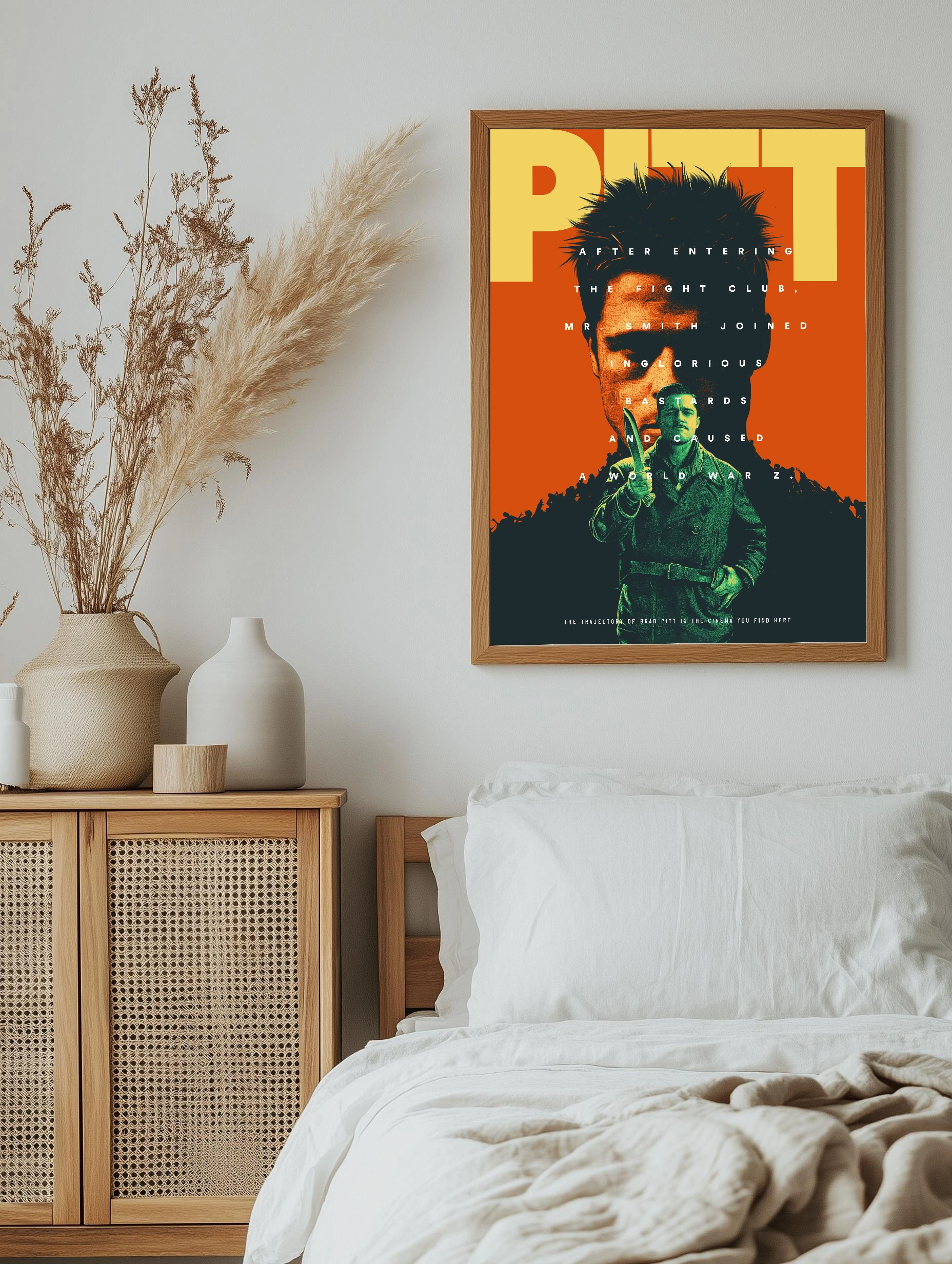 Декоративный плакат с изображением актера Брэд Питт на фоне насыщенных оранжевых и желтых тонов. Композиция выполнена в стиле современного искусства с акцентом на выразительный портрет и кинематографическую атмосферу. Отличный выбор для интерьера гостиной, спальни или офисного пространства.