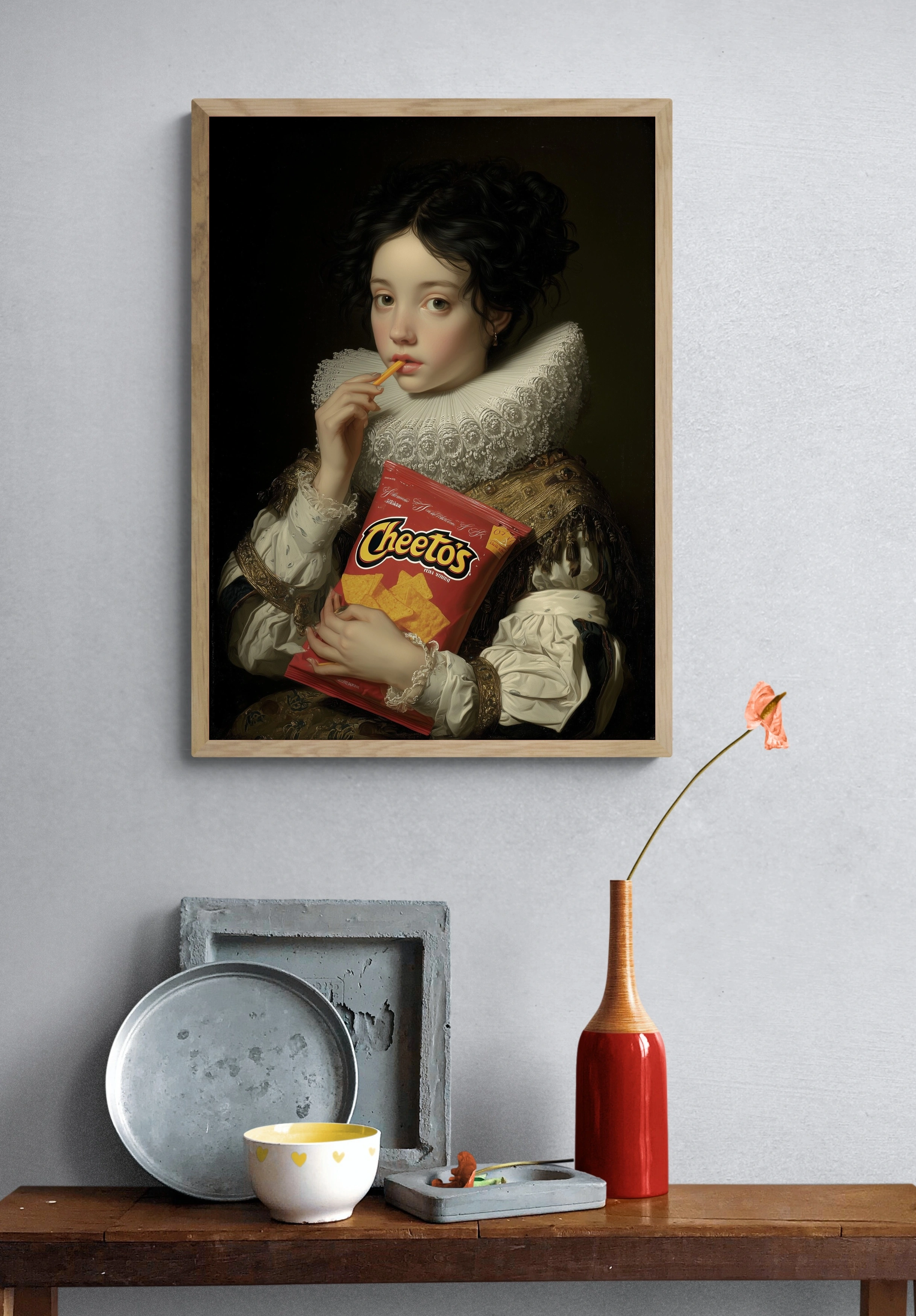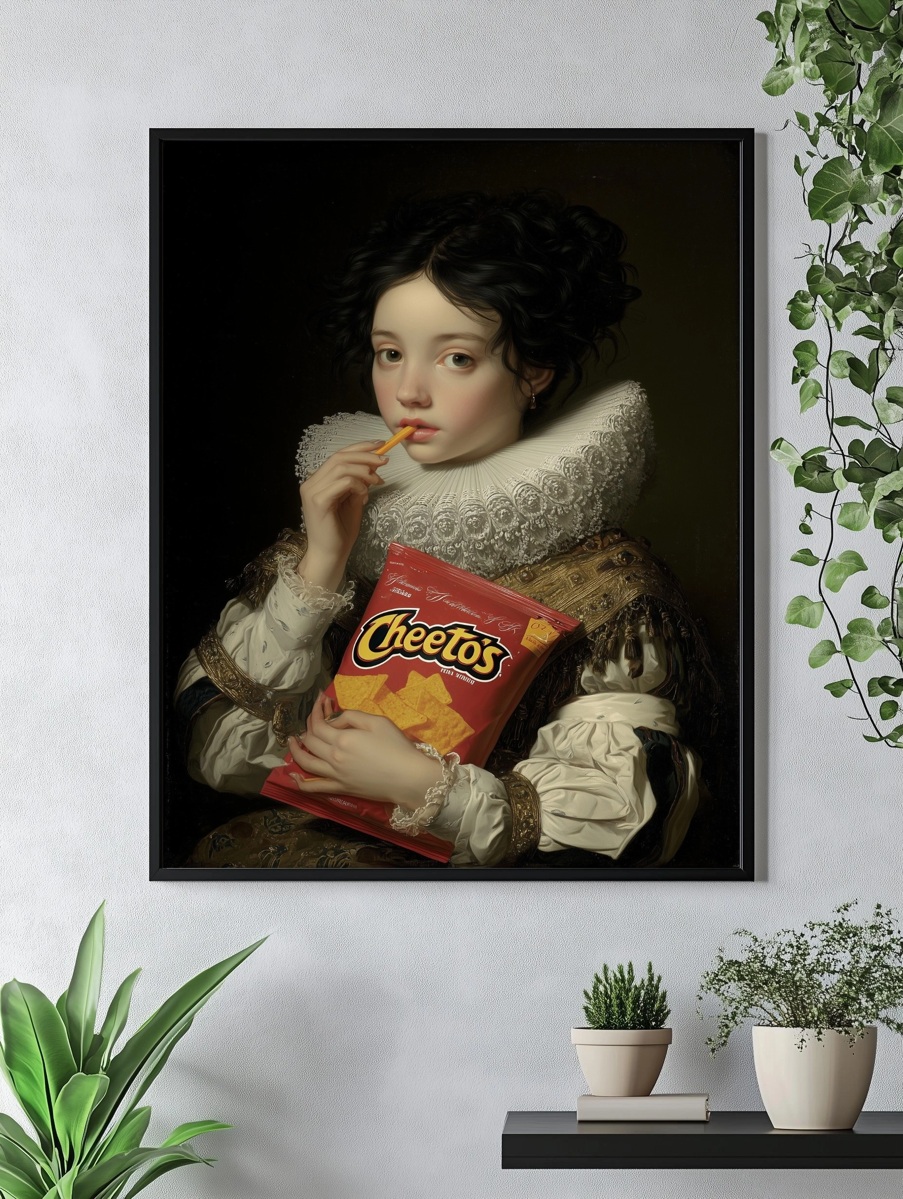 Этот уникальный постер сочетает в себе элементы классического искусства и современного поп-культуры. На картине изображена молодая девушка с выразительными глазами и нежным лицом, которая с интересом смотрит на зрителя, держа в руках пакет с закусками Cheetos. Её наряд в стиле барокко, украшенный сложной кружевной горжеткой и роскошными деталями, создает контраст с ярким красным пакетом, на котором крупно написано ‘Cheetos’. Цветовая гамма включает глубокие черные и золотые оттенки, что придает изображению атмосферу загадочности и элегантности. Этот постер станет отличным акцентом в интерьере, добавляя нотку иронии и современности в любую комнату — будь то гостиная, кухня или офис. Он идеально подойдет для молодежной аудитории и креативщиков, которые ценят оригинальность и стиль.