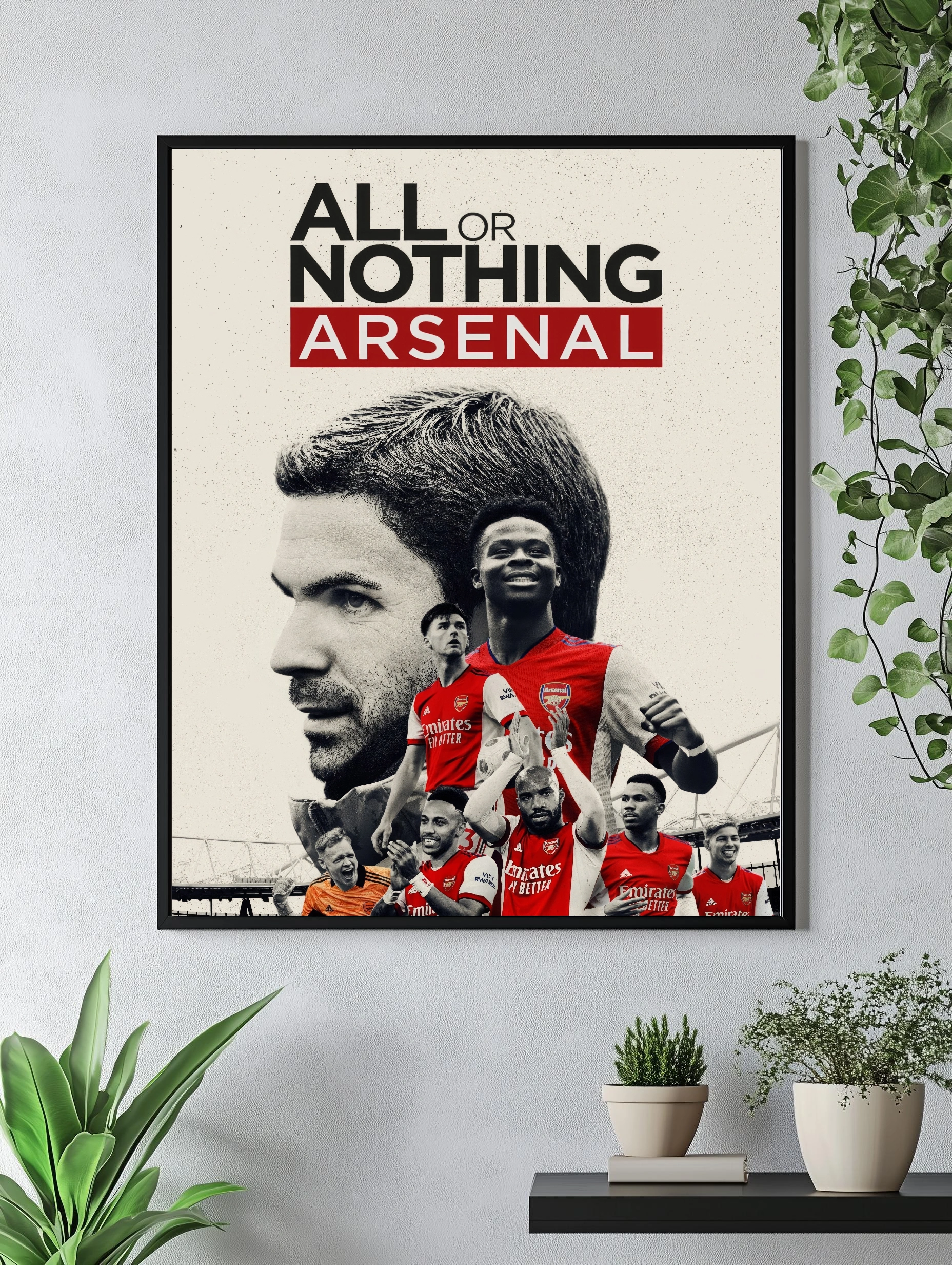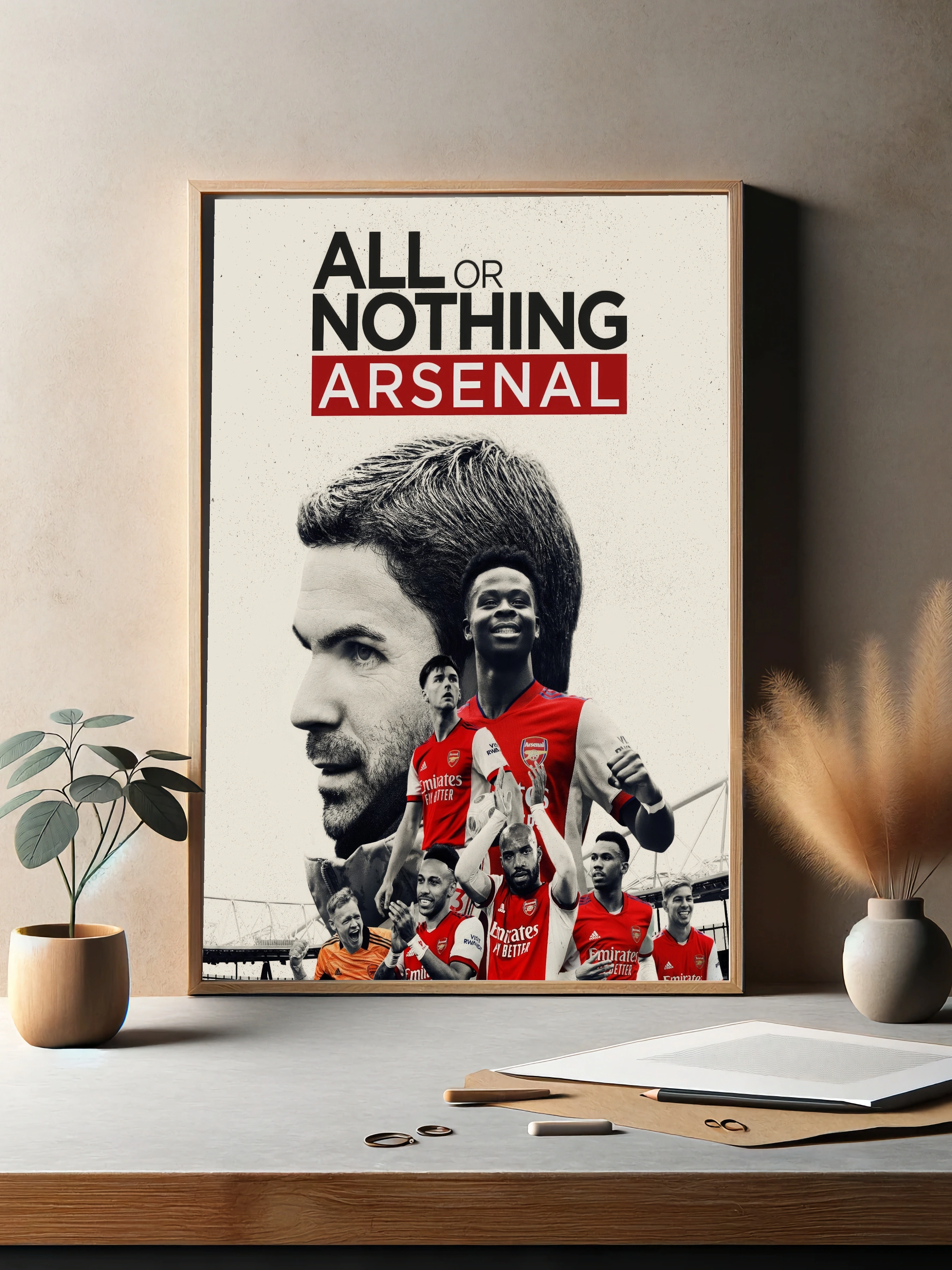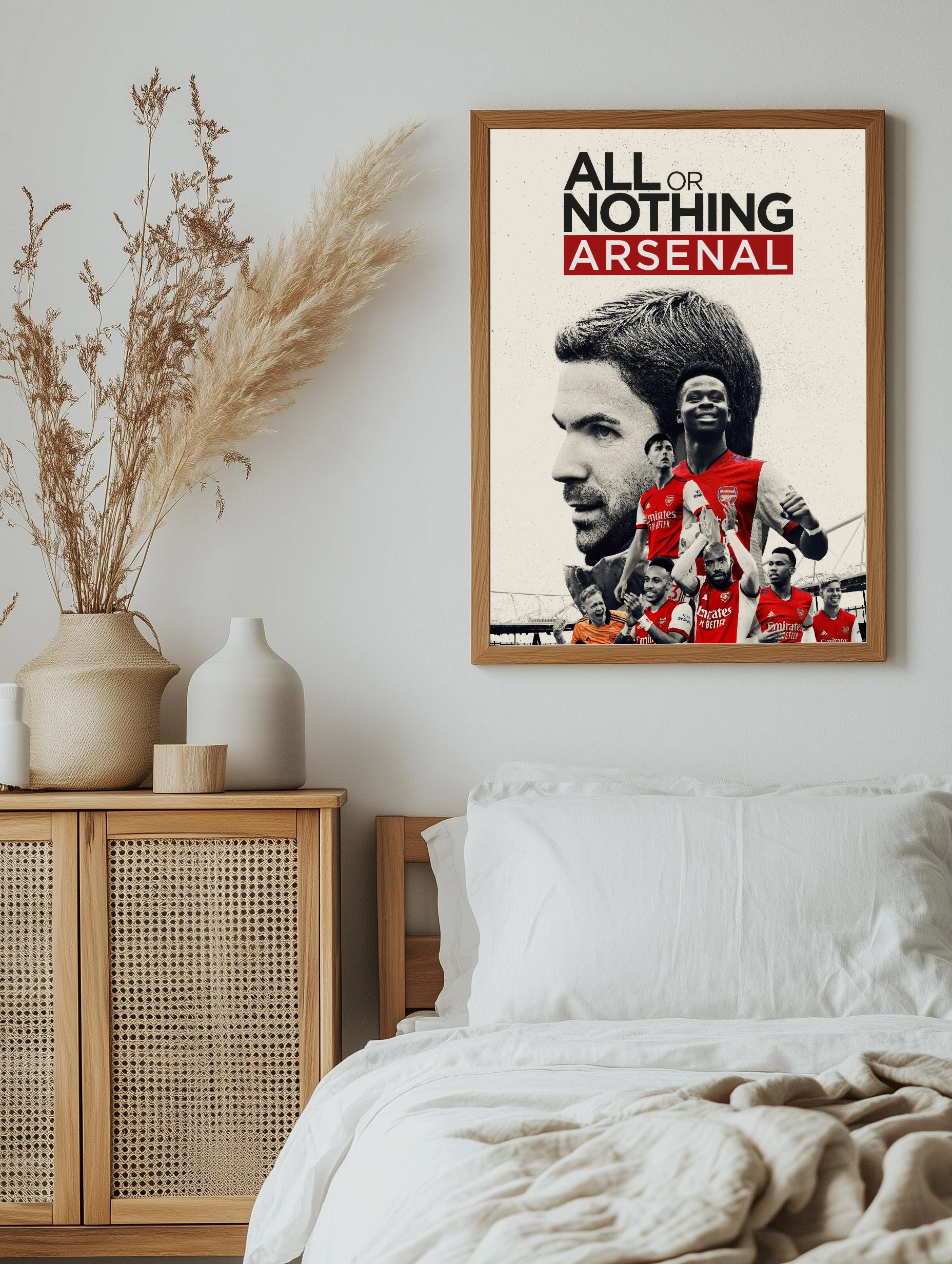 Этот интерьерный постер посвящён легендарному клубу Арсенал — изображены ведущие футболисты и тренер команды на фоне логотипа и слогана «All or Nothing Arsenal». Яркий красный цвет формы выделяет игроков, создавая динамику и вдохновляющую атмосферу. Современное искусство для стен фанатов футбола и любителей стильного декора.