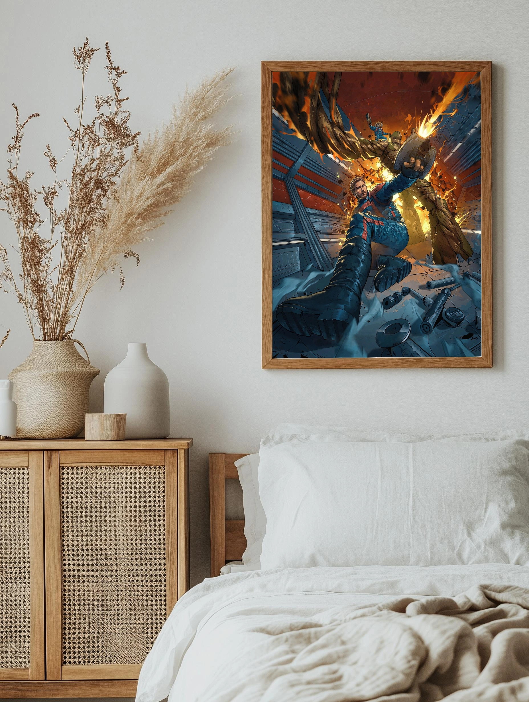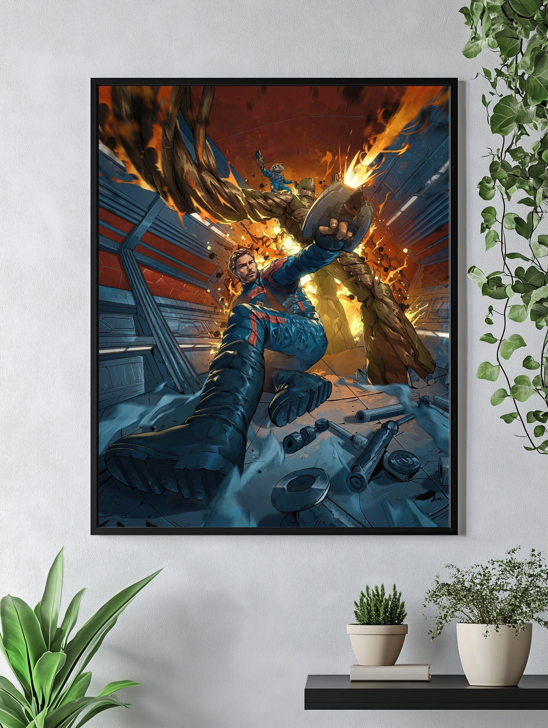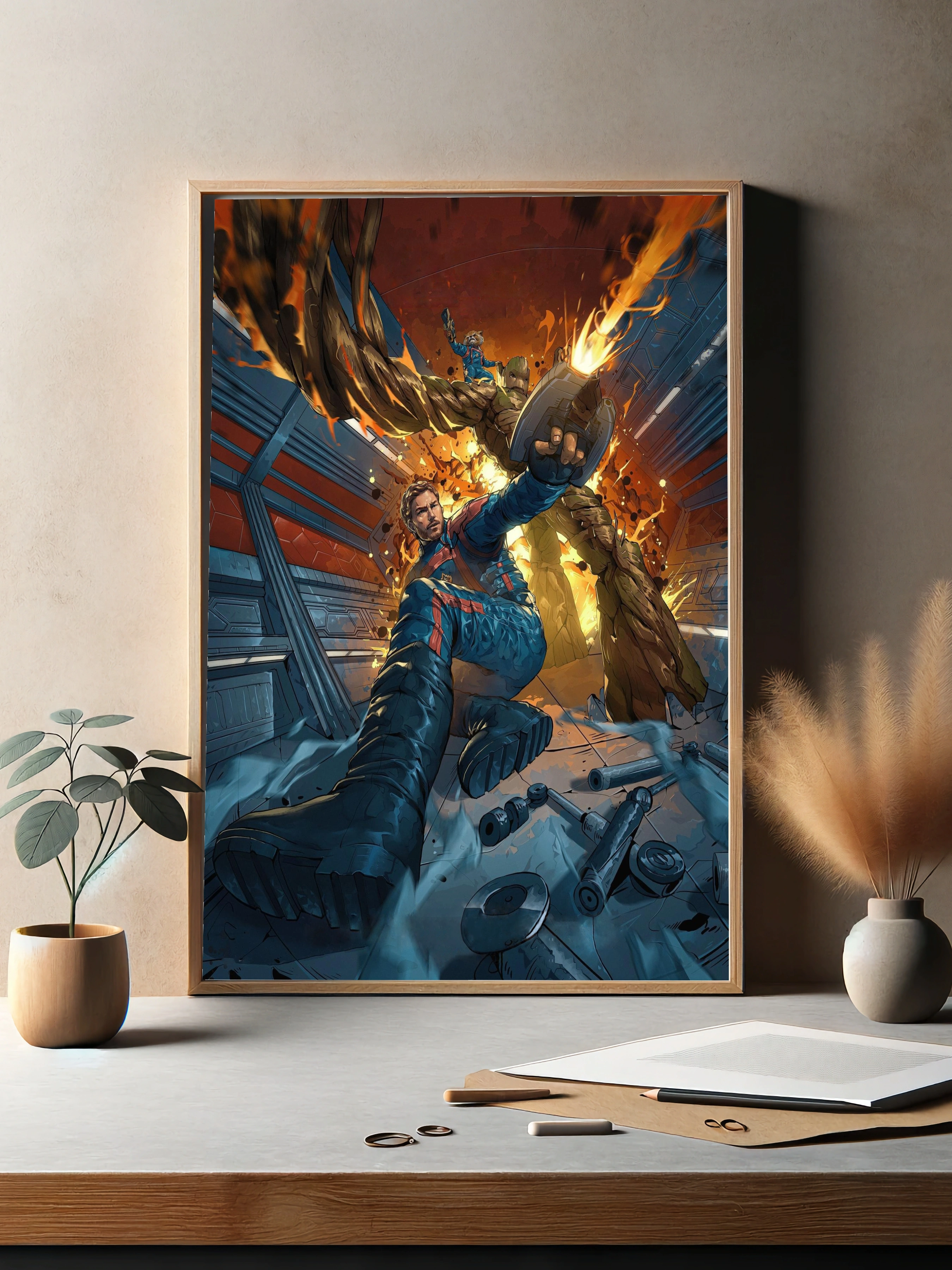 Яркая и динамичная картина на холсте, изображающая персонажей из фильма «Стражи Галактики» — Грута, Ракету и Звёздного Лорда в эпическом боевом моменте. Художественный плакат выполнен в насыщенных синих, коричневых и оранжевых тонах, создавая атмосферу космического приключения и героизма. Идеально подходит как интерьерный постер для гостиной, спальни или офиса, добавляя уникальный стильный декор стен.