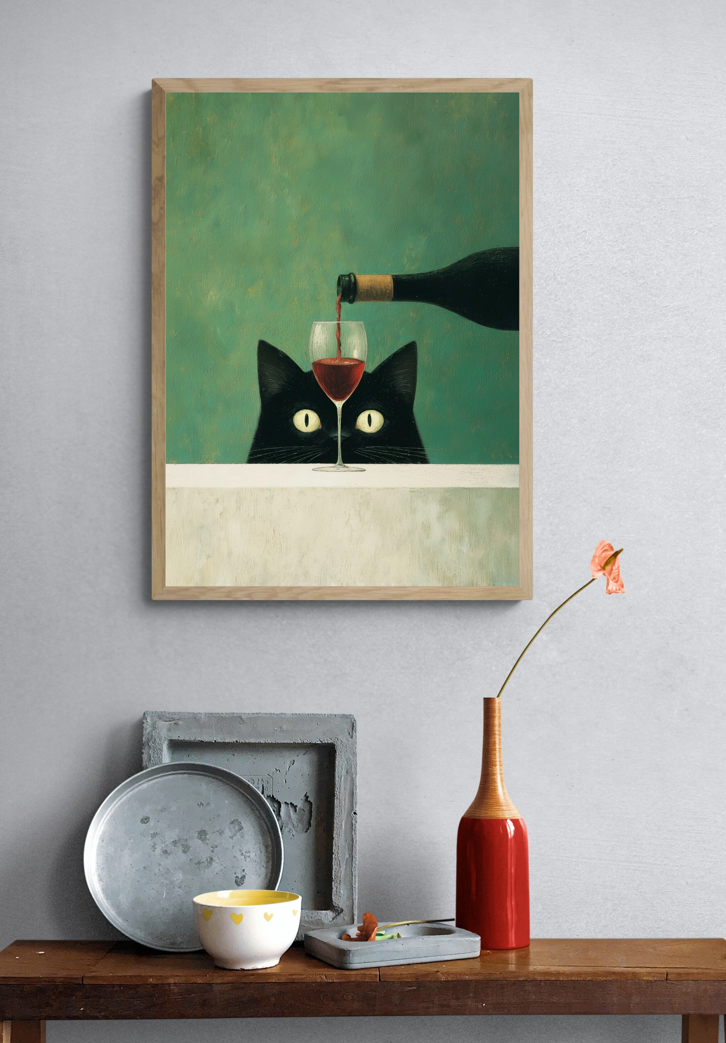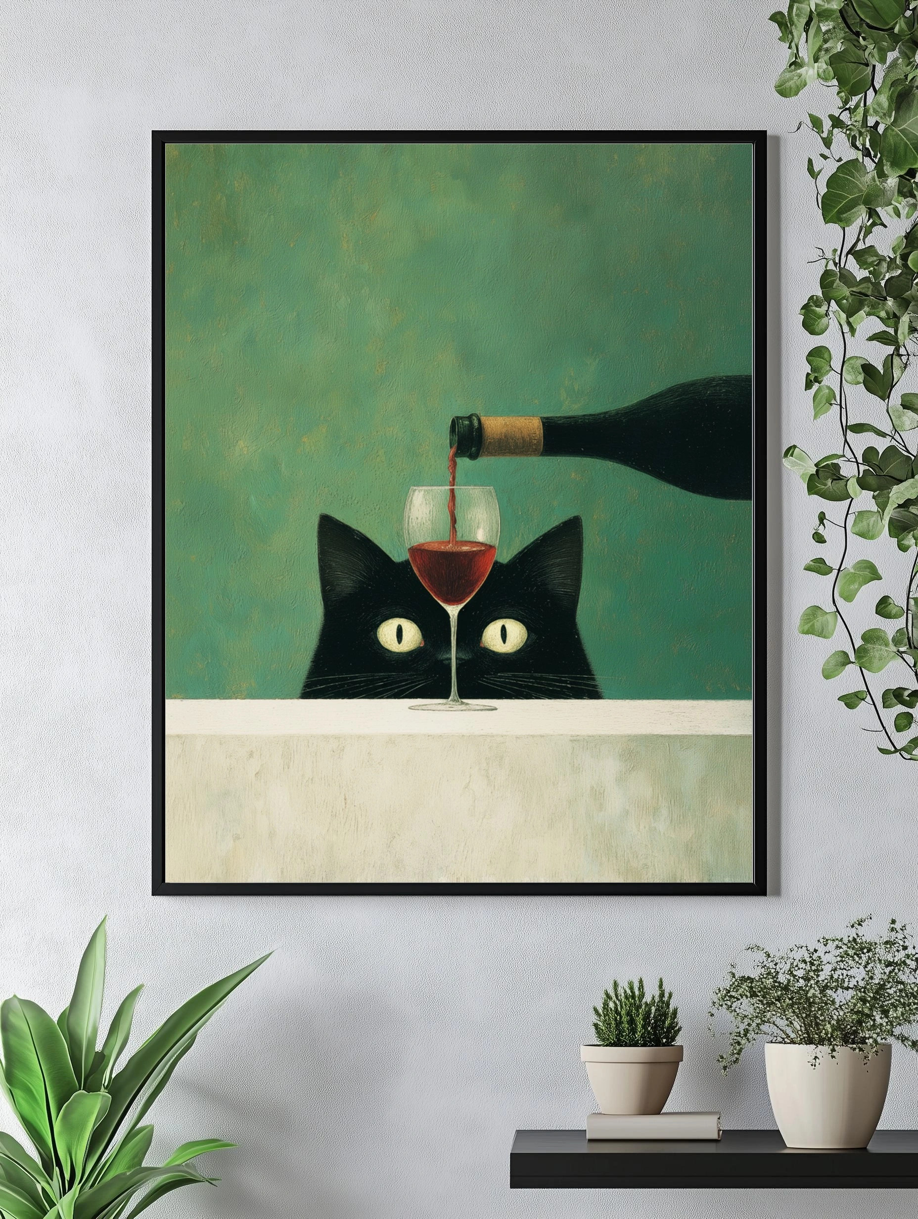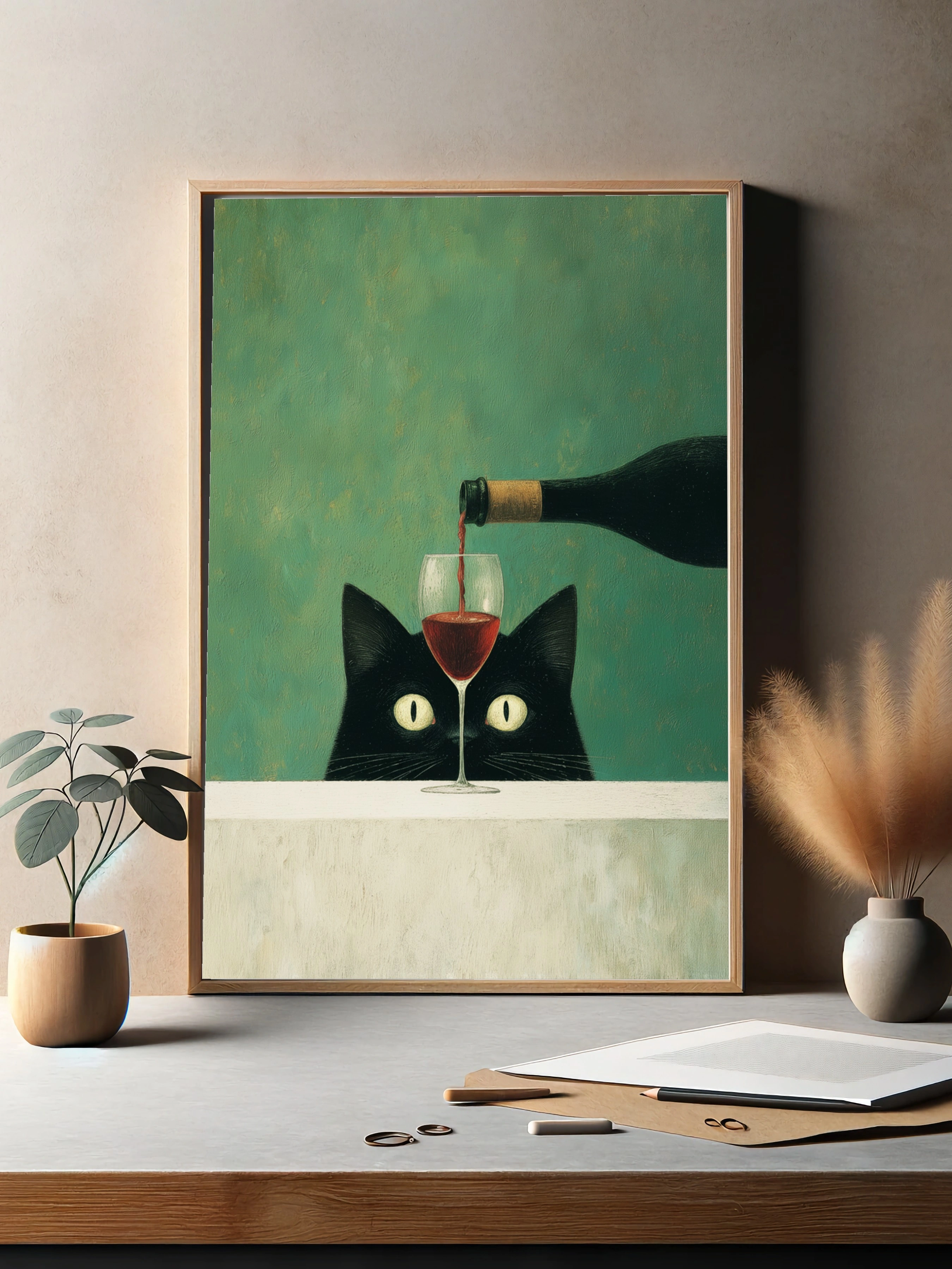 Этот постер привлекает внимание своим игривым сюжетом: черный кот с большими желтыми глазами, выглядывающий из-за стола, наблюдает за тем, как в бокал наливают красное вино. Эмоции животного передают любопытство и игривость, создавая атмосферу легкости и веселья. Фон выполнен в нежных бирюзовых оттенках, которые гармонично контрастируют с черным цветом кота и насыщенным красным вином. Стиль картины можно охарактеризовать как современный и немного абстрактный, что делает ее идеальным акцентом для любого интерьера. Этот постер отлично подойдет для кухни, столовой или даже гостиной, добавляя в пространство нотку юмора и уюта. Целевая аудитория — молодые люди и семьи, любящие животных и оригинальный декор.