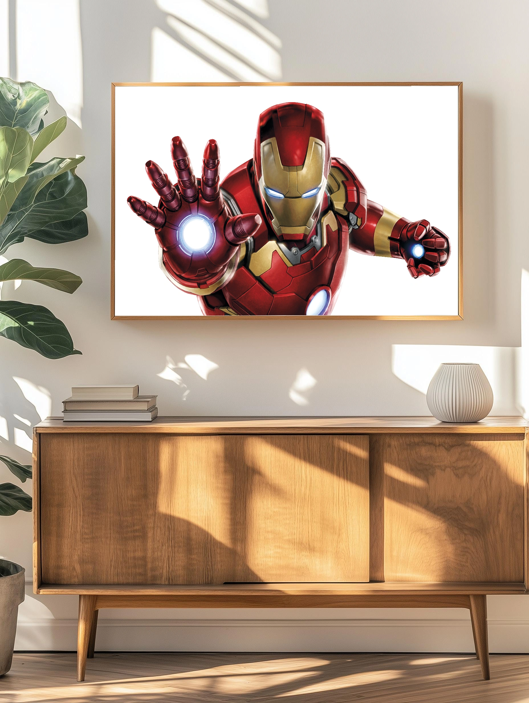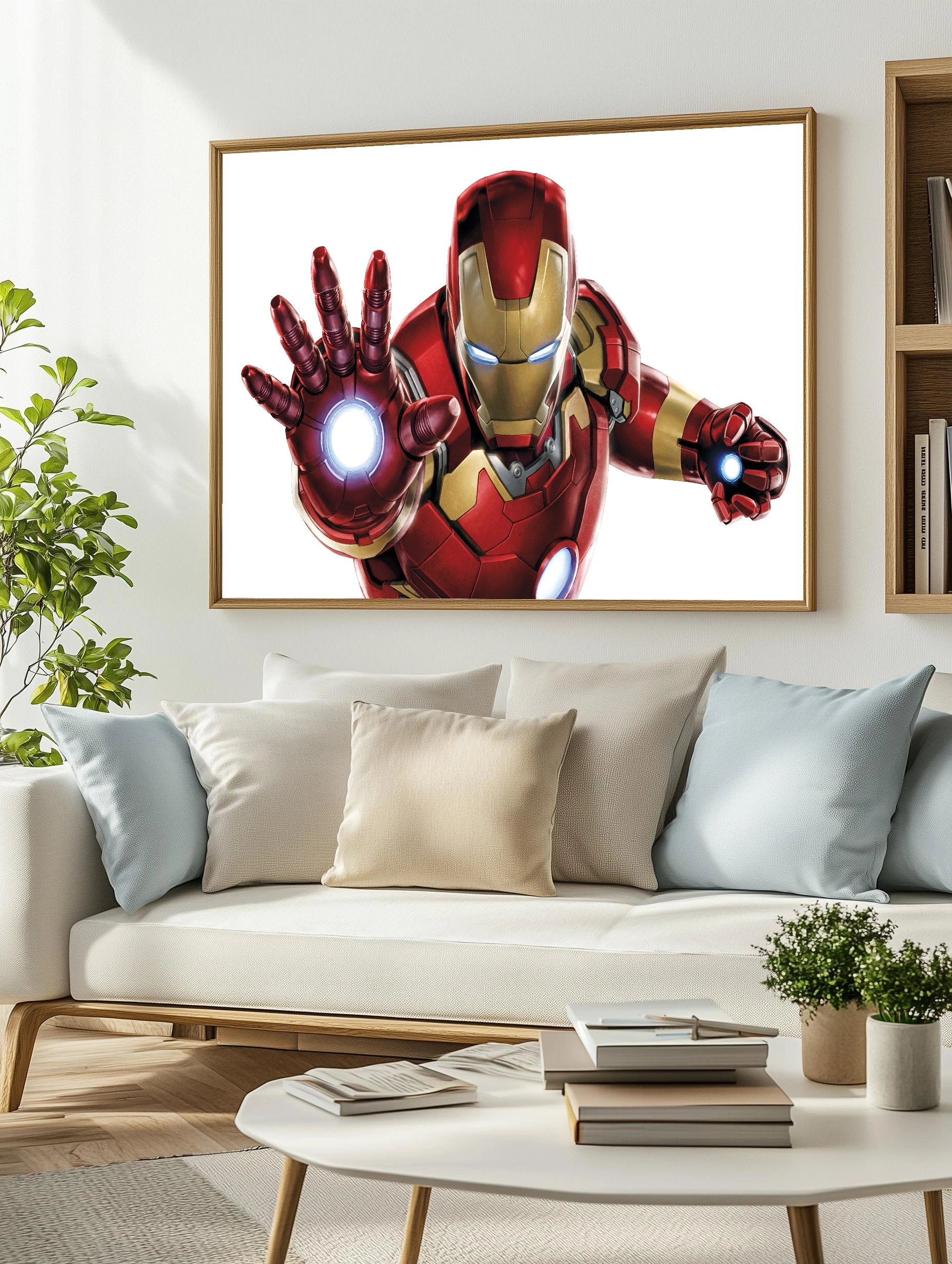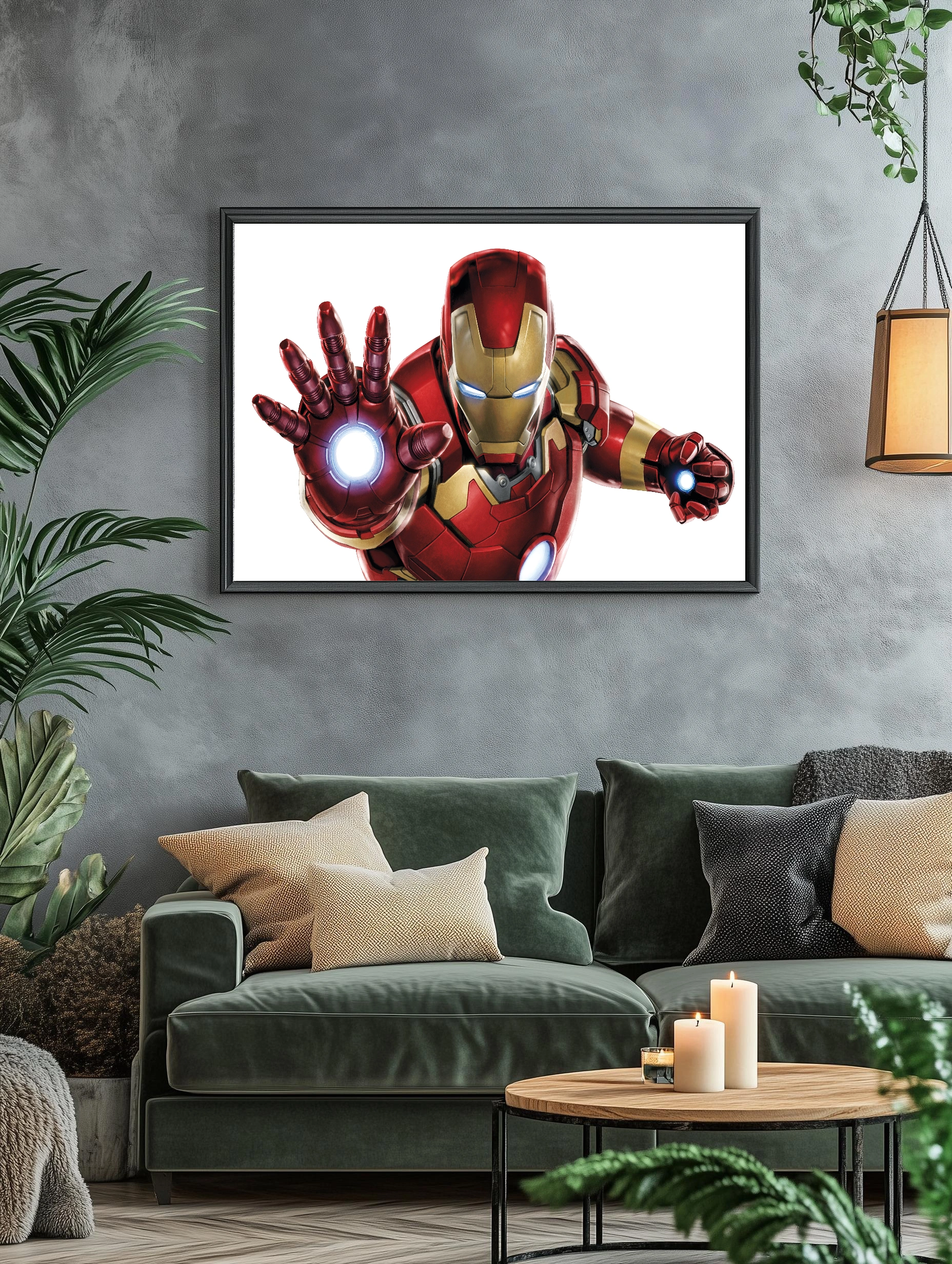 Изображён известный персонаж Marvel Железный человек в классическом красно-золотом костюме с эффектом свечения в ладонях и груди. Стиль изображения — реалистичная цифровая живопись с фокусом на динамике и мощи персонажа. Этот интерьерный плакат идеально подходит для фанатов супергероев и современного искусства для стен.