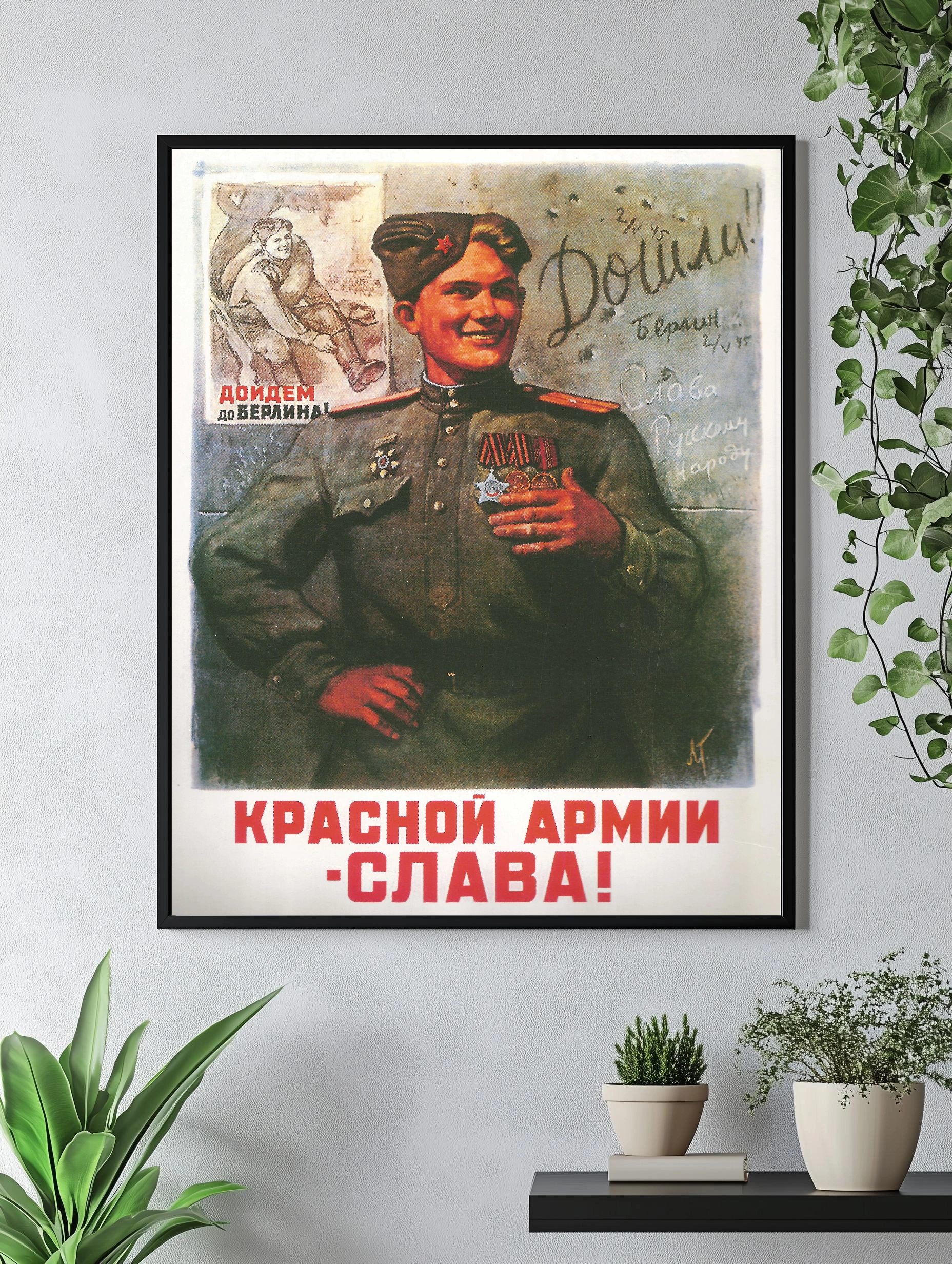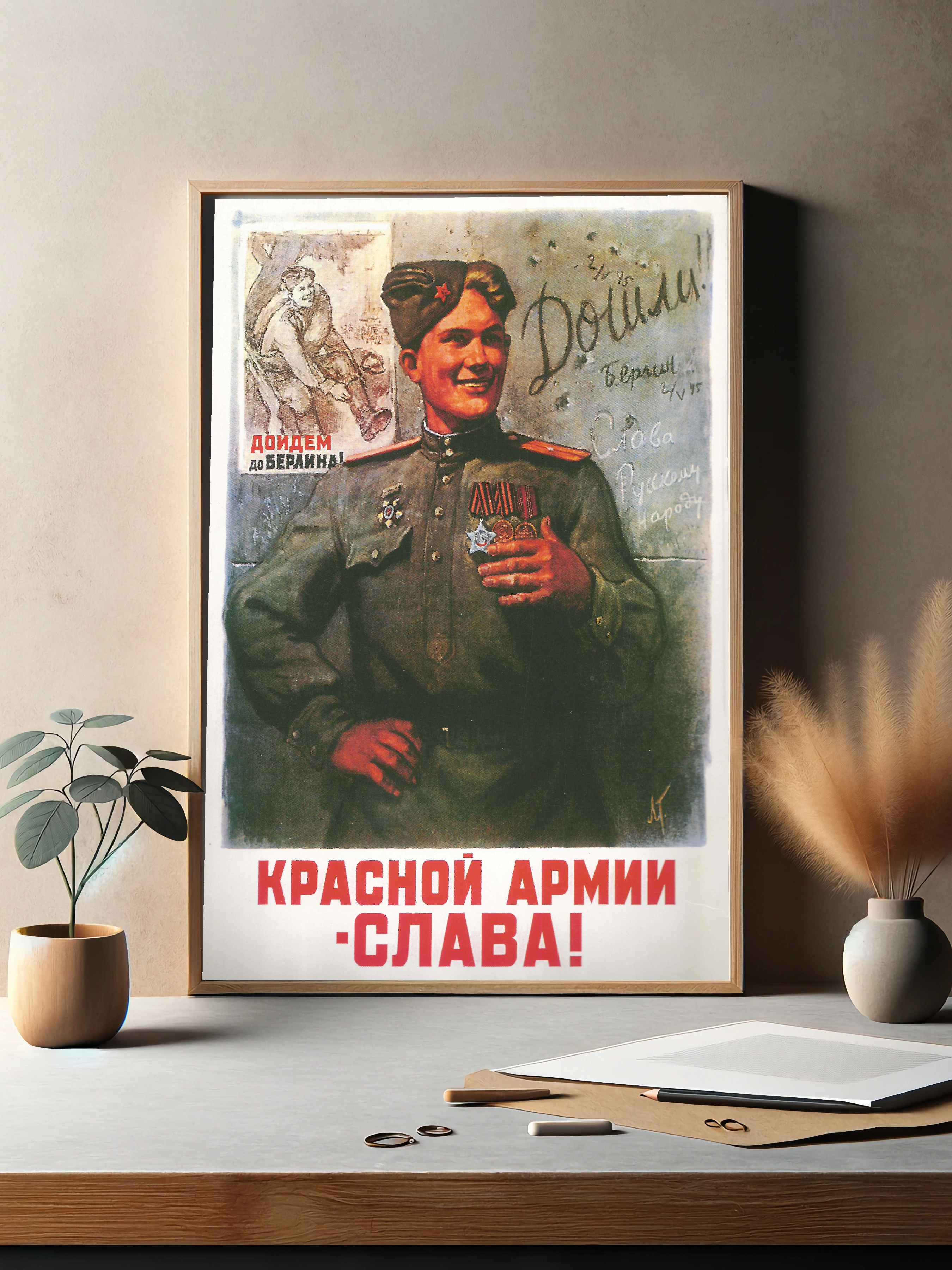 На изображении изображён советский солдат в военной форме с медалями, стоящий на фоне стены с надписями «Дойдём до Берлина» и «Слава русскому народу». Постер выполнен в стиле советской пропаганды времен Второй мировой войны, выражая патриотизм и триумф Красной Армии. Это интерьерное искусство для стен, подходящее для создания атмосферы истории и гордости.