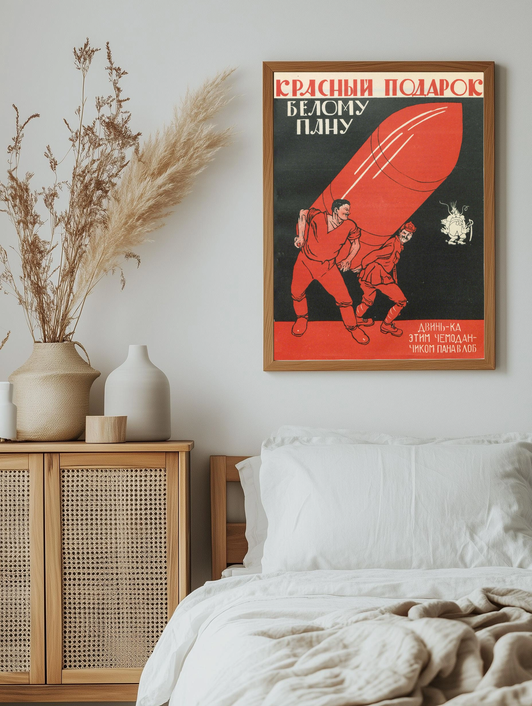 Исторический советский агитационный плакат с ярким противостоянием, изображающий двух мужчин, таскающих огромную красную ракету или снаряд на фоне тёмного фона. Текст плаката подчёркивает тему противостояния и напоминания о важности ‘красного дара’. Эта картина для гостиной отлично впишется в интерьер, добавляя колорит советского времени.