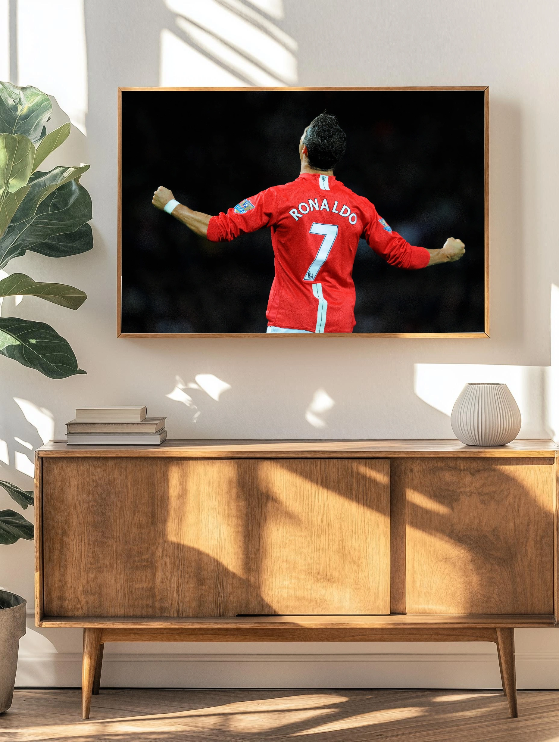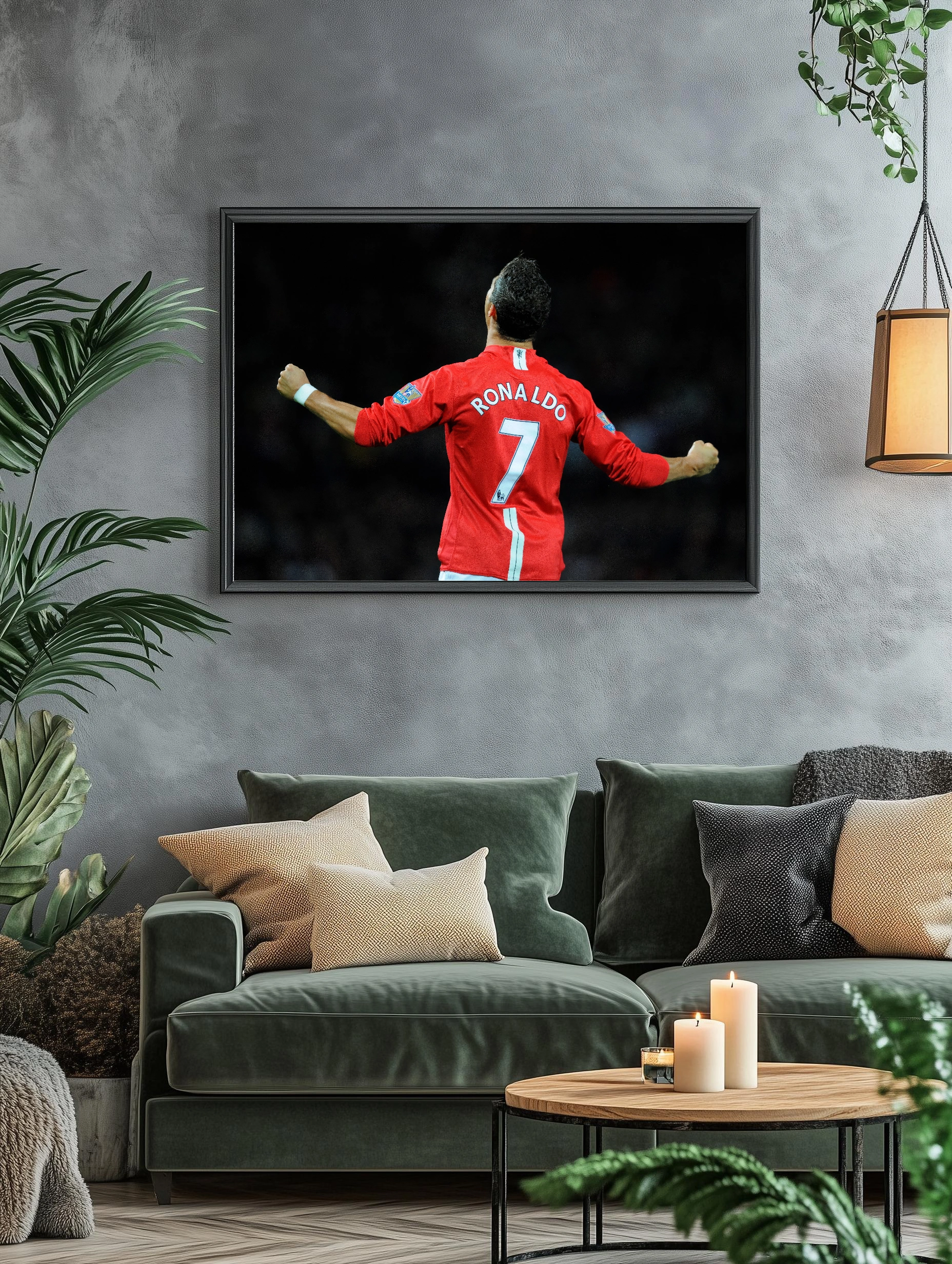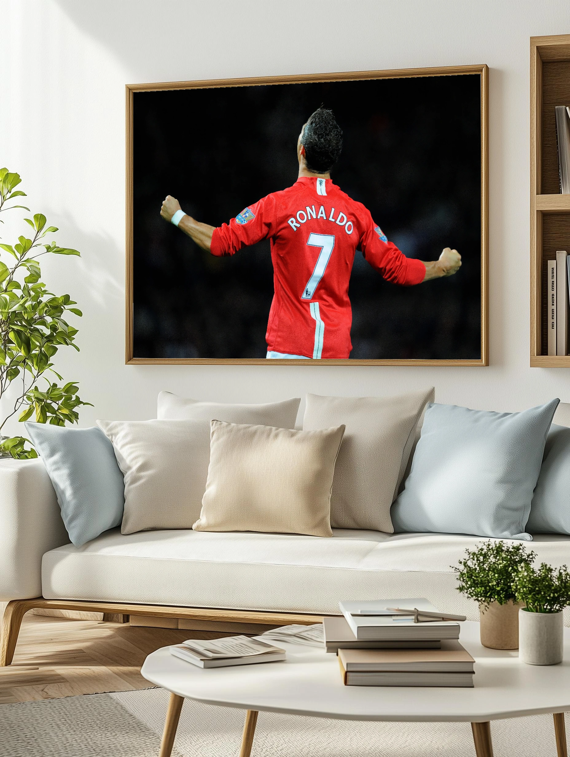 Изображён легендарный футболист Криштиану Роналдо в красной игровой форме команды Манчестер Юнайтед с номером 7 на спине. Фотография передаёт момент торжества и динамичности футбольного матча, создавая энергичное и вдохновляющее настроение. Отличный интерьерный декор для поклонников футбола и спортивного искусства.