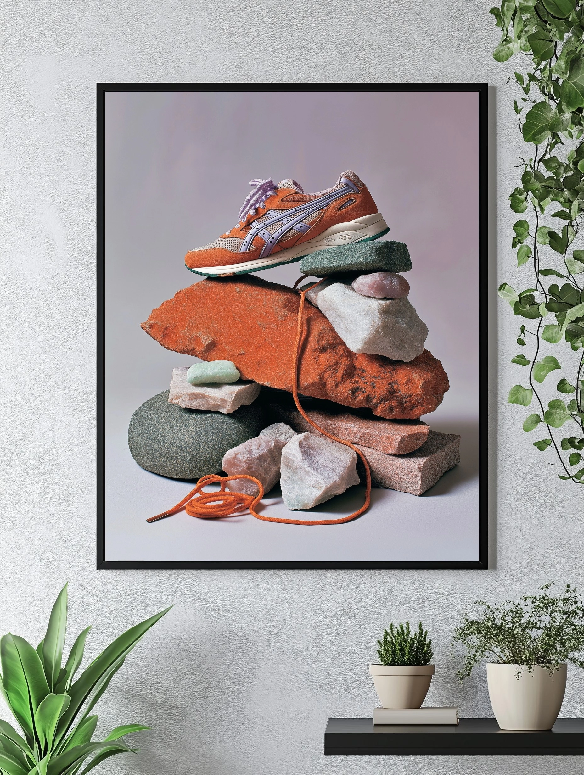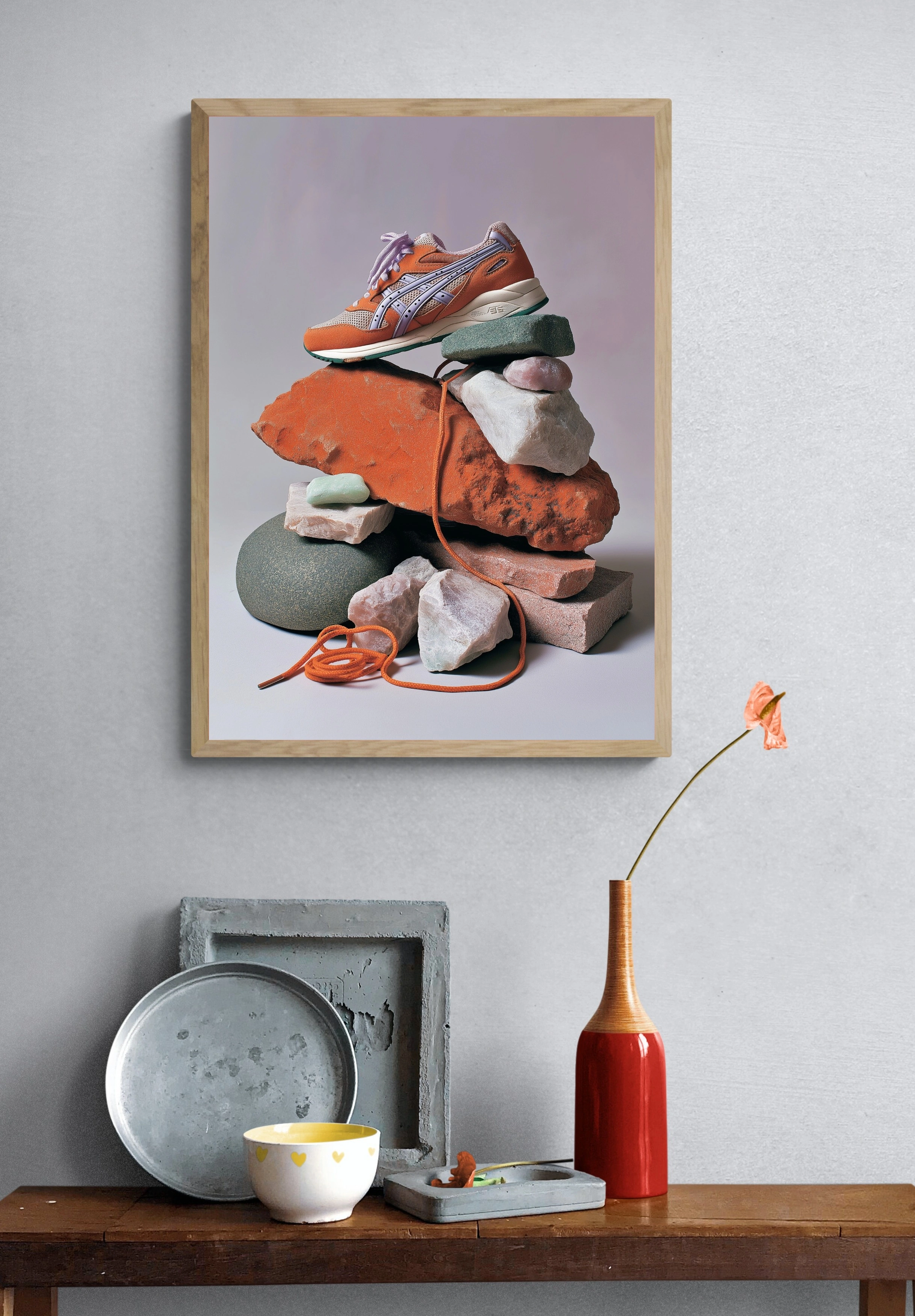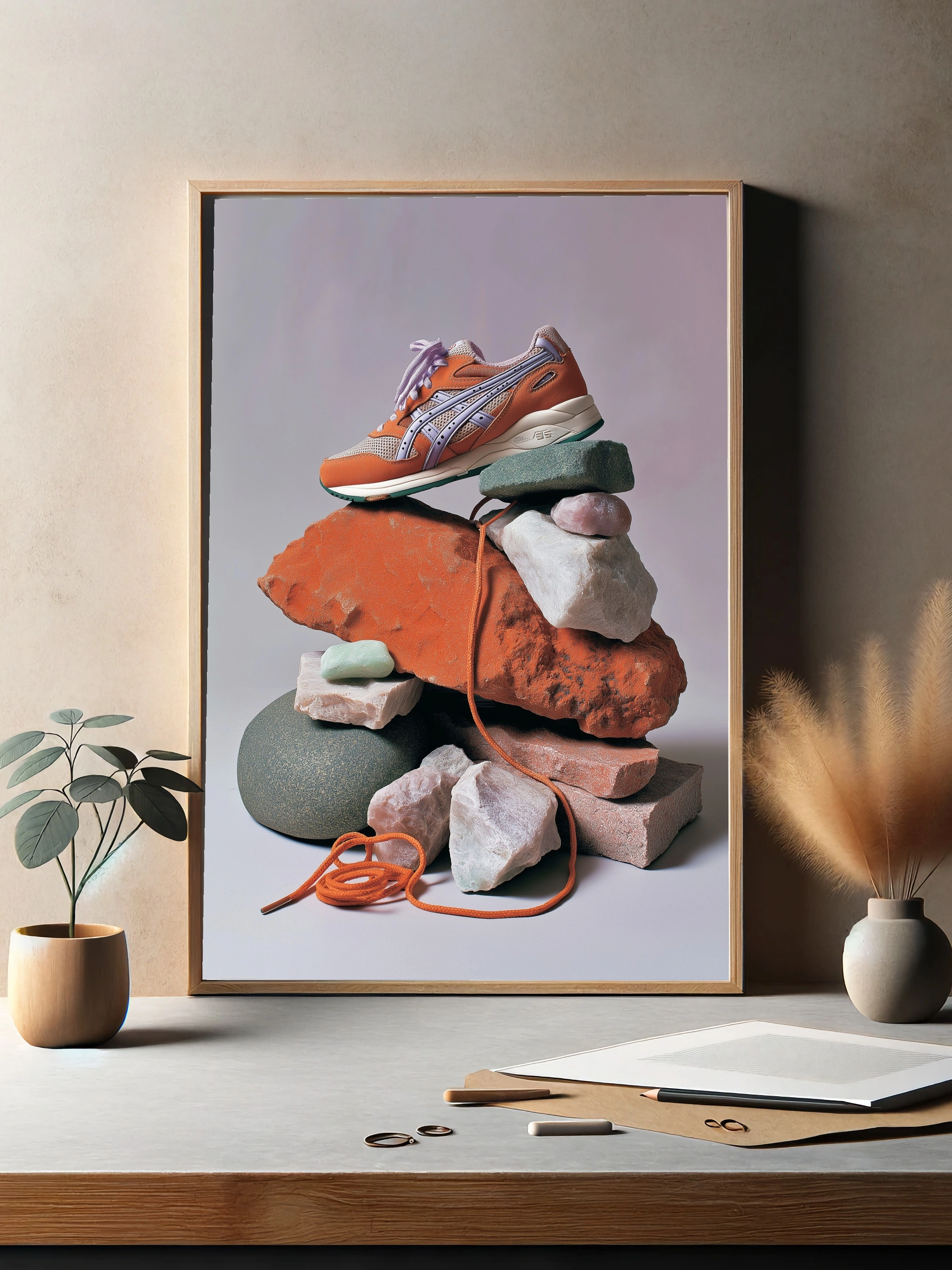 Этот постер представляет собой уникальную композицию, в центре которой находятся стильные кроссовки яркого оранжевого цвета с фиолетовыми акцентами. Они аккуратно расположены на груде камней и кирпичей, создавая эффект динамики и современности. Разнообразие текстур и форм камней, от гладких до грубых, подчеркивает уникальность обуви. Цветовая палитра включает оранжевый, фиолетовый и серый, что создает контраст и привлекает внимание. Стиль изображения можно охарактеризовать как современный и минималистичный, с акцентом на детали. Этот постер идеально подойдет для молодежных пространств, таких как гостиные или креативные офисы, и привлечет внимание активной аудитории, ценящей стиль и оригинальность.