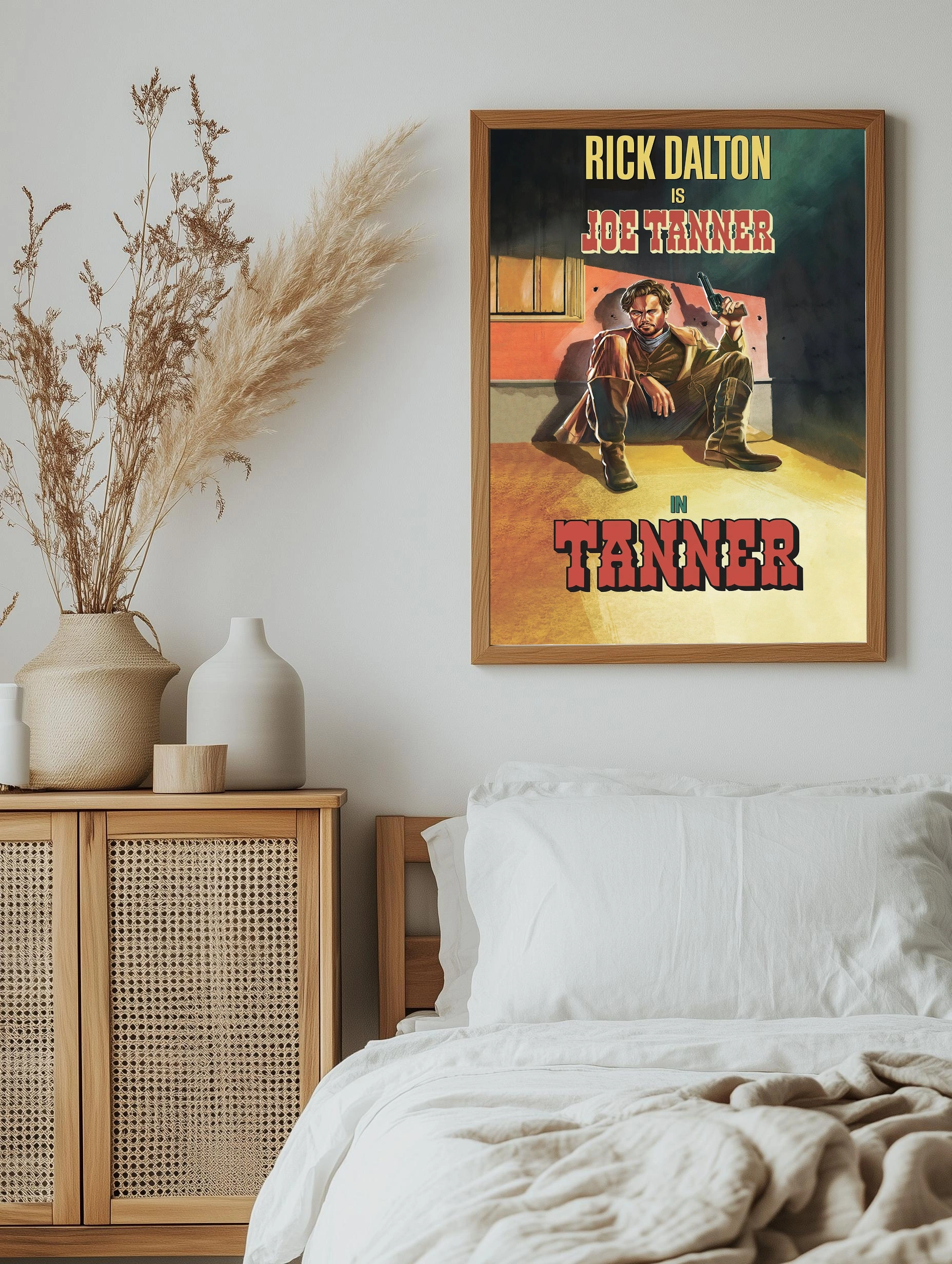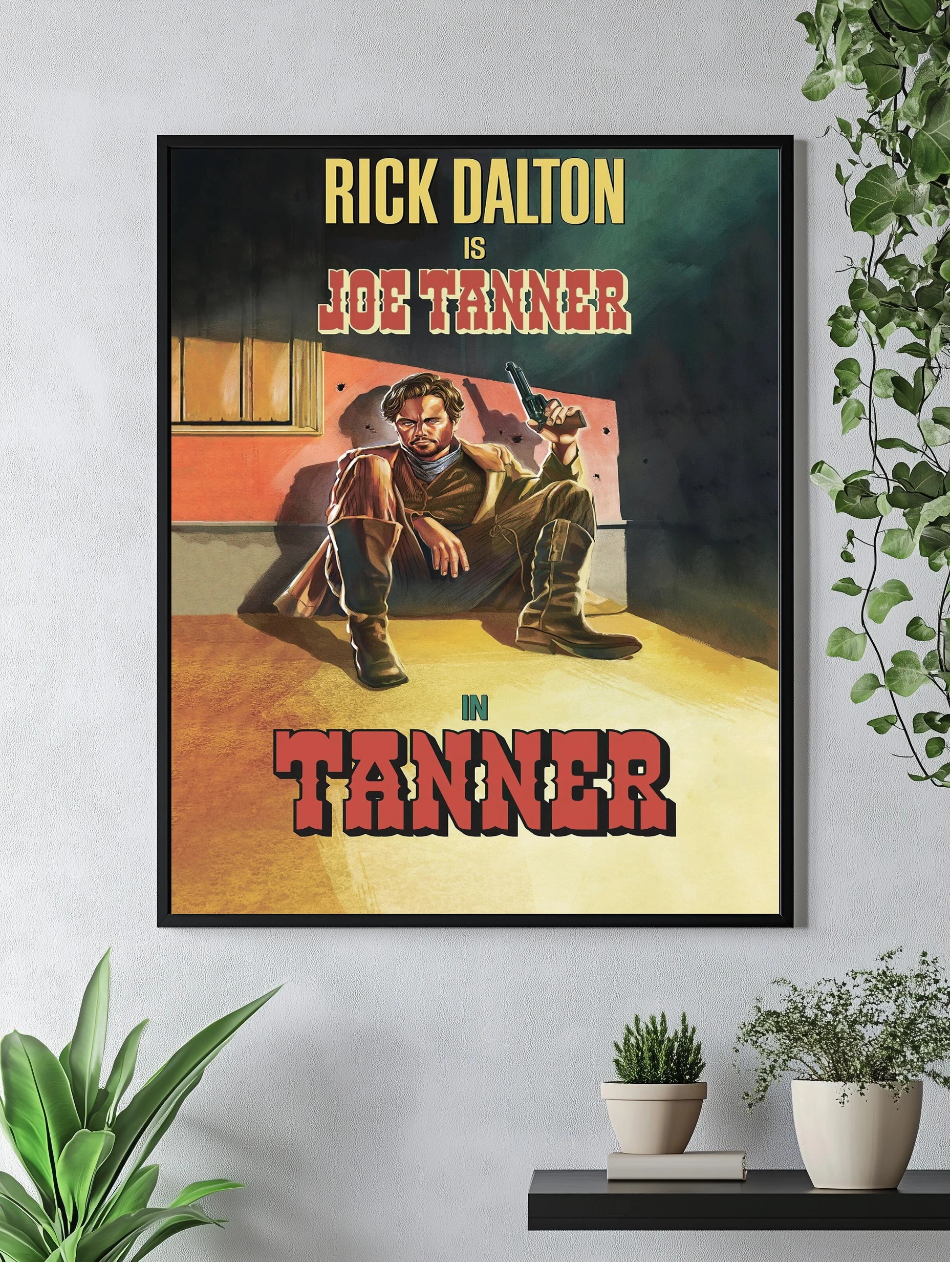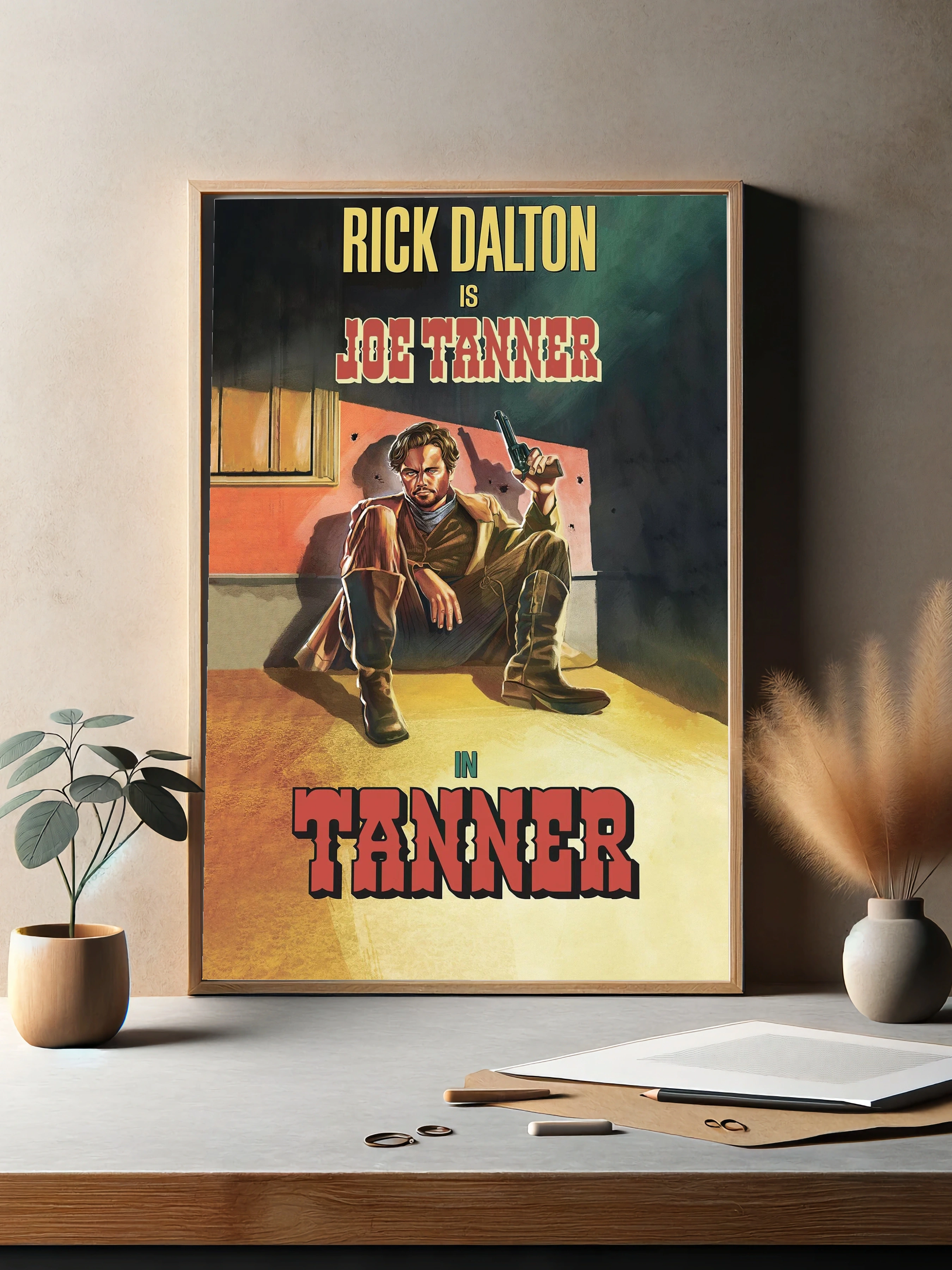 На изображении представлен Rick Dalton в образе Joe Tanner — персонажа в жанре вестерн. Он сидит, одет в классический ковбойский костюм, держит револьвер, а фон выполнен в теплых желтых и коричневых тонах с затемнёнными зелёными и серыми оттенками. Стильно оформленная картина для гостиной или офиса, создающая атмосферу дикого запада и ретро кино, подходит как интерьерное искусство и декоративный плакат.