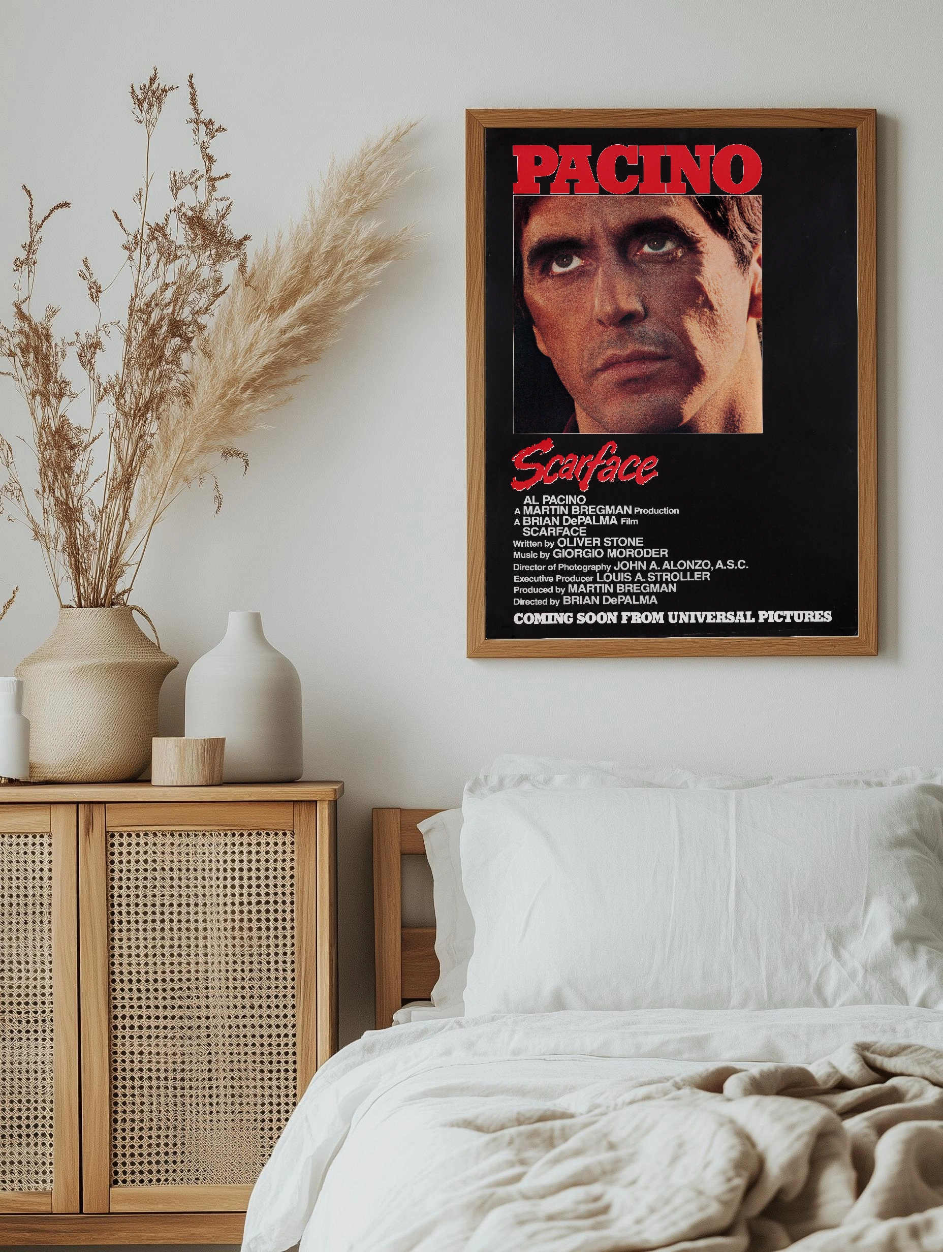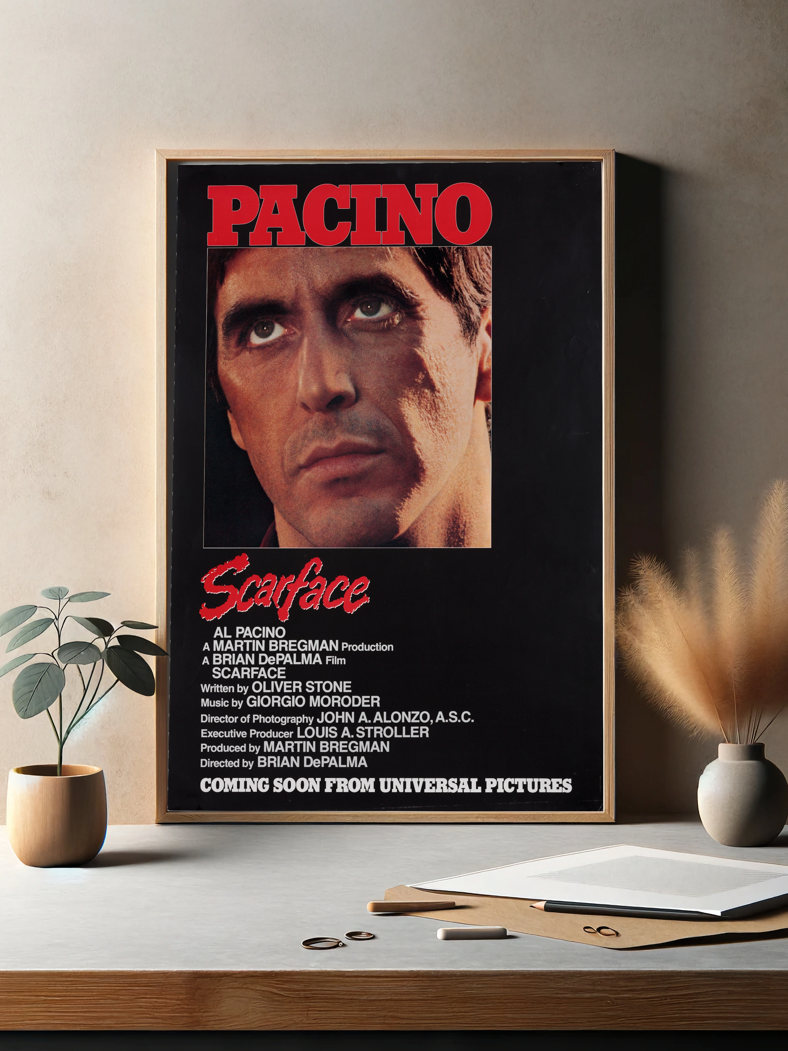Красочный интерьерный постер с изображением культового актера Аль Пачино в роли Тони Монтаны из фильма «Лицо со шрамом». Яркие контрасты красного и черного создают мощное визуальное впечатление. Идеален как декоративная картина для гостиной или офиса, добавит фильмового шарма и современного искусства для стен.