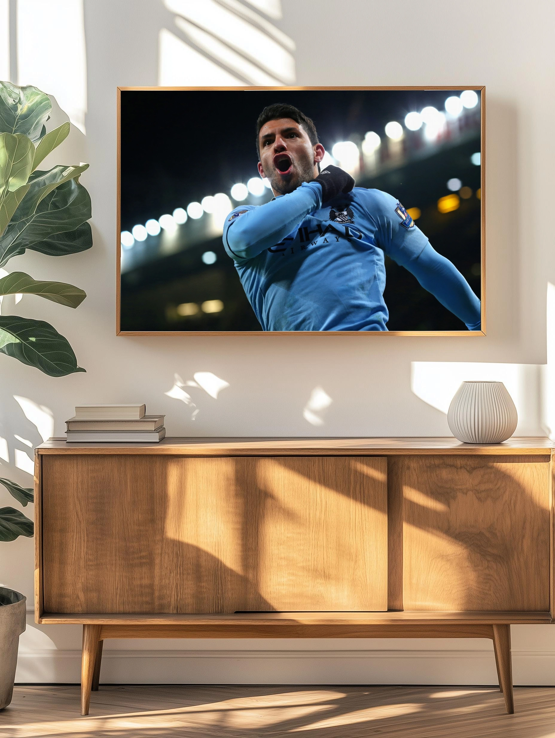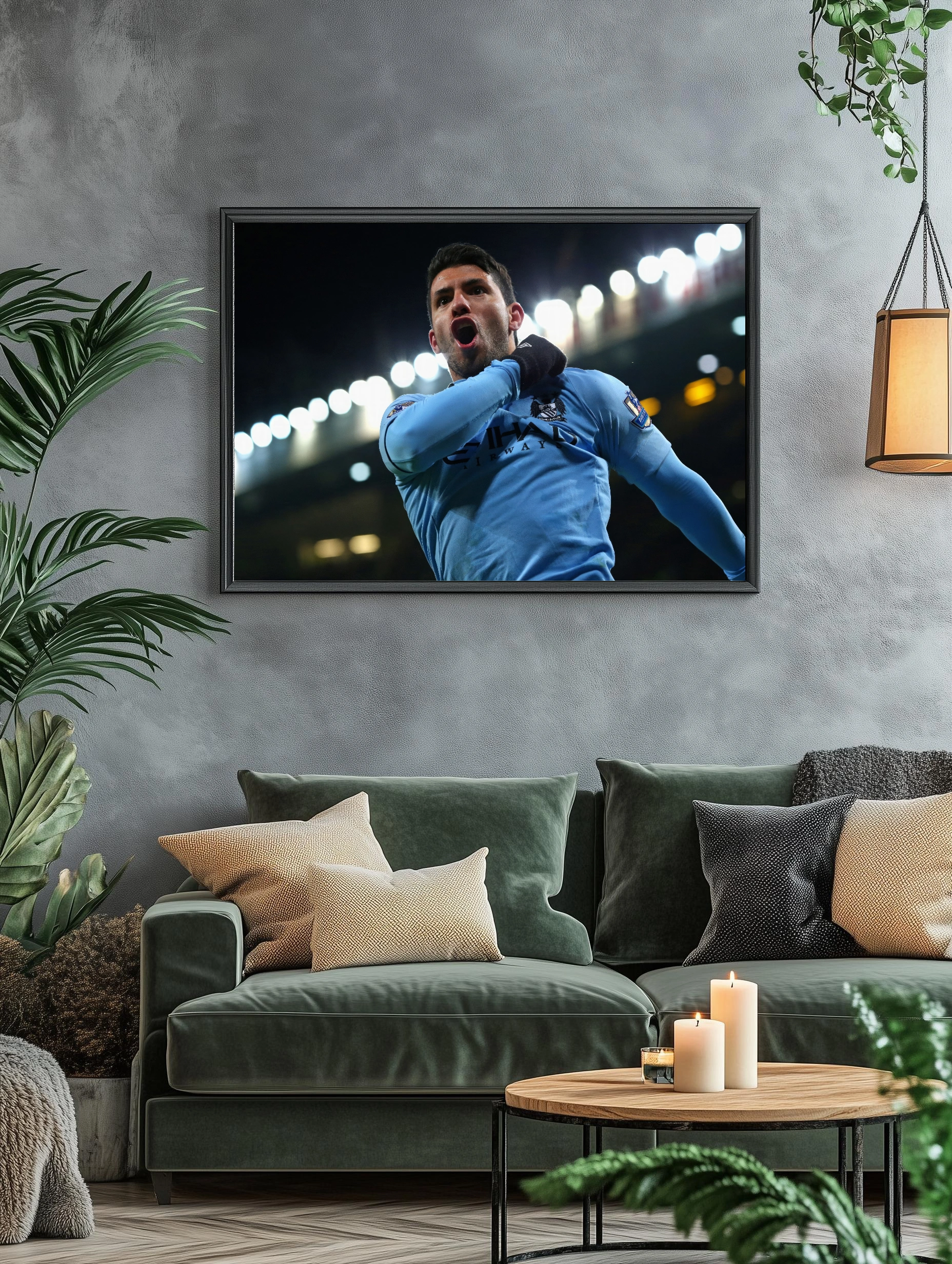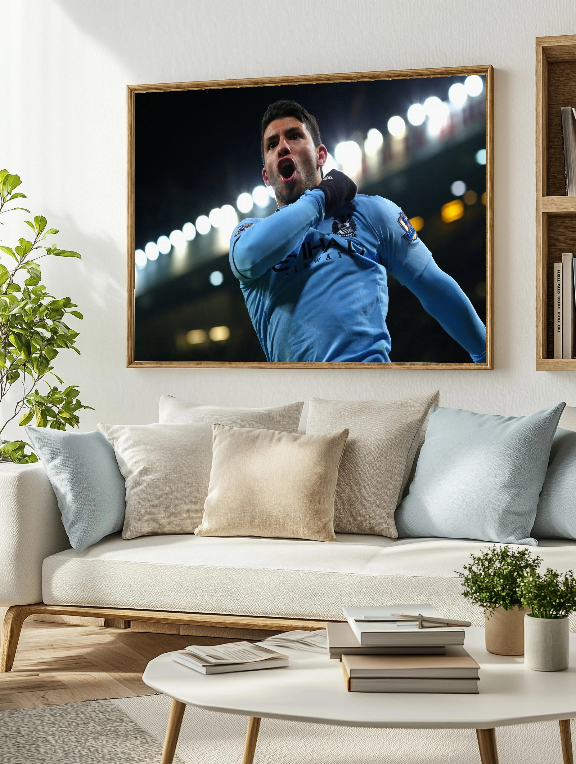 Изображение динамичного момента с футболистом в голубой игровой форме Манчестер Сити, выражающим эмоции во время матча. Фон размыт, выделены яркие огни стадиона, создающие атмосферу энергичной ночной игры. Это художественный фотопостер, отлично подходящий для спортивных интерьеров, спортивных залов и современных гостинных.