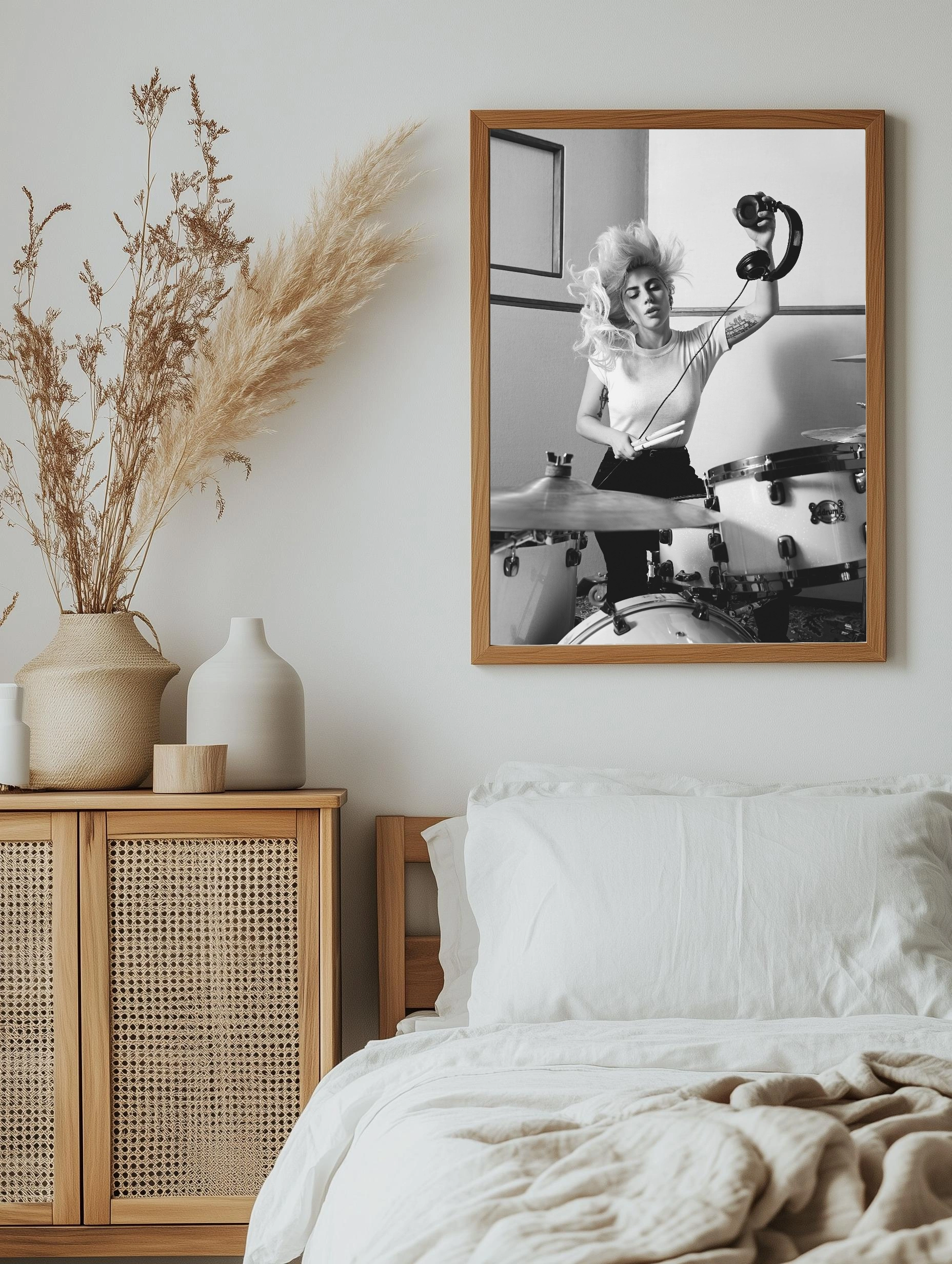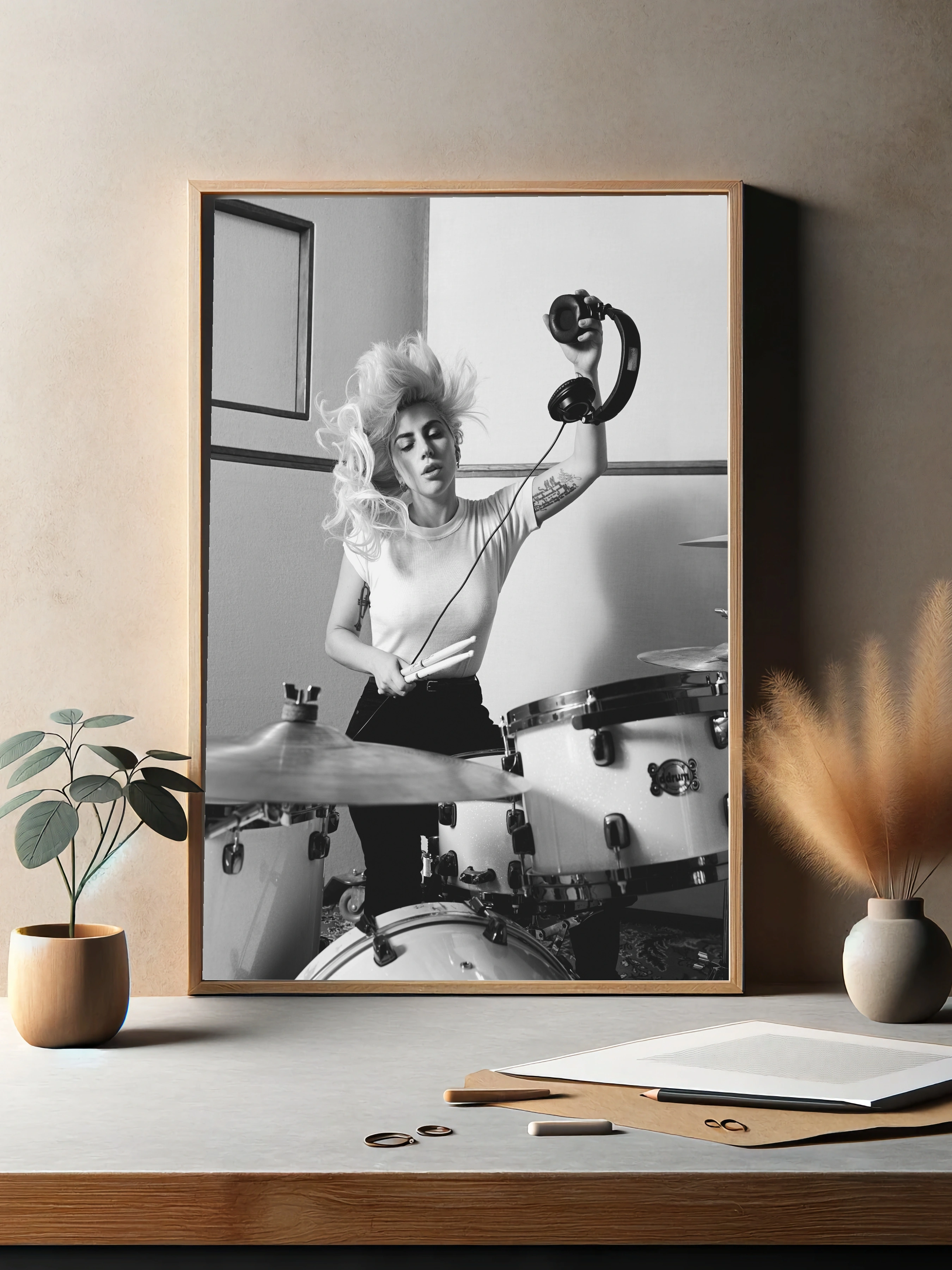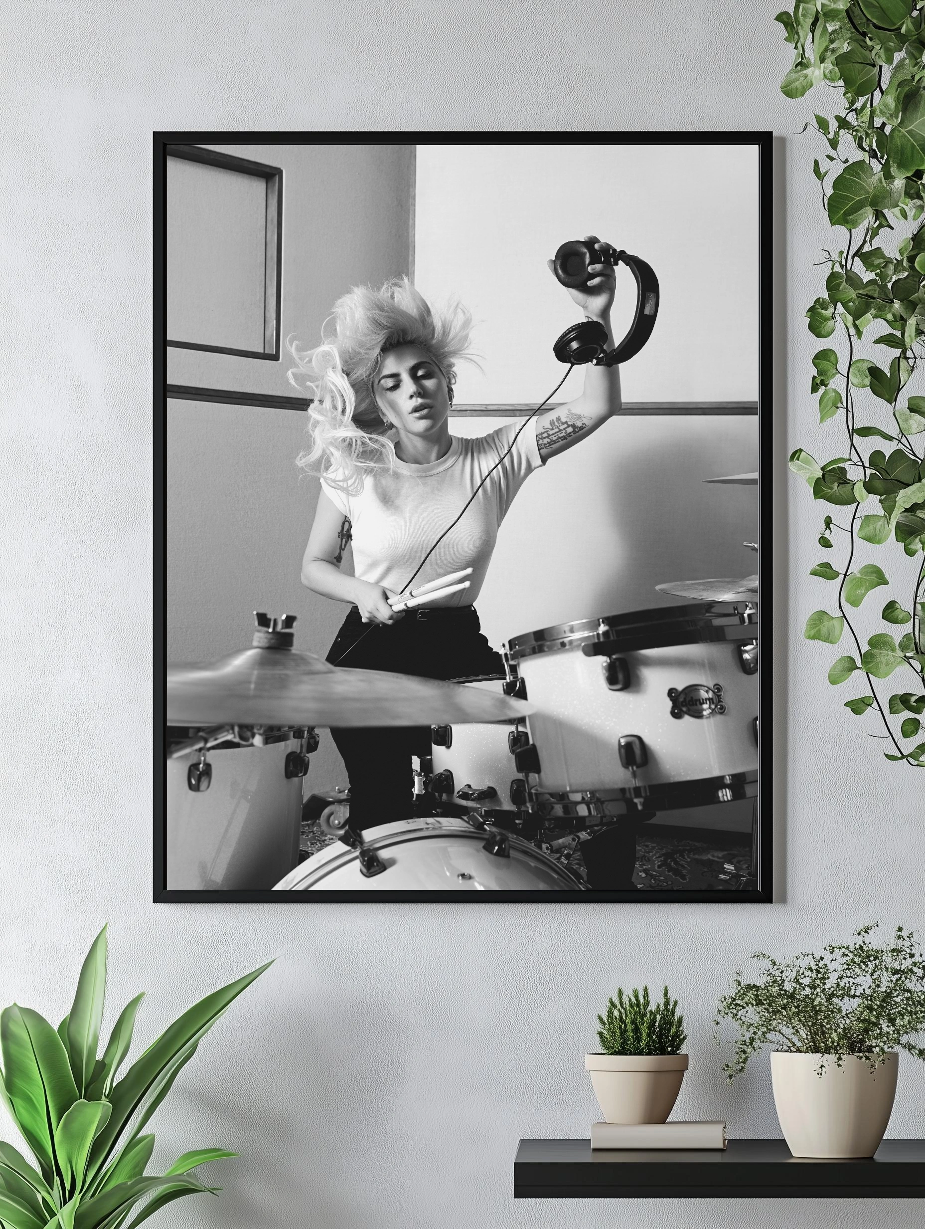 Черно-белое изображение показывает молодую женщину с яркими светлыми волосами, играющую на ударной установке. Она держит барабанные палочки и поднимает наушники, погруженная в процесс музыки. Минималистичный интерьер и выразительная поза создают чувство драйва и свободы. Этот интерьерный арт для стен идеально подходит для поклонников музыки и современного искусства.