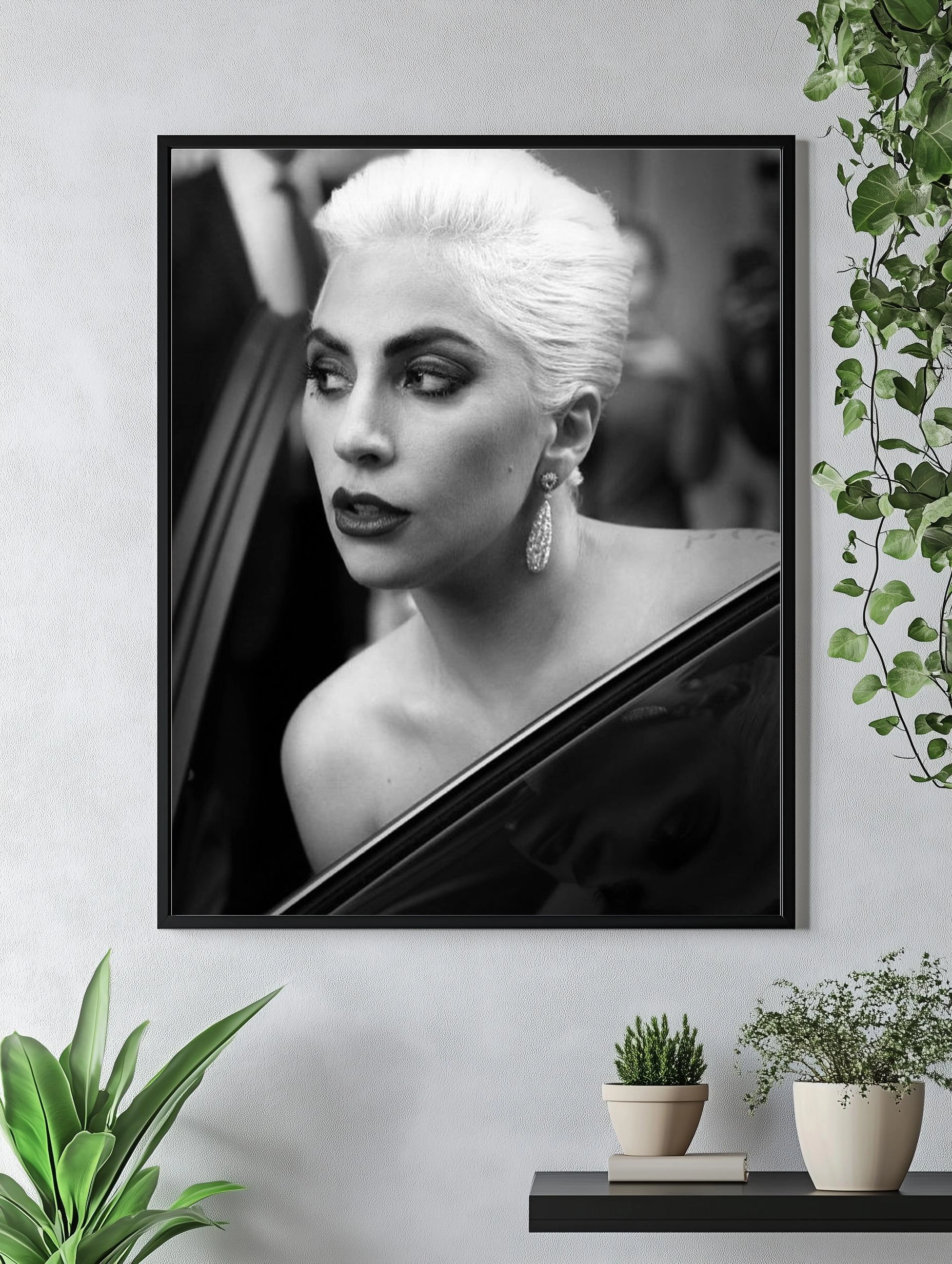 Чёрно-белая фотография знаменитой женщины с белыми волосами, крупный план лица с выразительным макияжем и блестящими серьгами. Элегантность и гламур сочетаются в стильной интерьерной картине для гостиной или спальни, создавая атмосферу классического черно-белого художественного плаката.