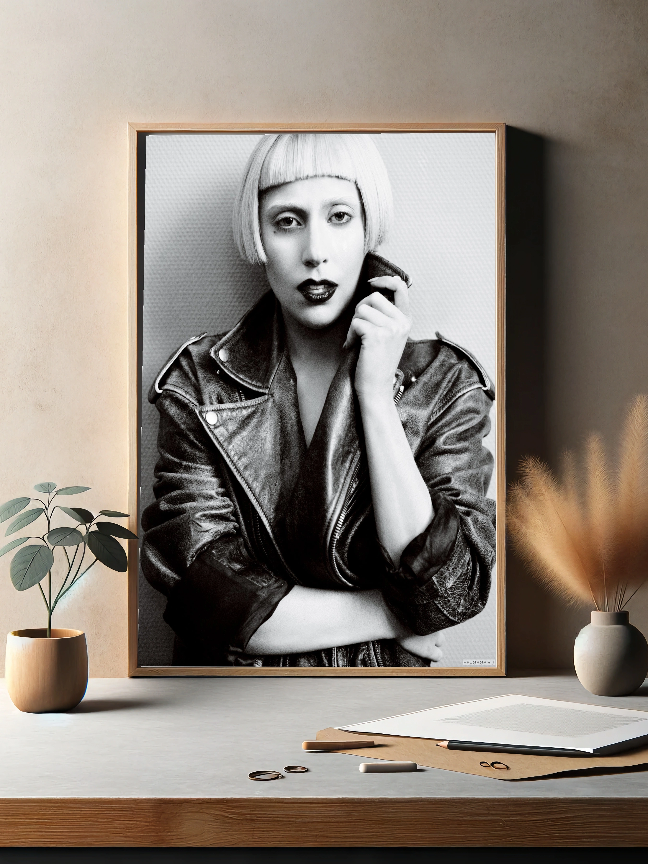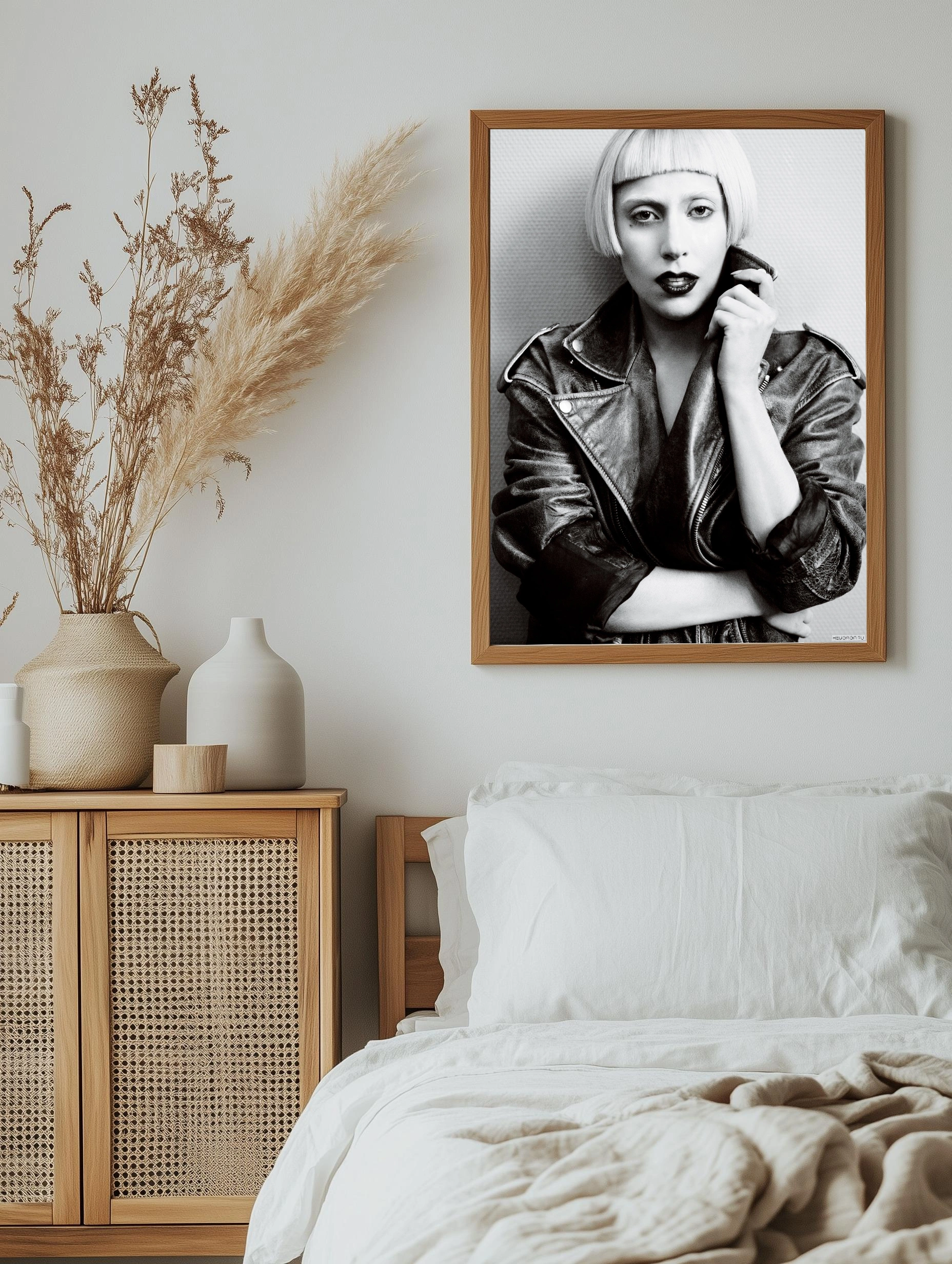 На изображении представлен черно-белый художественный портрет женщины с короткой стрижкой и темной помадой на губах. Она одета в кожаную куртку и позирует в задумчивой манере, создавая атмосферу загадочности и современного стиля. Этот интерьерный постер идеально подойдет для оформления гостиной, спальни или офиса, добавляя элегантности и выразительности в любой уголок пространства.